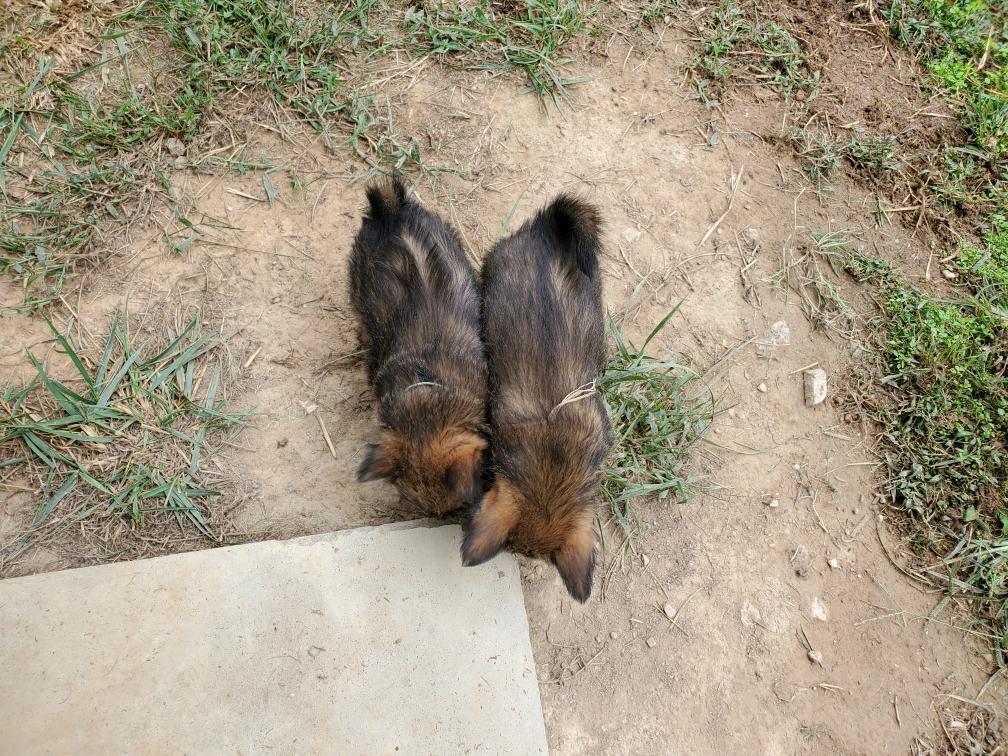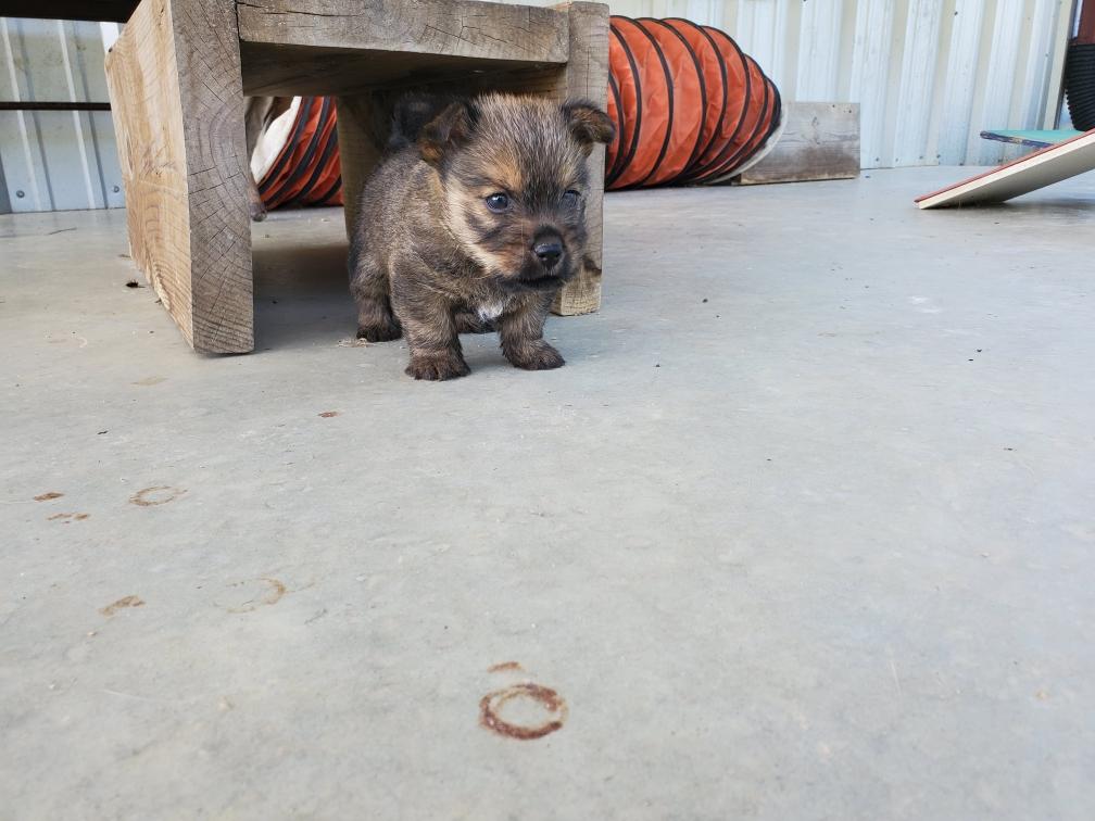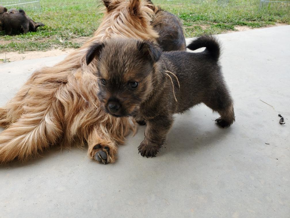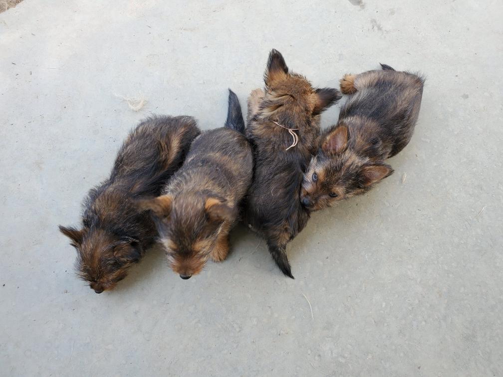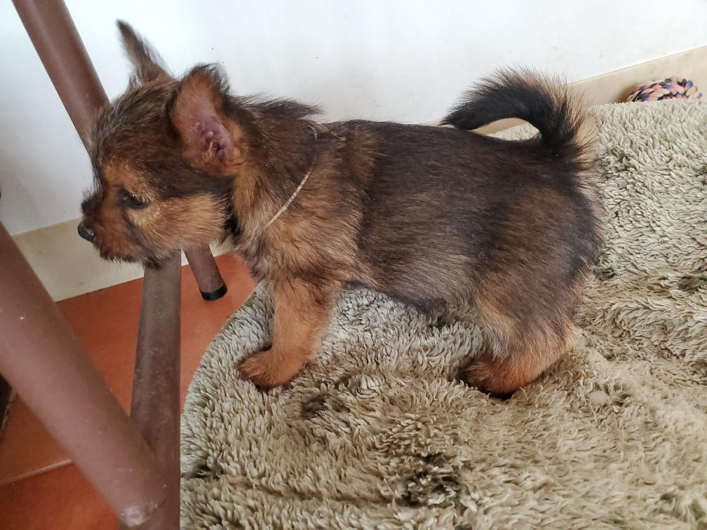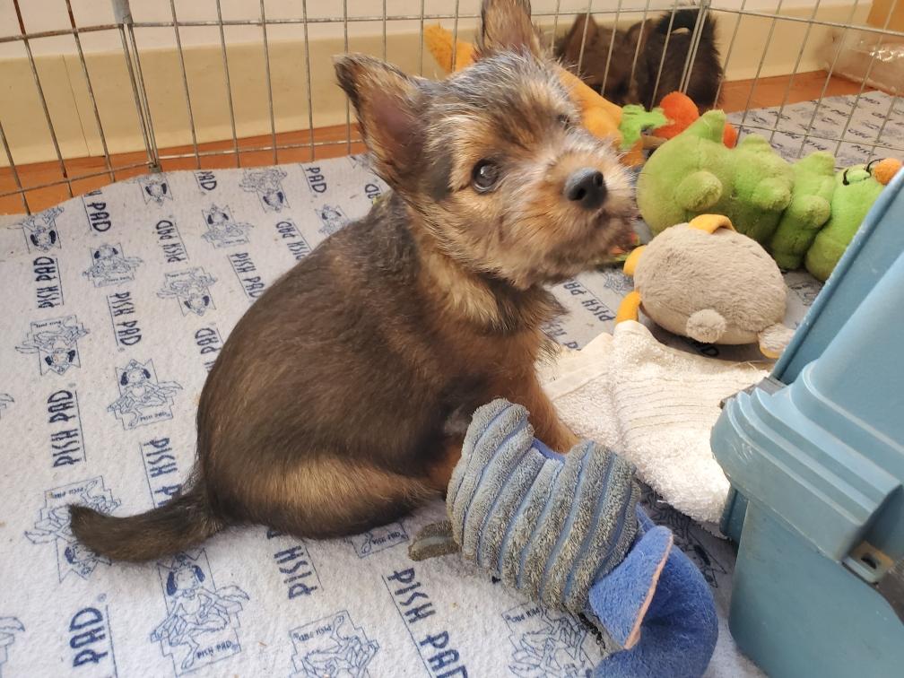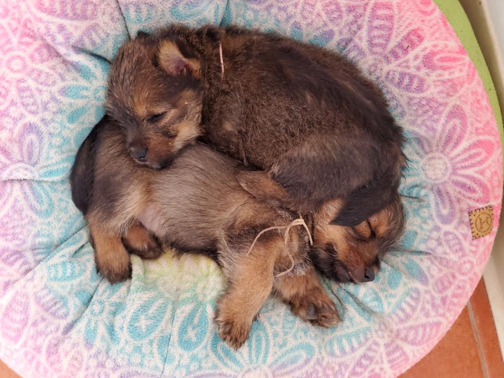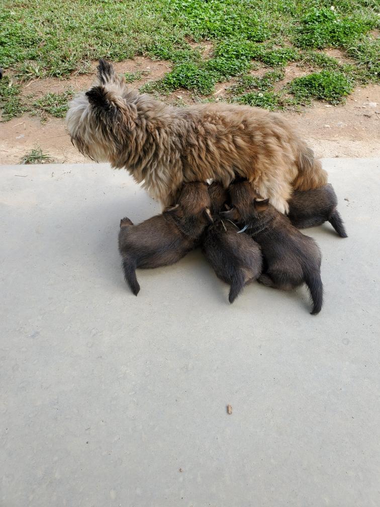 Polly is a "fluffy" Norwich. This means that Polly has two copies of the (recessive) long coat allele that makes a long (and soft) coat. So Polly does not look like a typical Norwich, either in terms of the feel of her coat or its color. In the picture, Polly is shaved down. Gunner does not carry the fluffy allele, so any puppies from a Gunner x Polly breeding will have a normal Norwich coat.