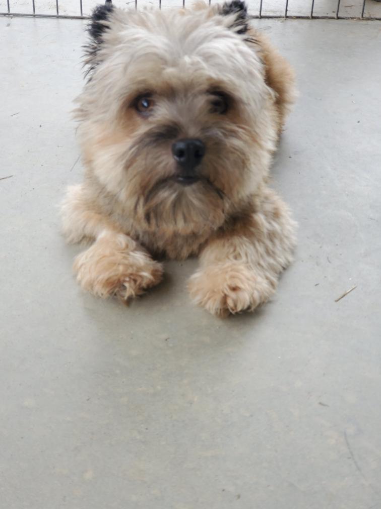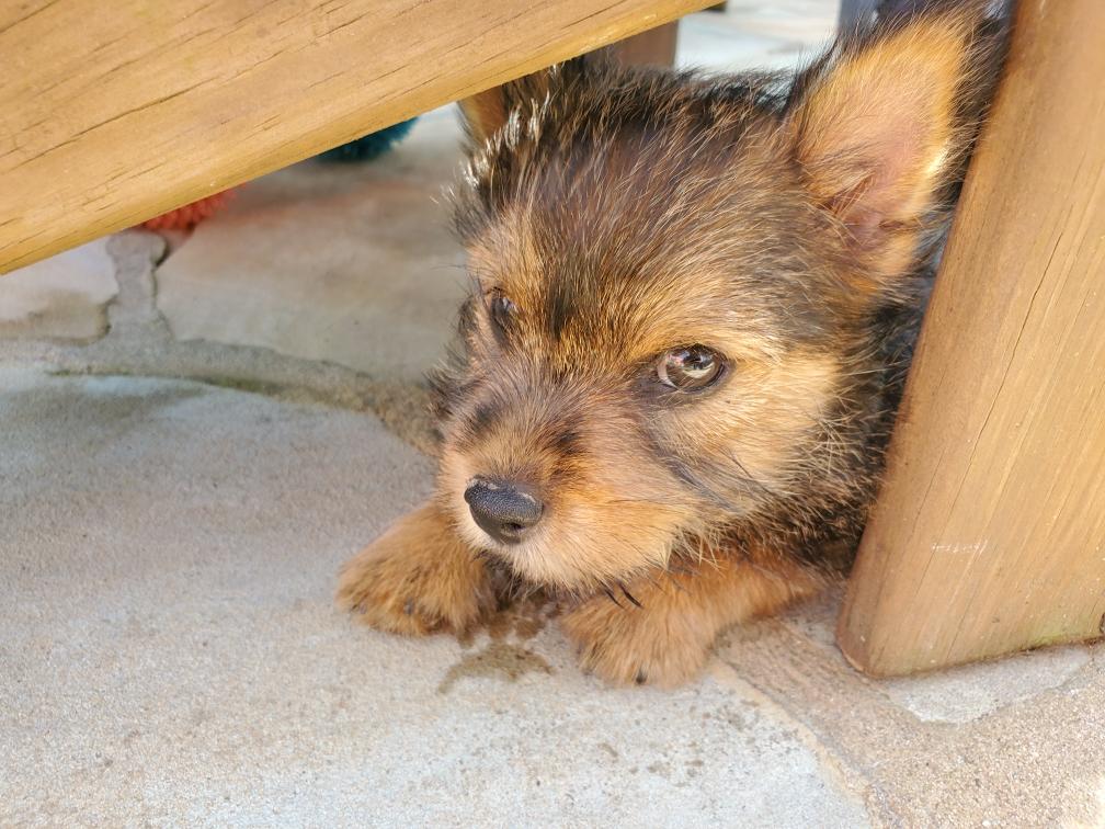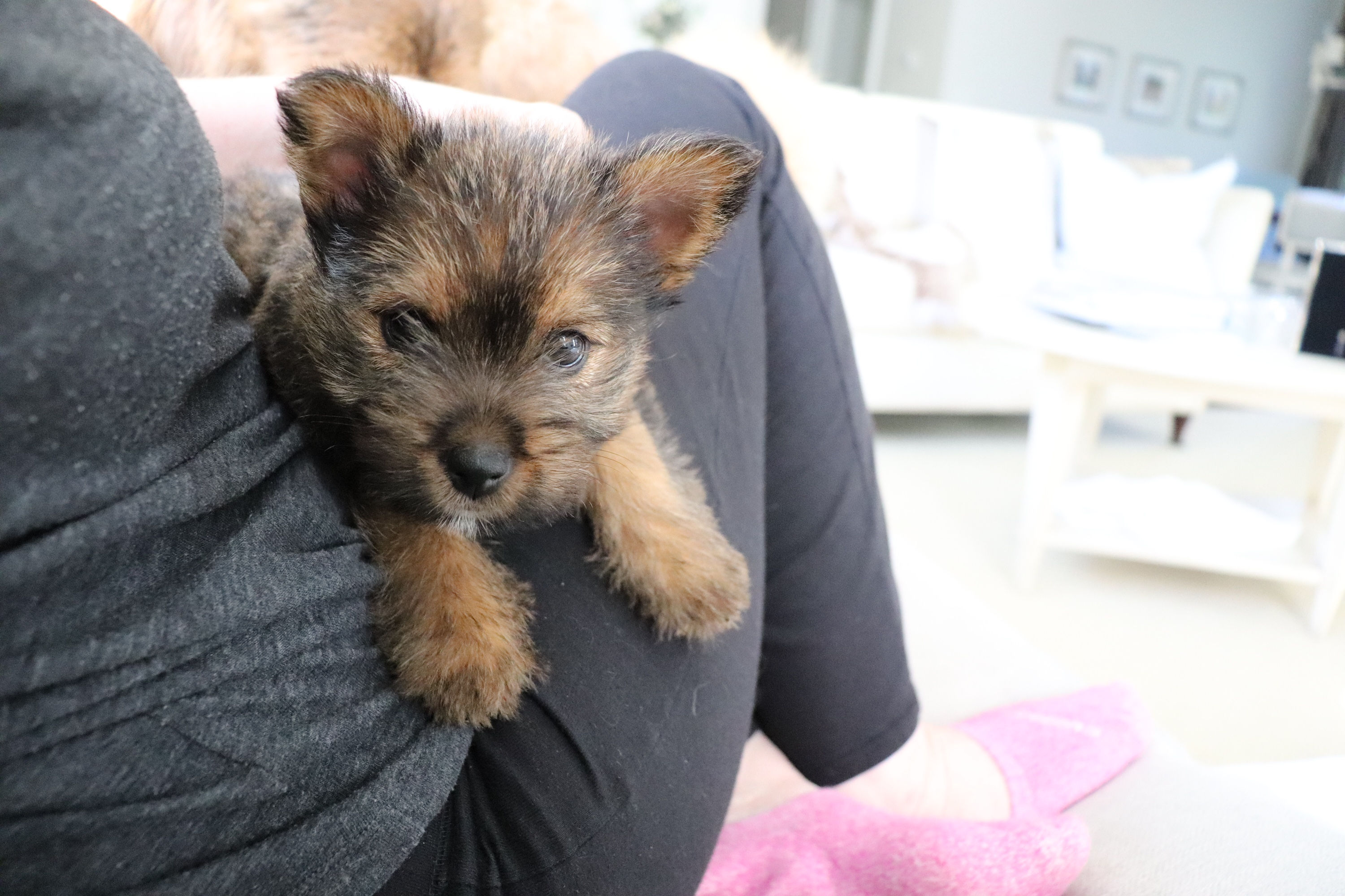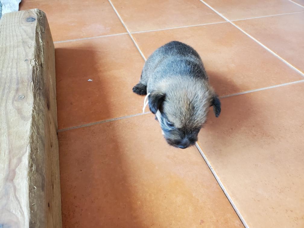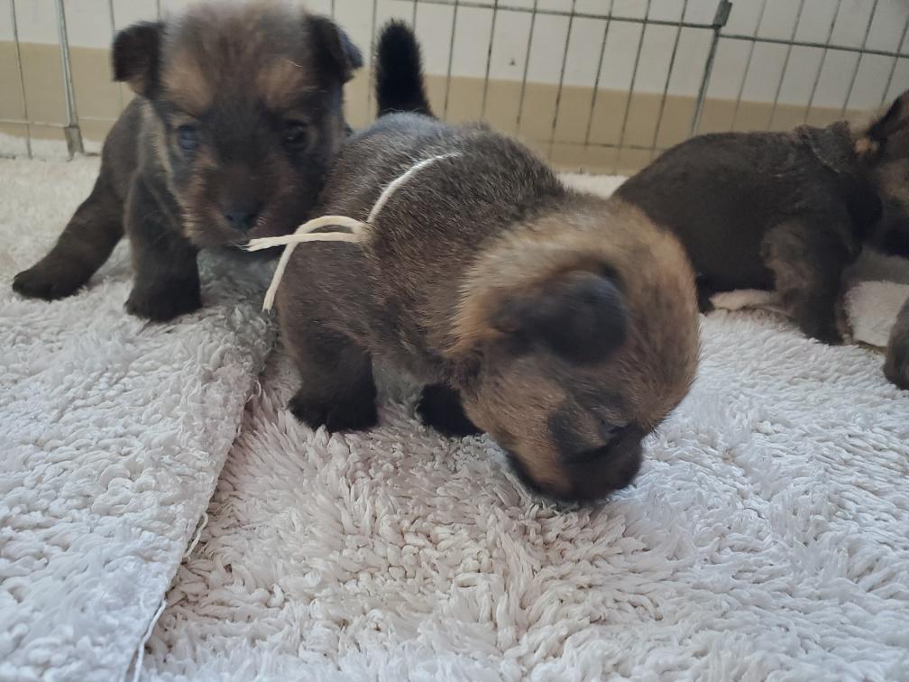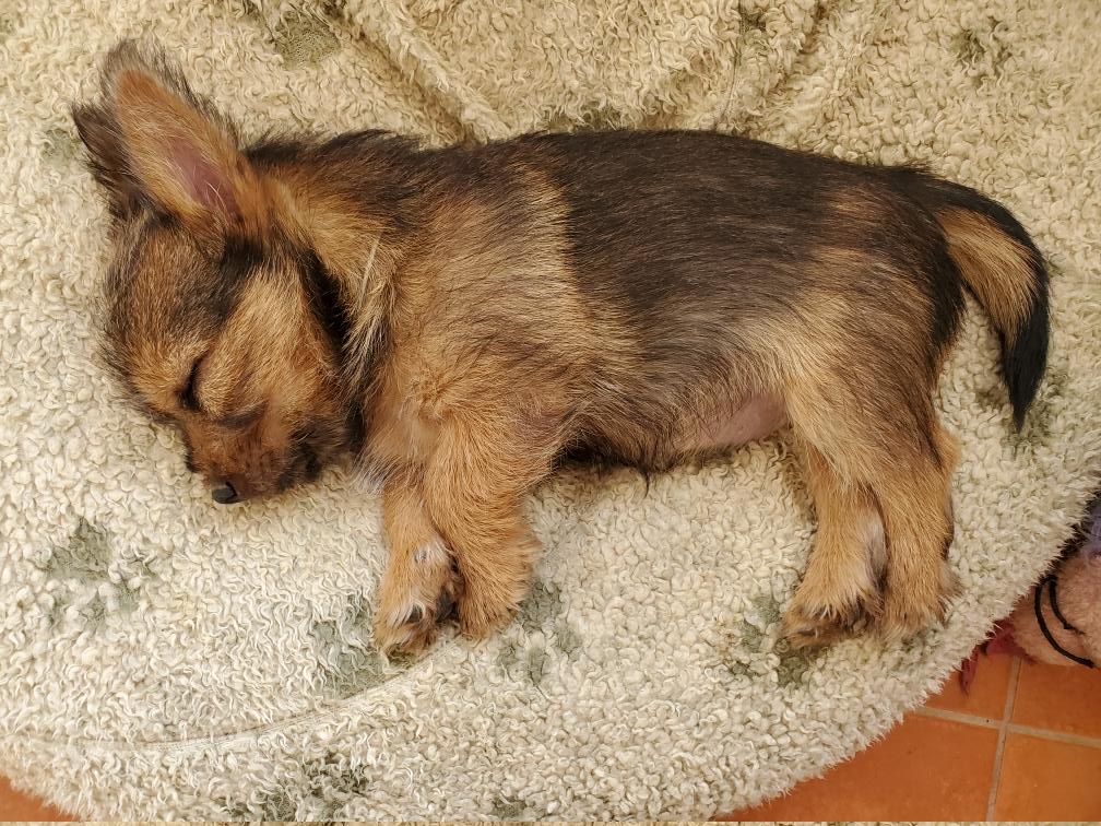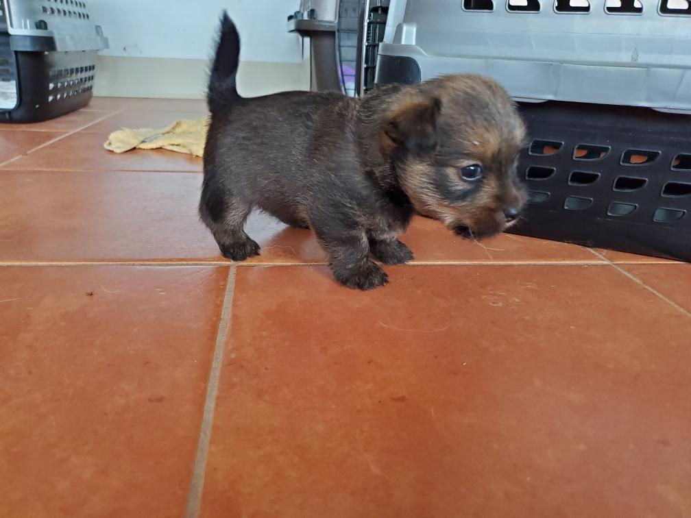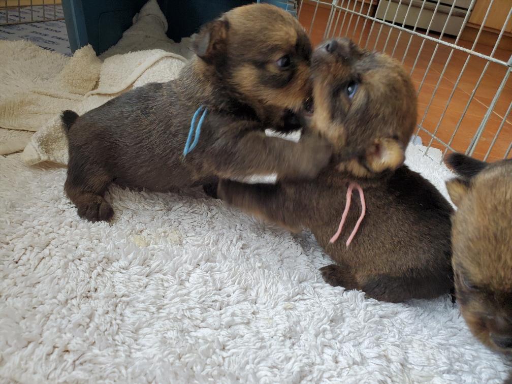 Polly is a "fluffy" Norwich. This means that Polly has two copies of the (recessive) long coat allele that makes a long (and soft) coat. So Polly does not look like a typical Norwich, either in terms of the feel of her coat or its color. In the picture, Polly is shaved down. Gunner does not carry the fluffy allele, so any puppies from a Gunner x Polly breeding will have a normal Norwich coat.
