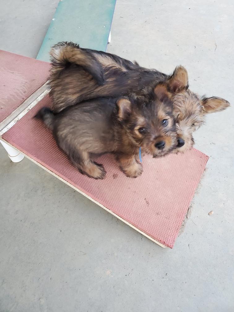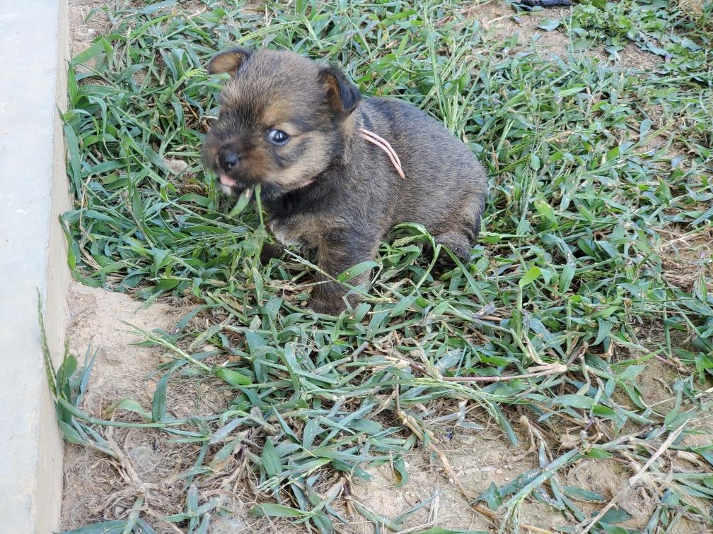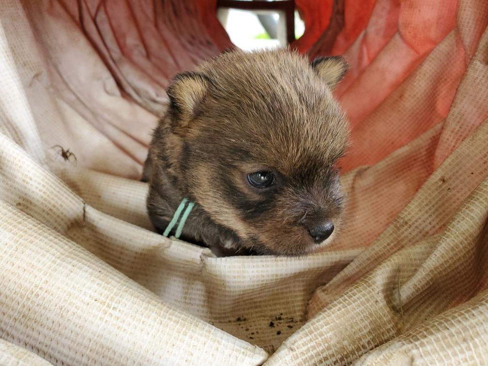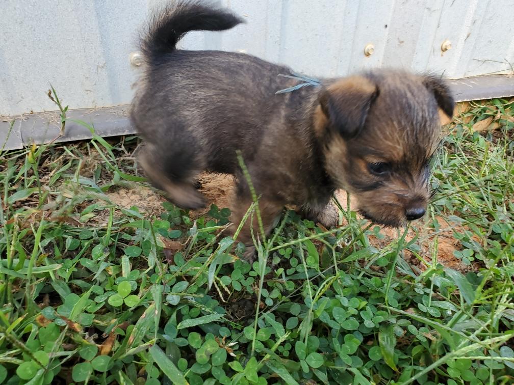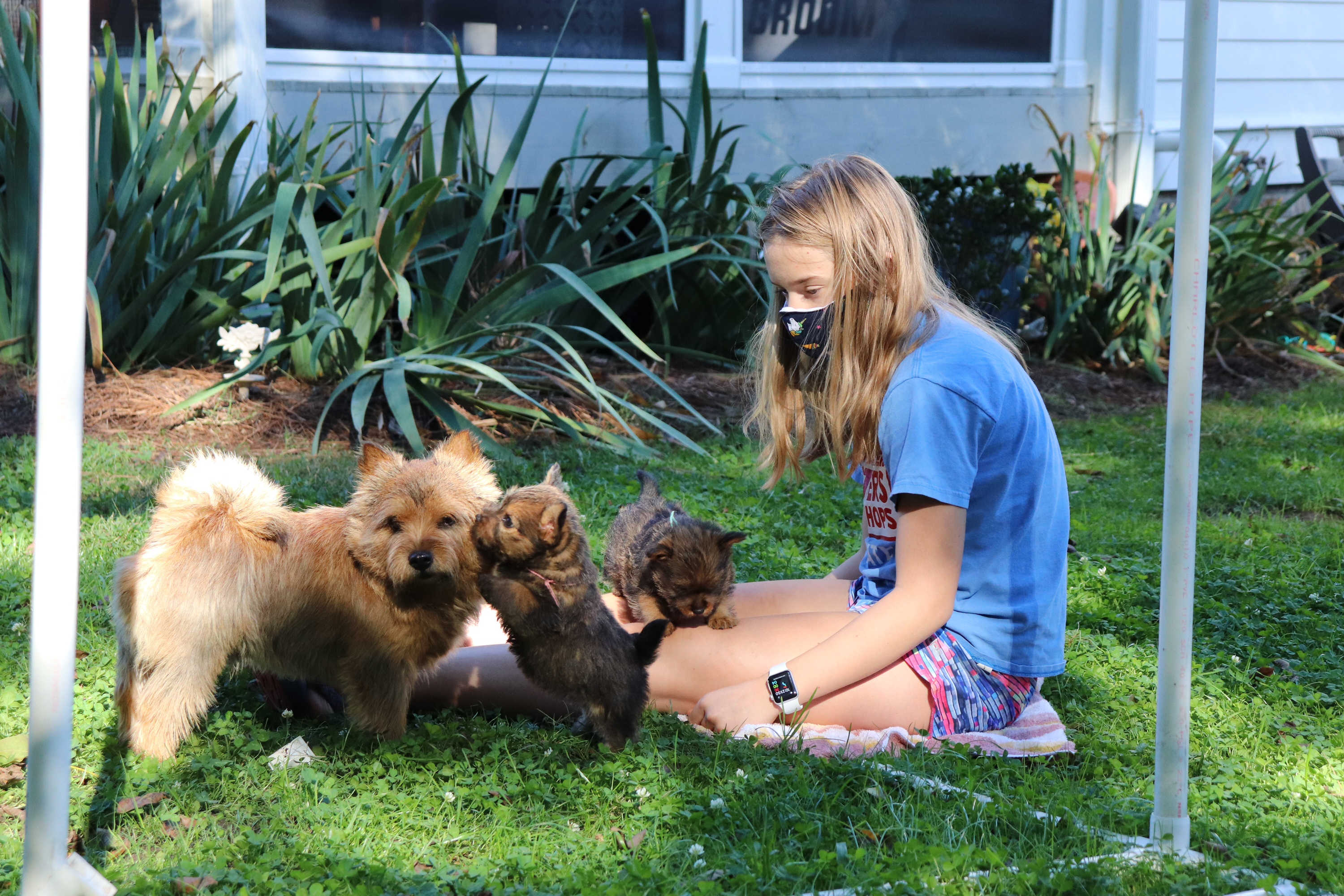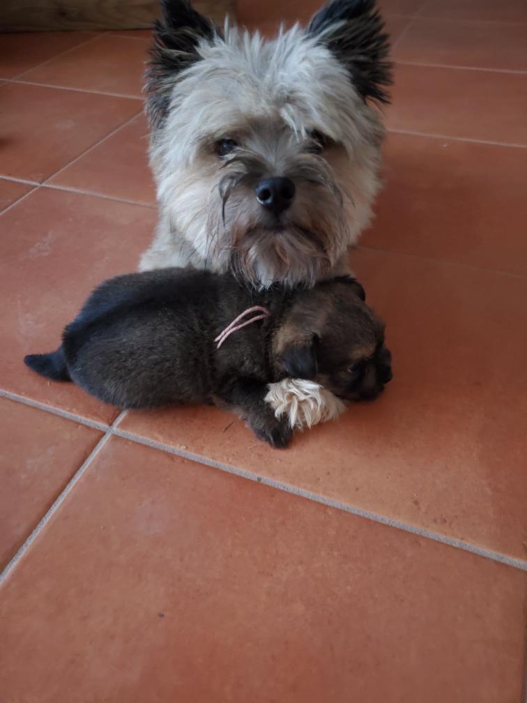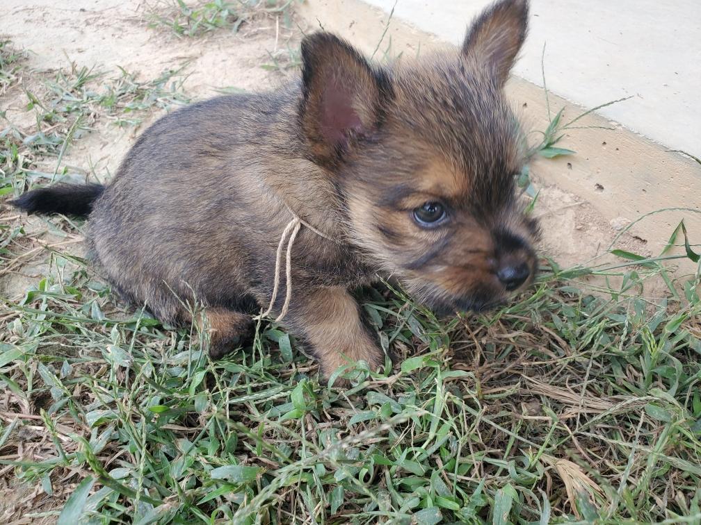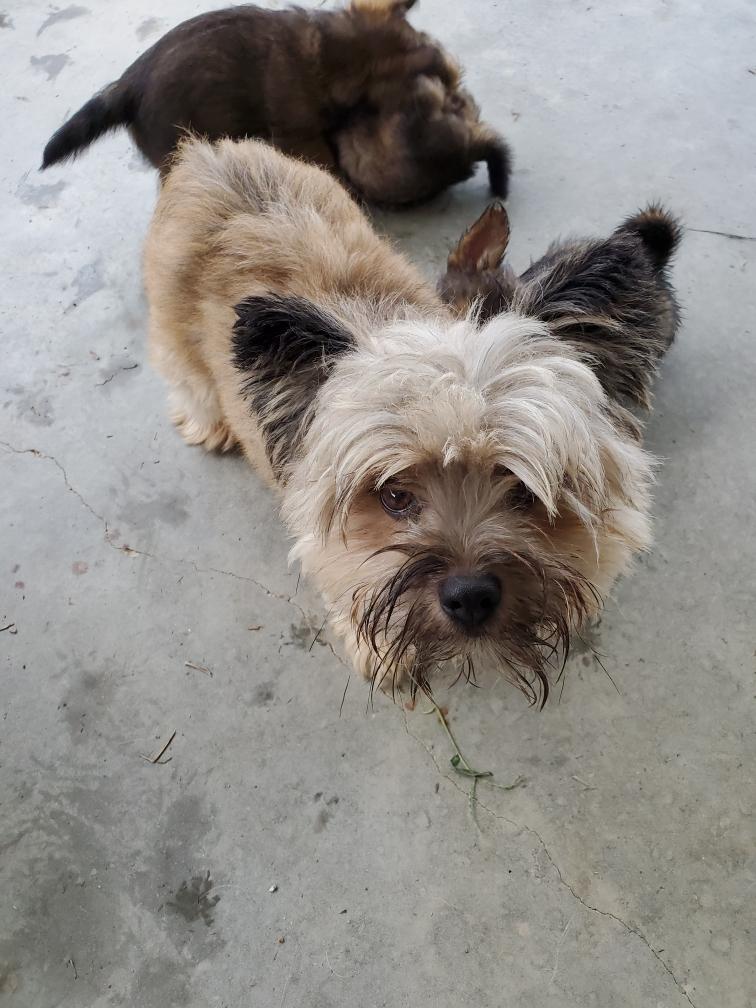 Polly is a "fluffy" Norwich. This means that Polly has two copies of the (recessive) long coat allele that makes a long (and soft) coat. So Polly does not look like a typical Norwich, either in terms of the feel of her coat or its color. In the picture, Polly is shaved down. Gunner does not carry the fluffy allele, so any puppies from a Gunner x Polly breeding will have a normal Norwich coat.