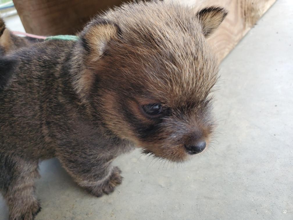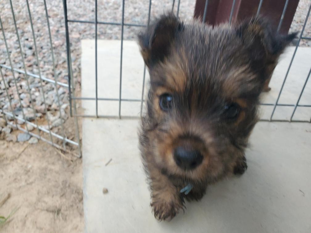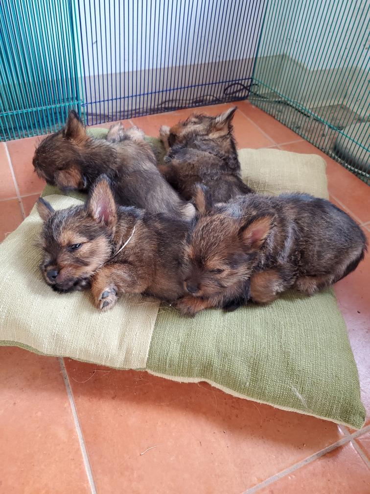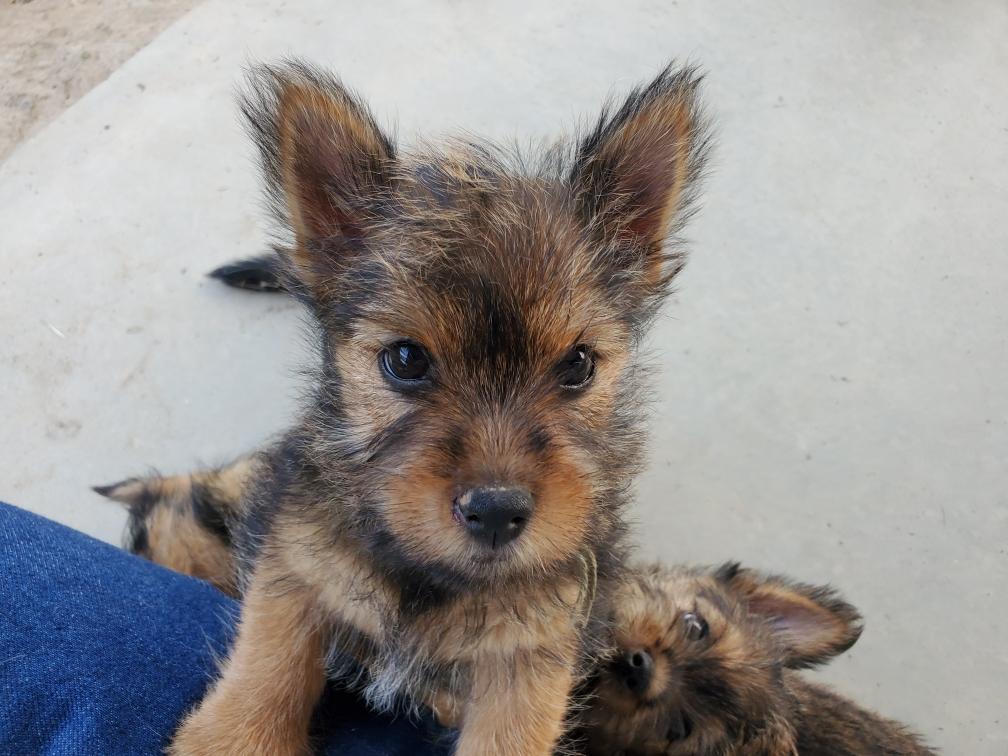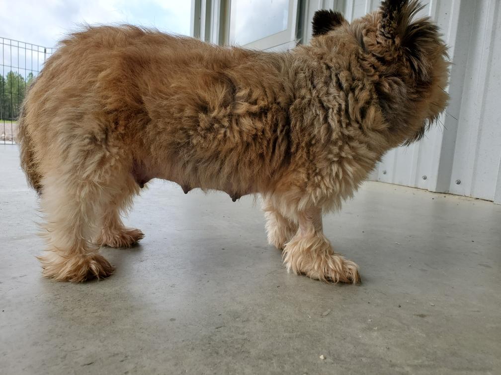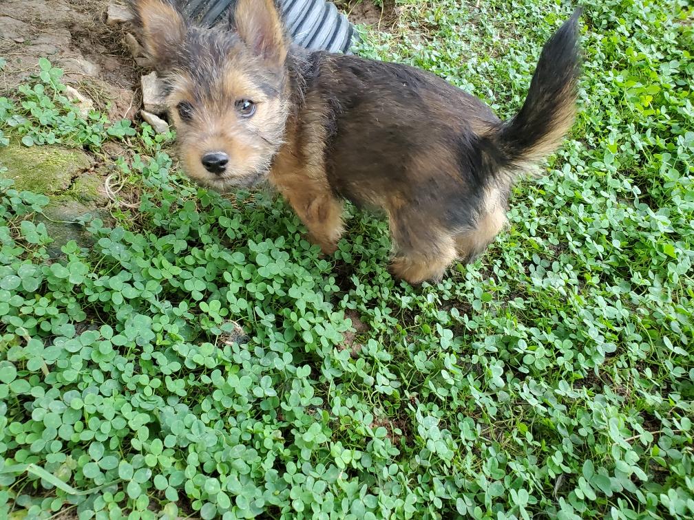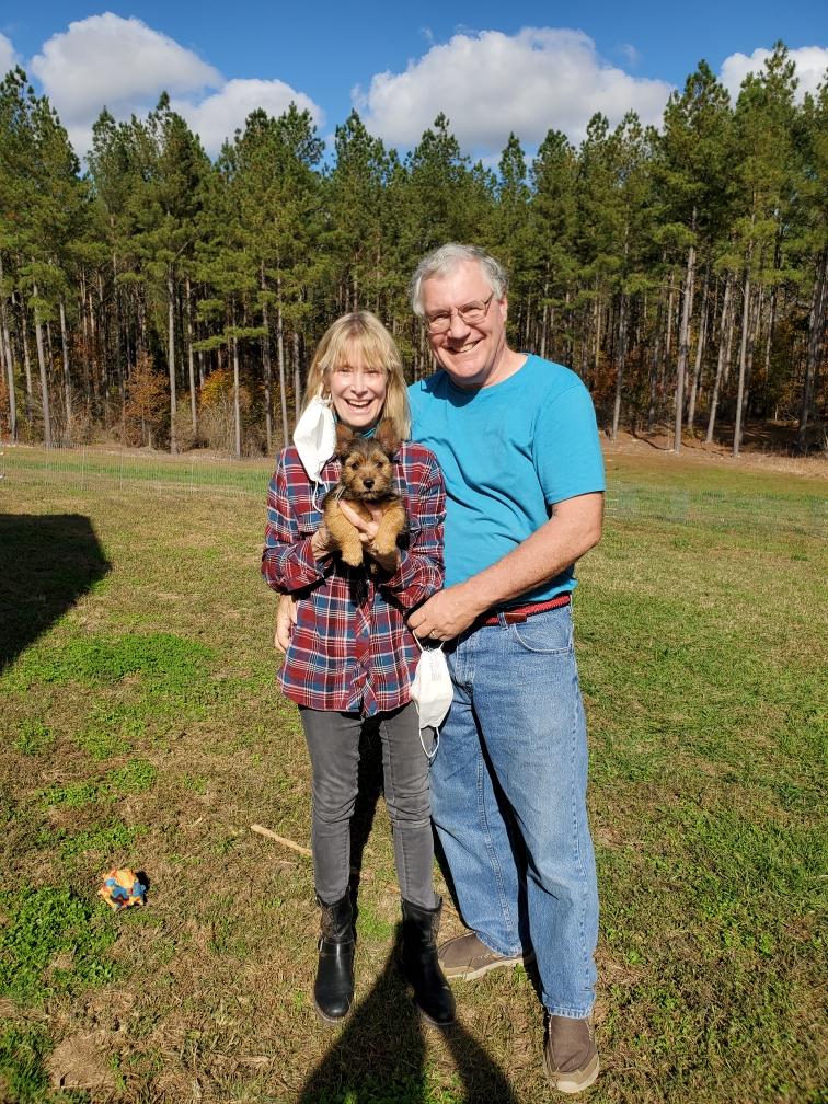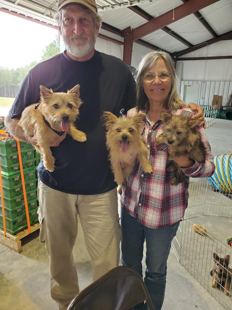 Polly is a "fluffy" Norwich. This means that Polly has two copies of the (recessive) long coat allele that makes a long (and soft) coat. So Polly does not look like a typical Norwich, either in terms of the feel of her coat or its color. In the picture, Polly is shaved down. Gunner does not carry the fluffy allele, so any puppies from a Gunner x Polly breeding will have a normal Norwich coat.