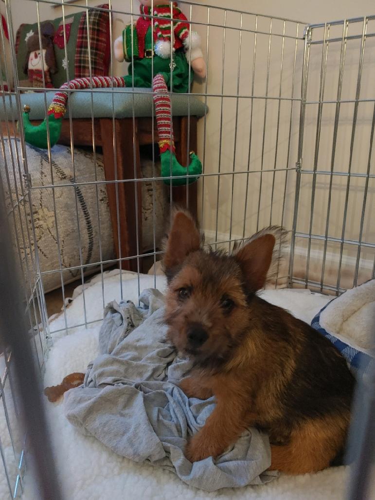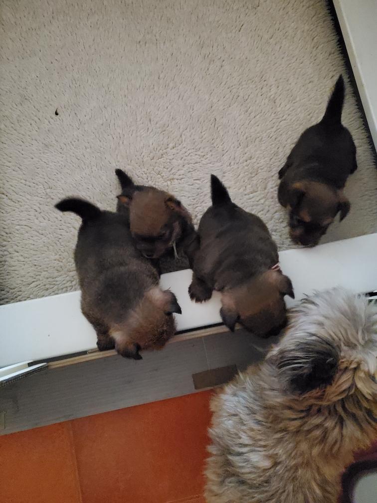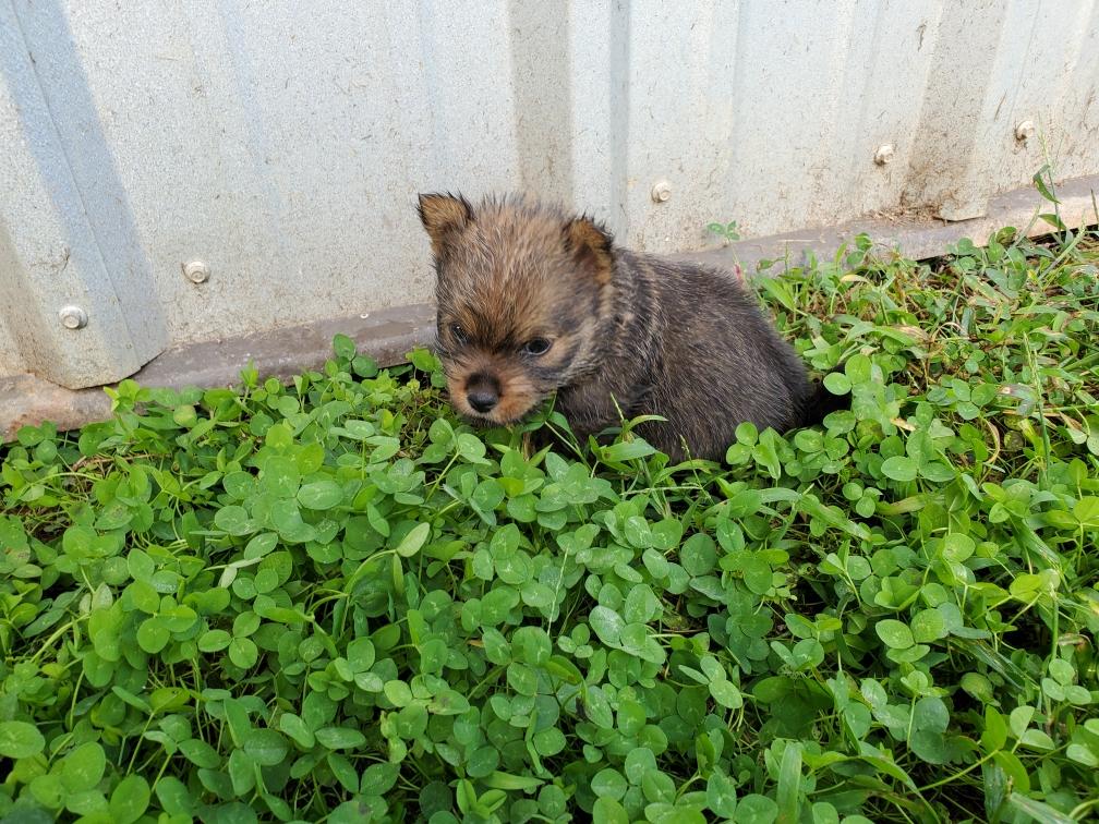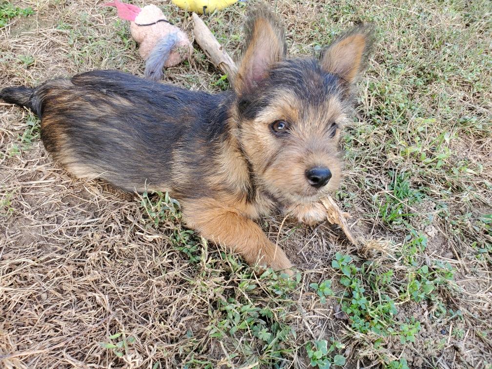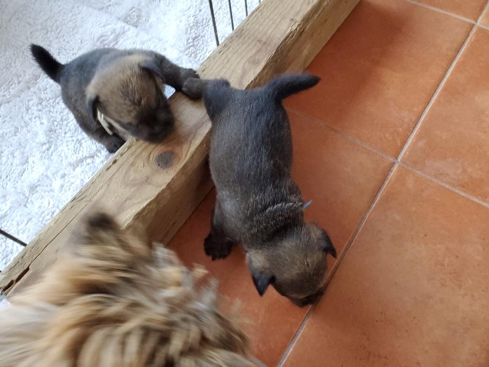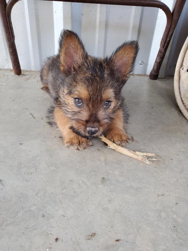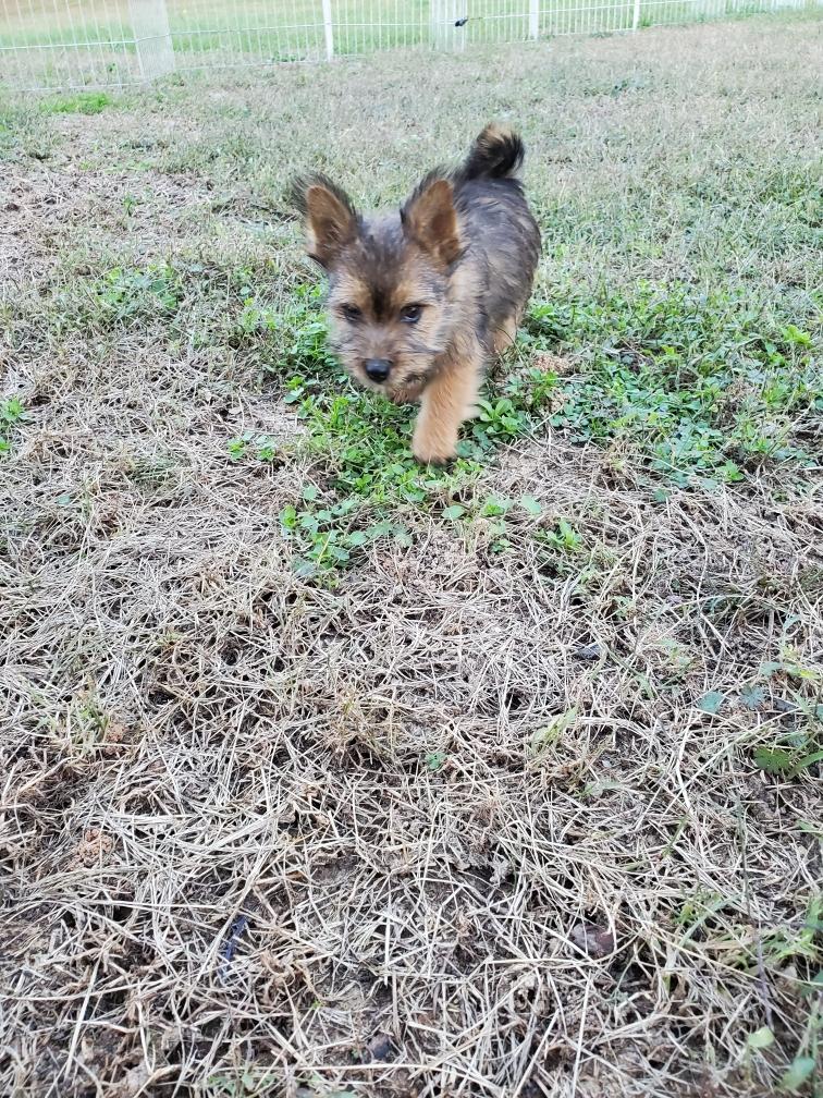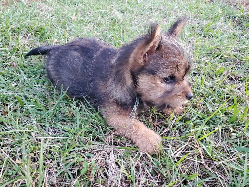 Polly is a "fluffy" Norwich. This means that Polly has two copies of the (recessive) long coat allele that makes a long (and soft) coat. So Polly does not look like a typical Norwich, either in terms of the feel of her coat or its color. In the picture, Polly is shaved down. Gunner does not carry the fluffy allele, so any puppies from a Gunner x Polly breeding will have a normal Norwich coat.