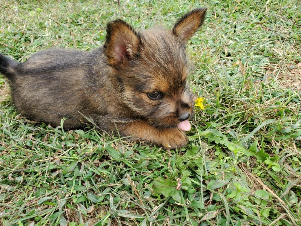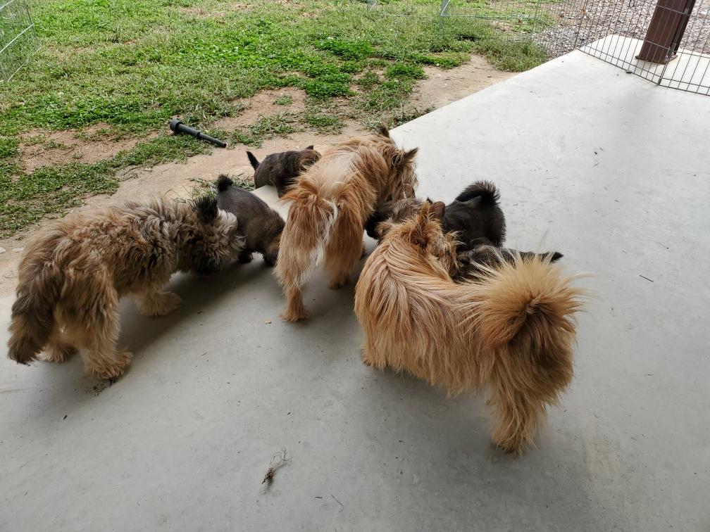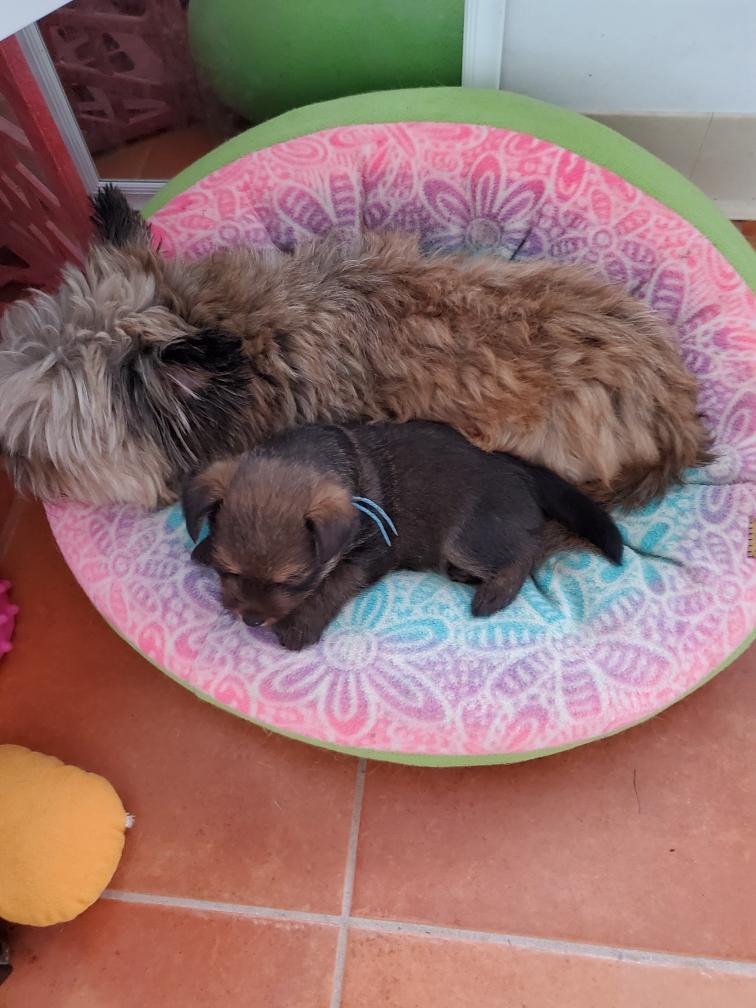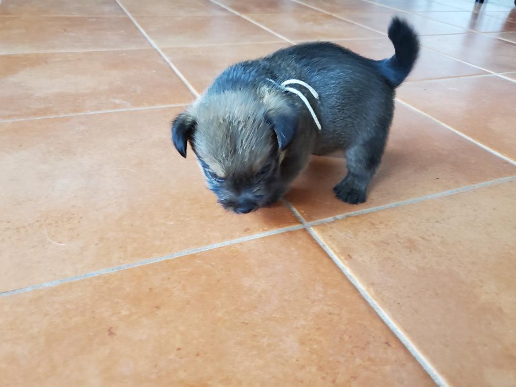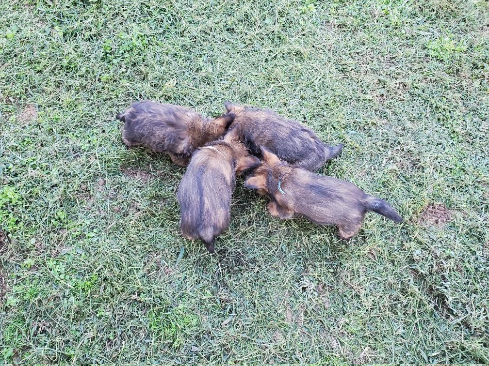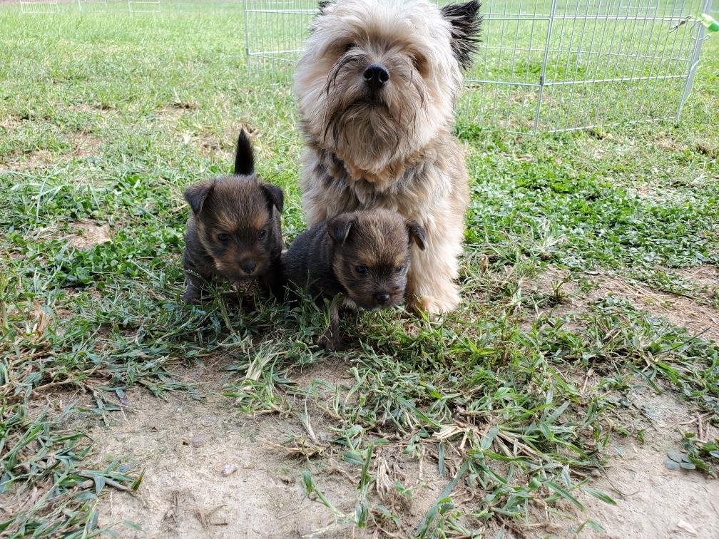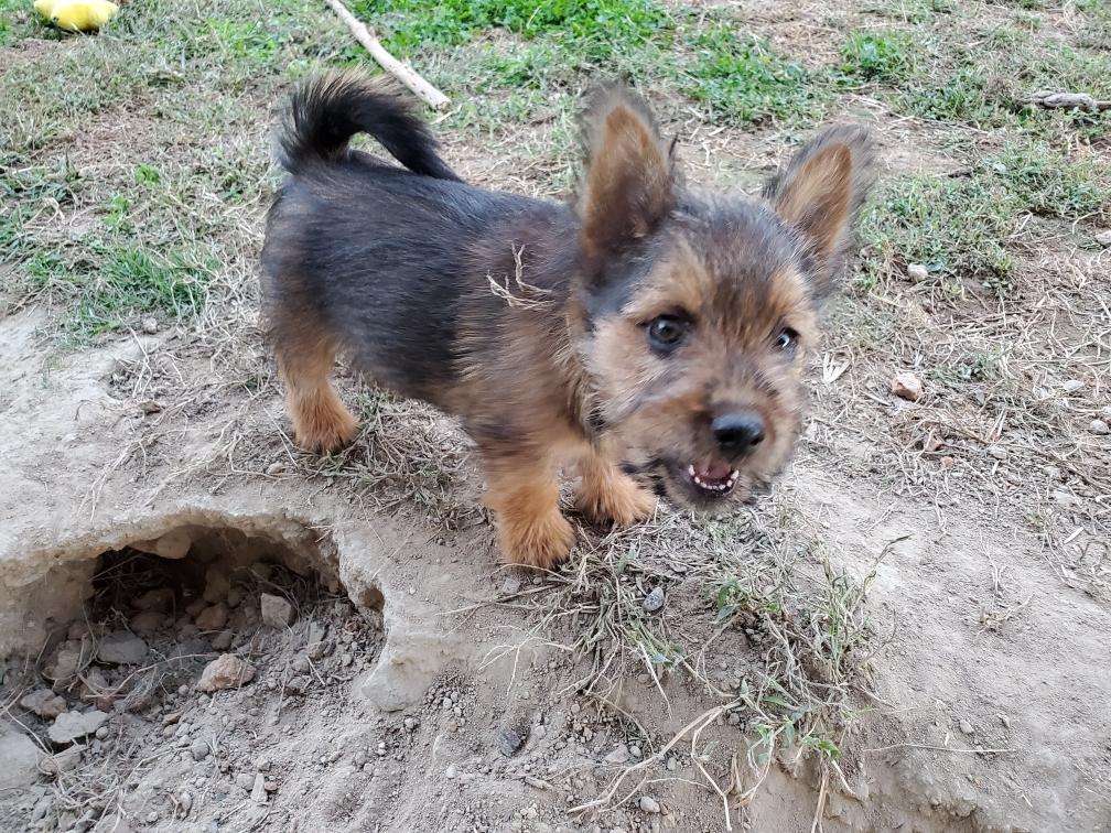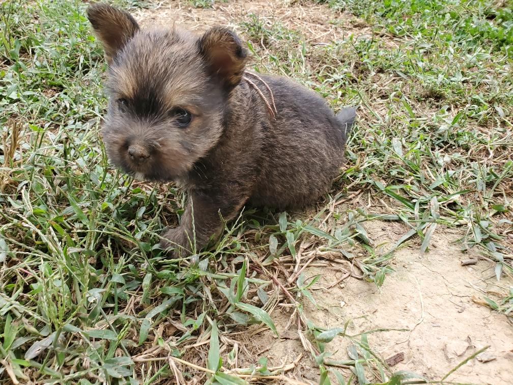 Polly is a "fluffy" Norwich. This means that Polly has two copies of the (recessive) long coat allele that makes a long (and soft) coat. So Polly does not look like a typical Norwich, either in terms of the feel of her coat or its color. In the picture, Polly is shaved down. Gunner does not carry the fluffy allele, so any puppies from a Gunner x Polly breeding will have a normal Norwich coat.