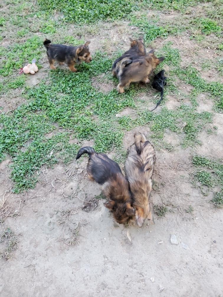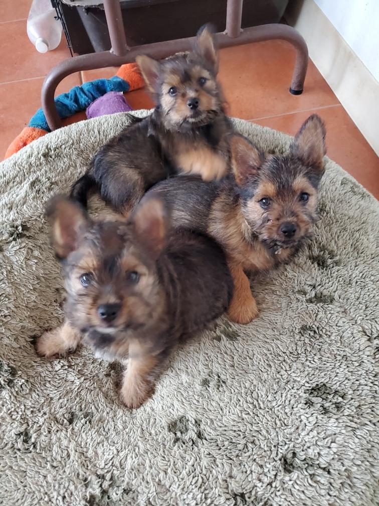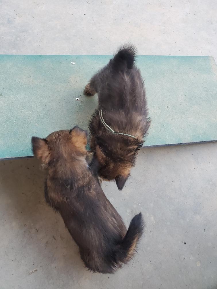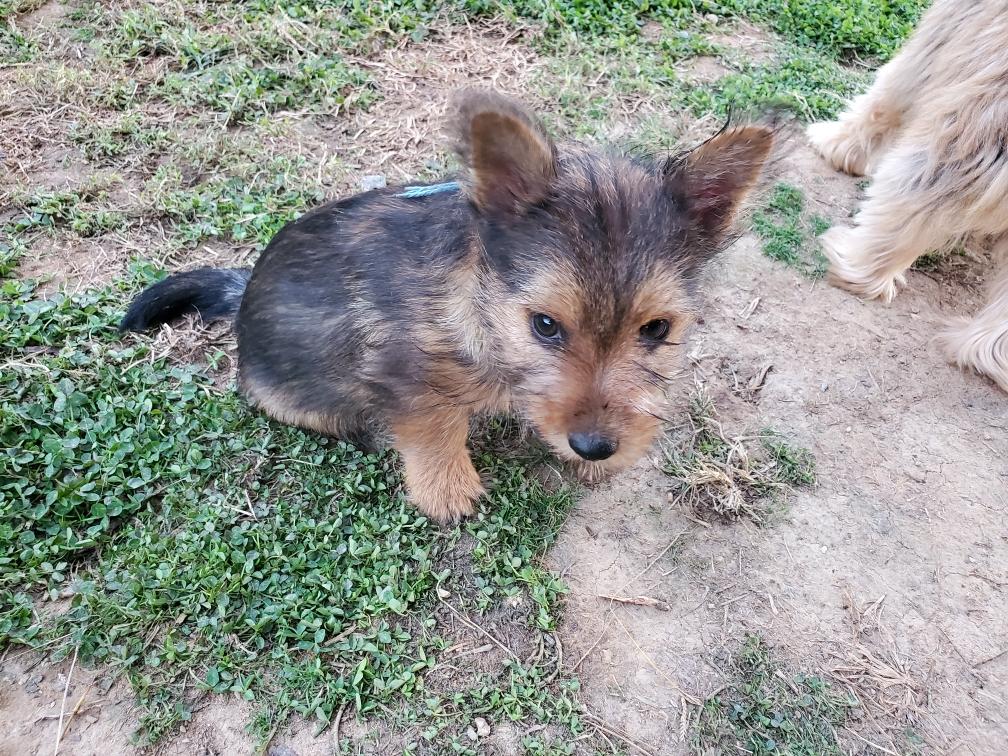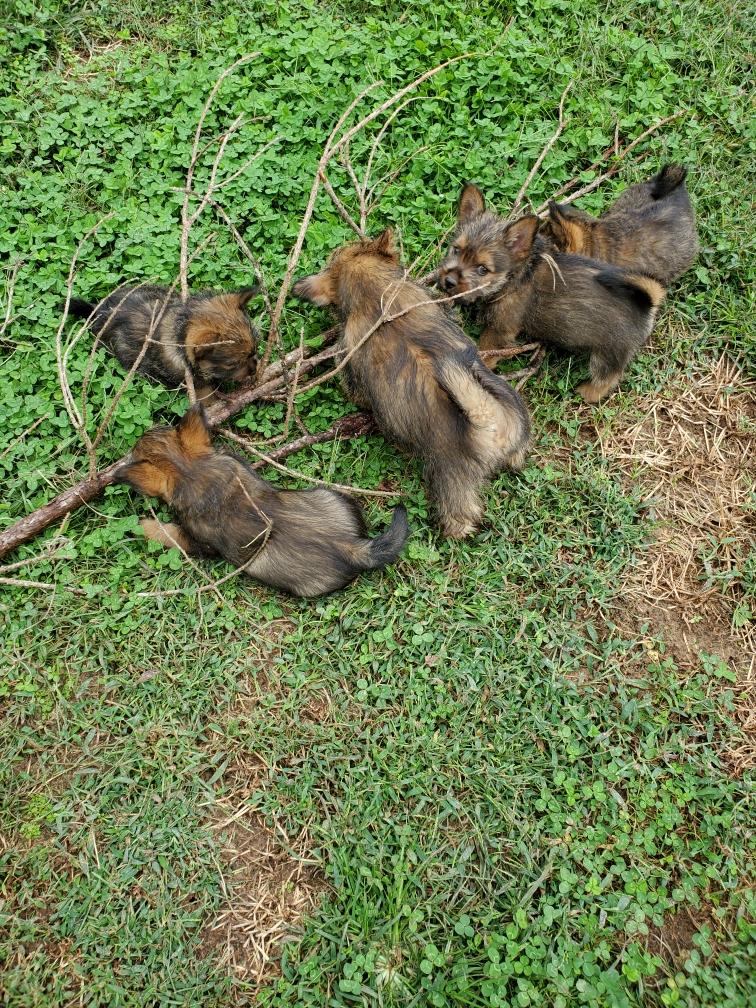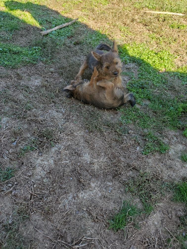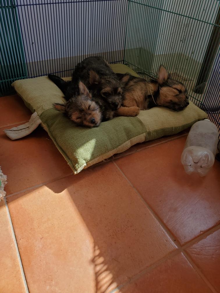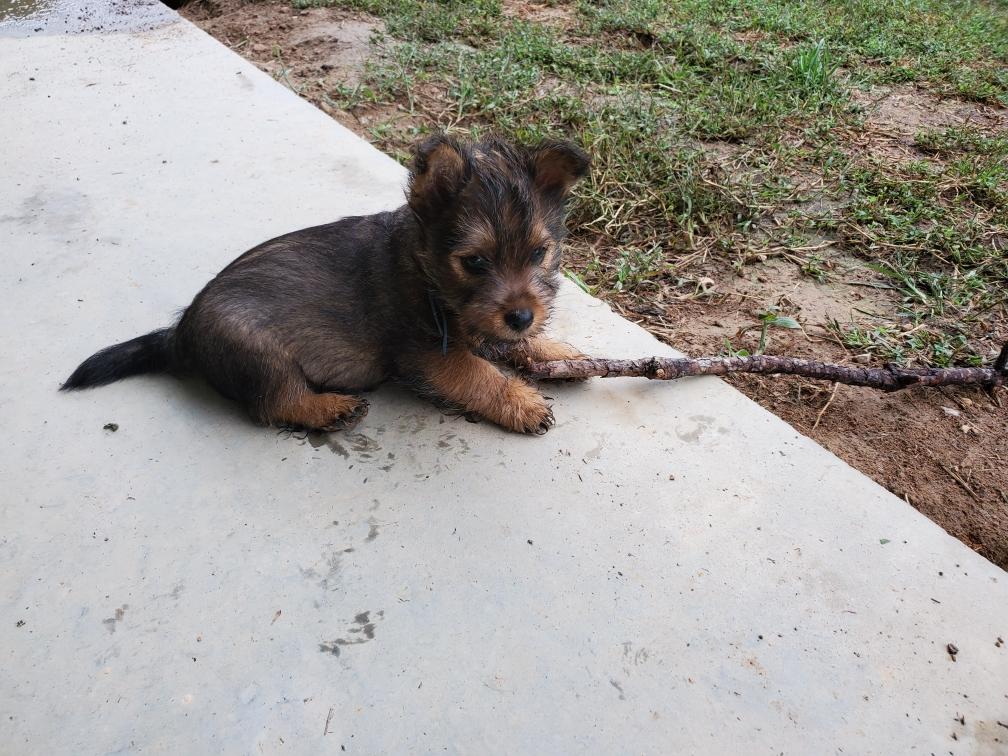 Polly is a "fluffy" Norwich. This means that Polly has two copies of the (recessive) long coat allele that makes a long (and soft) coat. So Polly does not look like a typical Norwich, either in terms of the feel of her coat or its color. In the picture, Polly is shaved down. Gunner does not carry the fluffy allele, so any puppies from a Gunner x Polly breeding will have a normal Norwich coat.