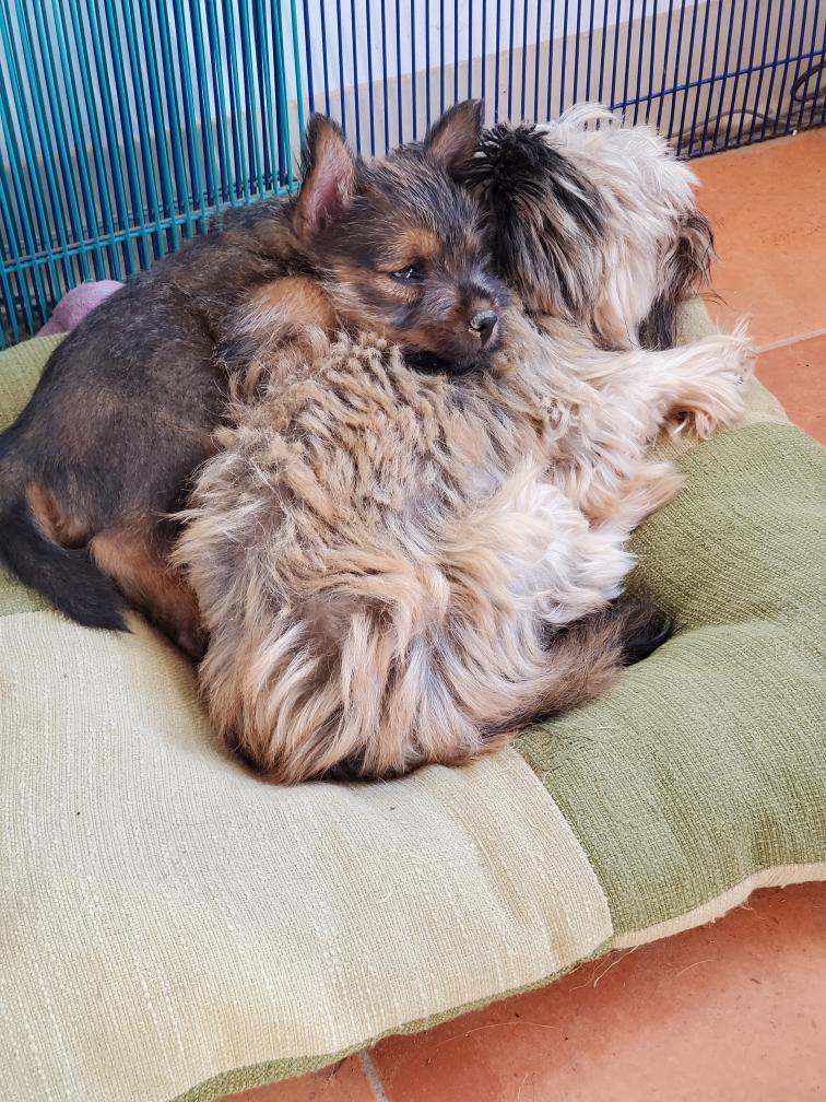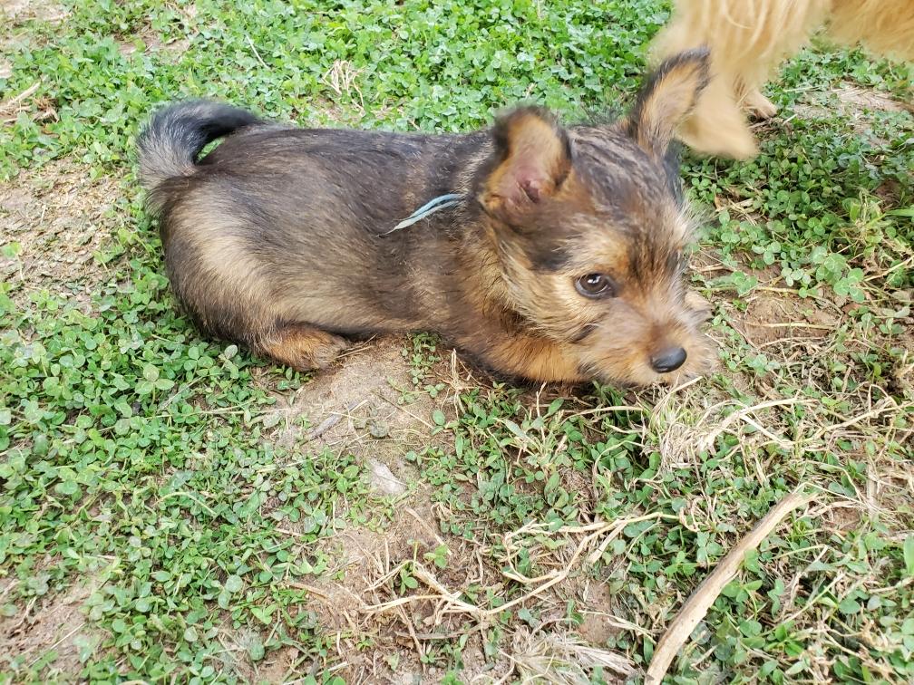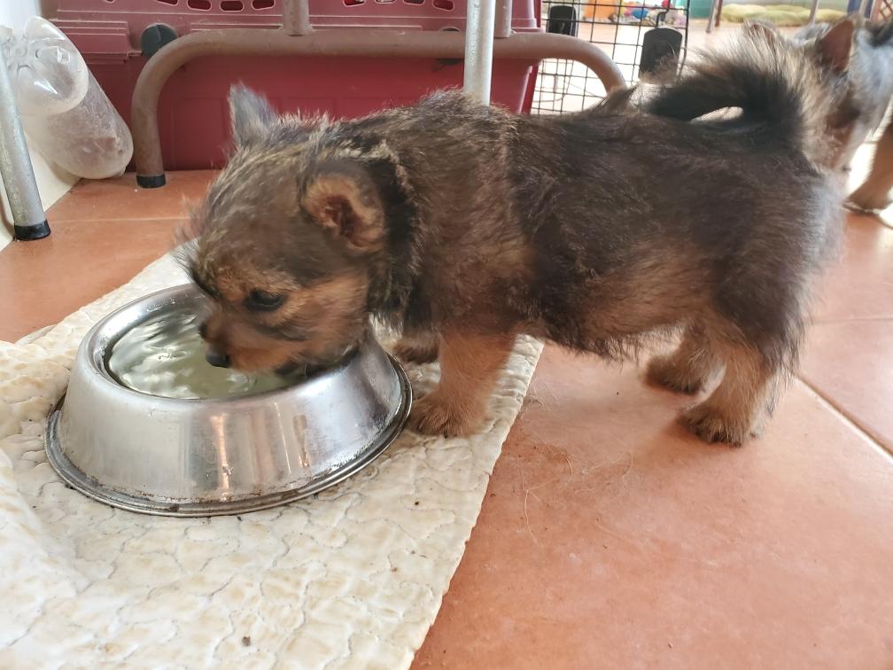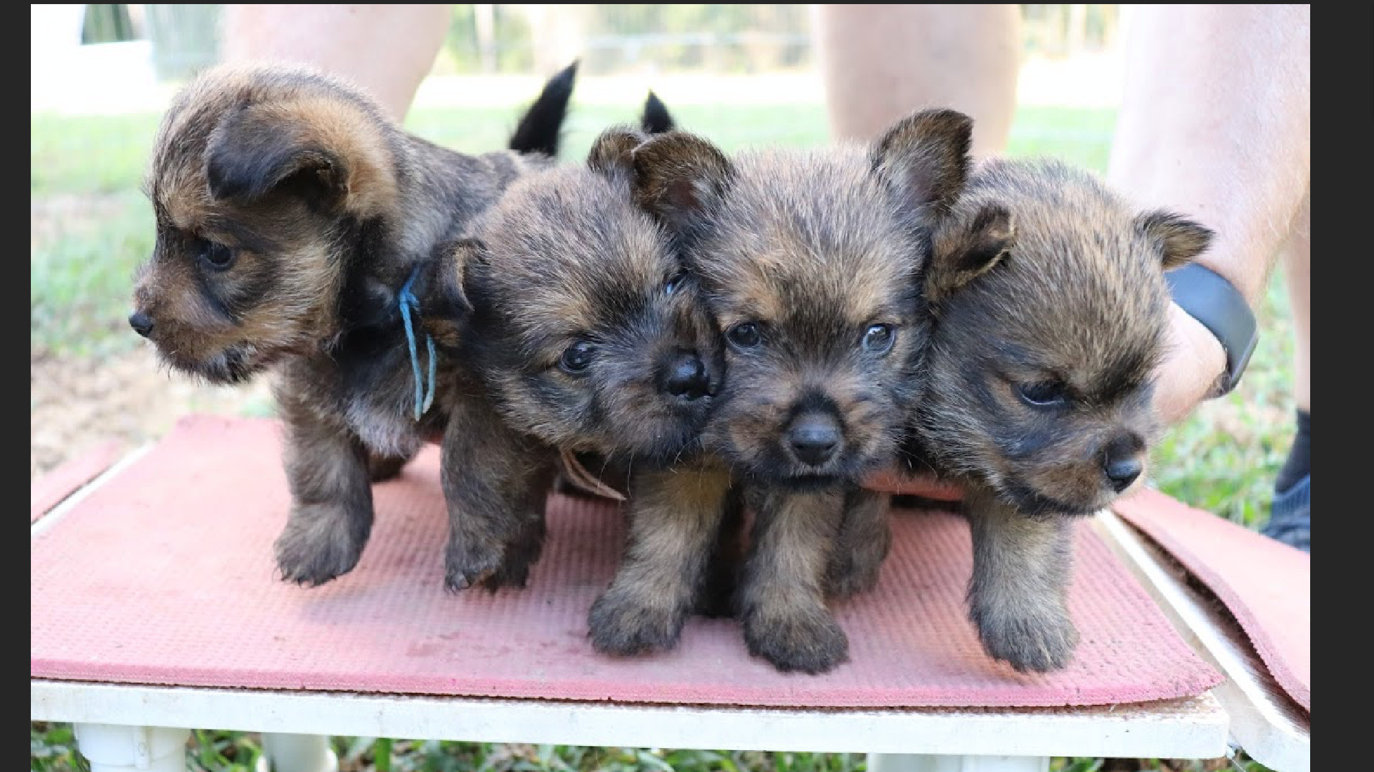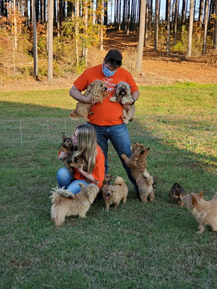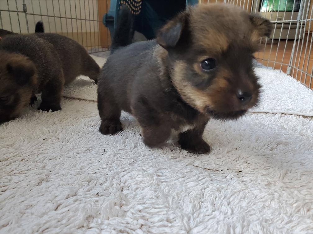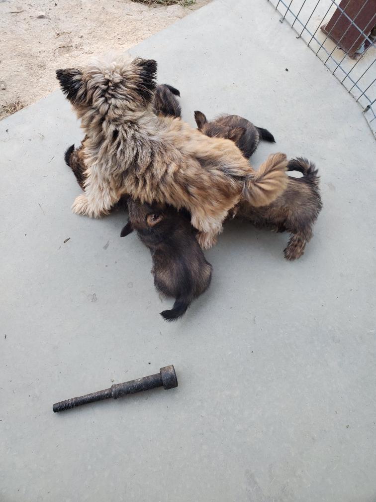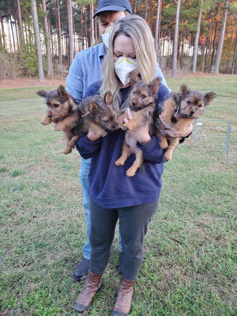 Polly is a "fluffy" Norwich. This means that Polly has two copies of the (recessive) long coat allele that makes a long (and soft) coat. So Polly does not look like a typical Norwich, either in terms of the feel of her coat or its color. In the picture, Polly is shaved down. Gunner does not carry the fluffy allele, so any puppies from a Gunner x Polly breeding will have a normal Norwich coat.