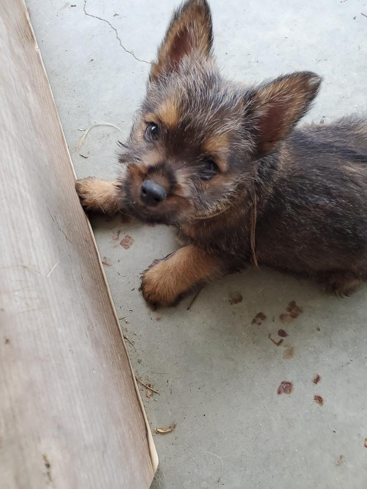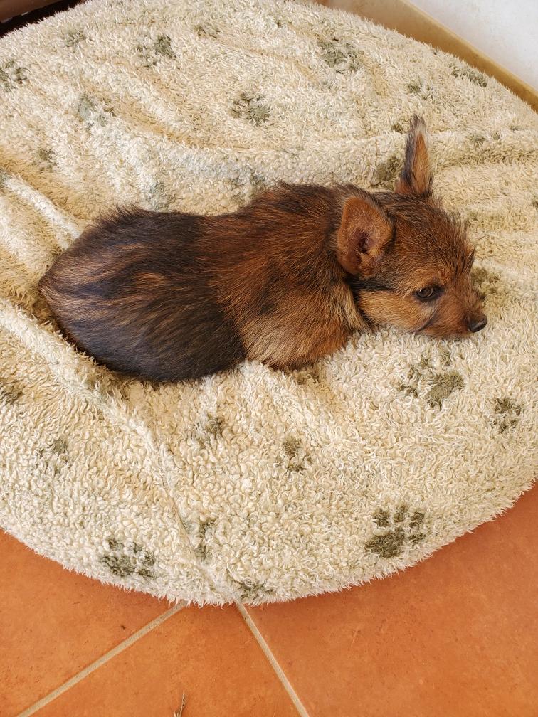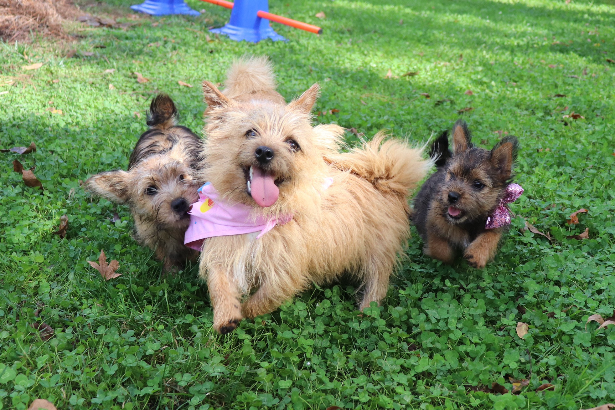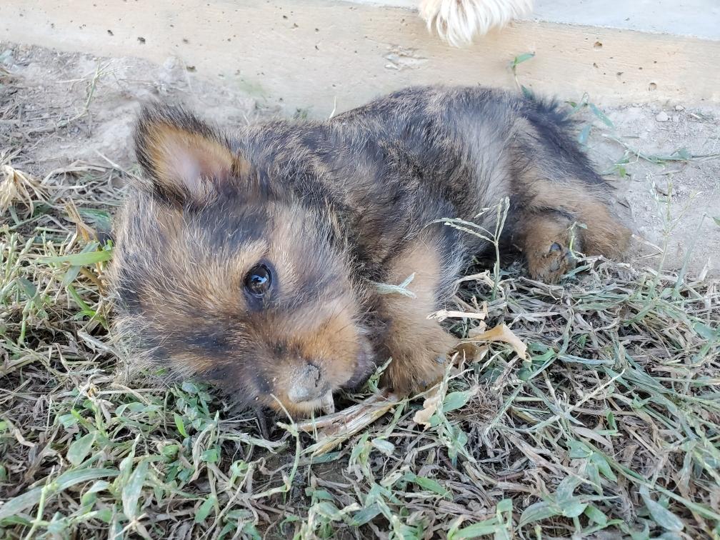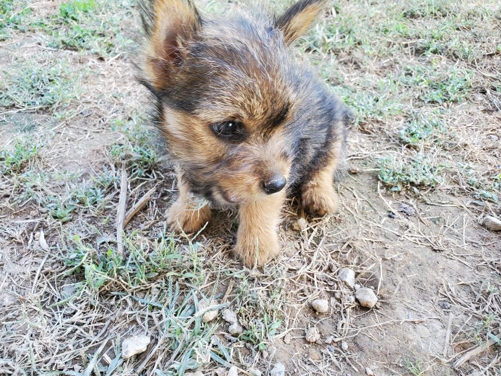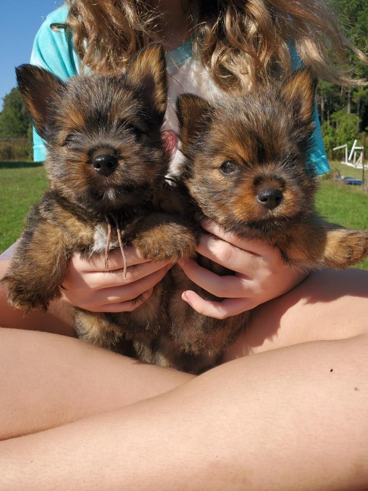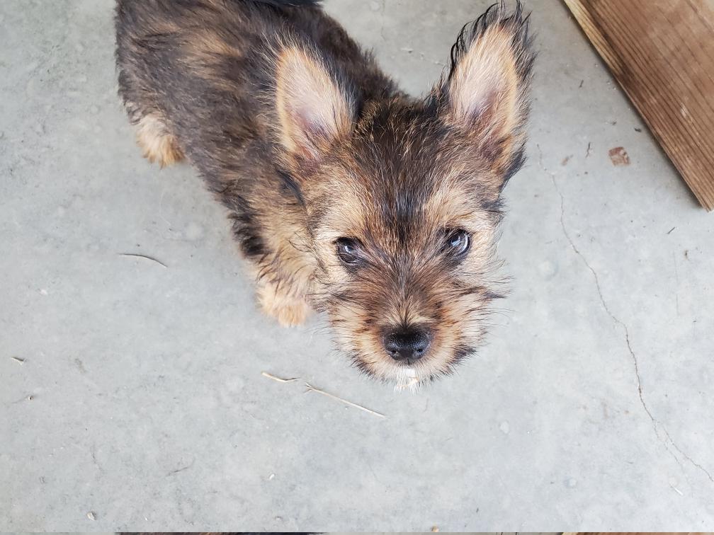 Polly is a "fluffy" Norwich. This means that Polly has two copies of the (recessive) long coat allele that makes a long (and soft) coat. So Polly does not look like a typical Norwich, either in terms of the feel of her coat or its color. In the picture, Polly is shaved down. Gunner does not carry the fluffy allele, so any puppies from a Gunner x Polly breeding will have a normal Norwich coat.