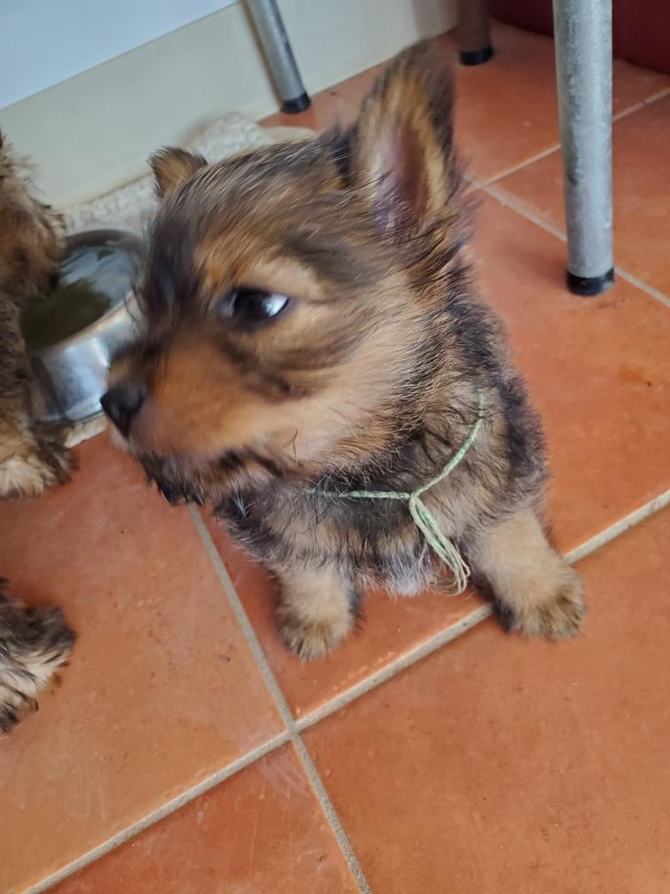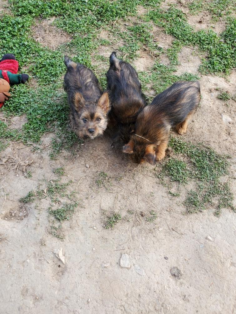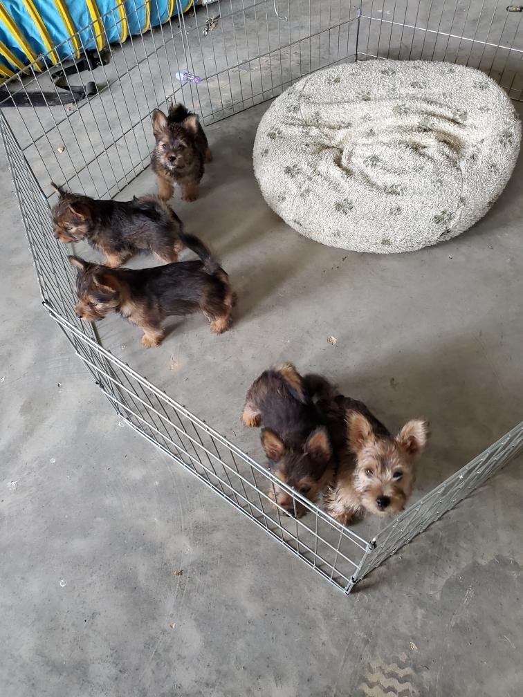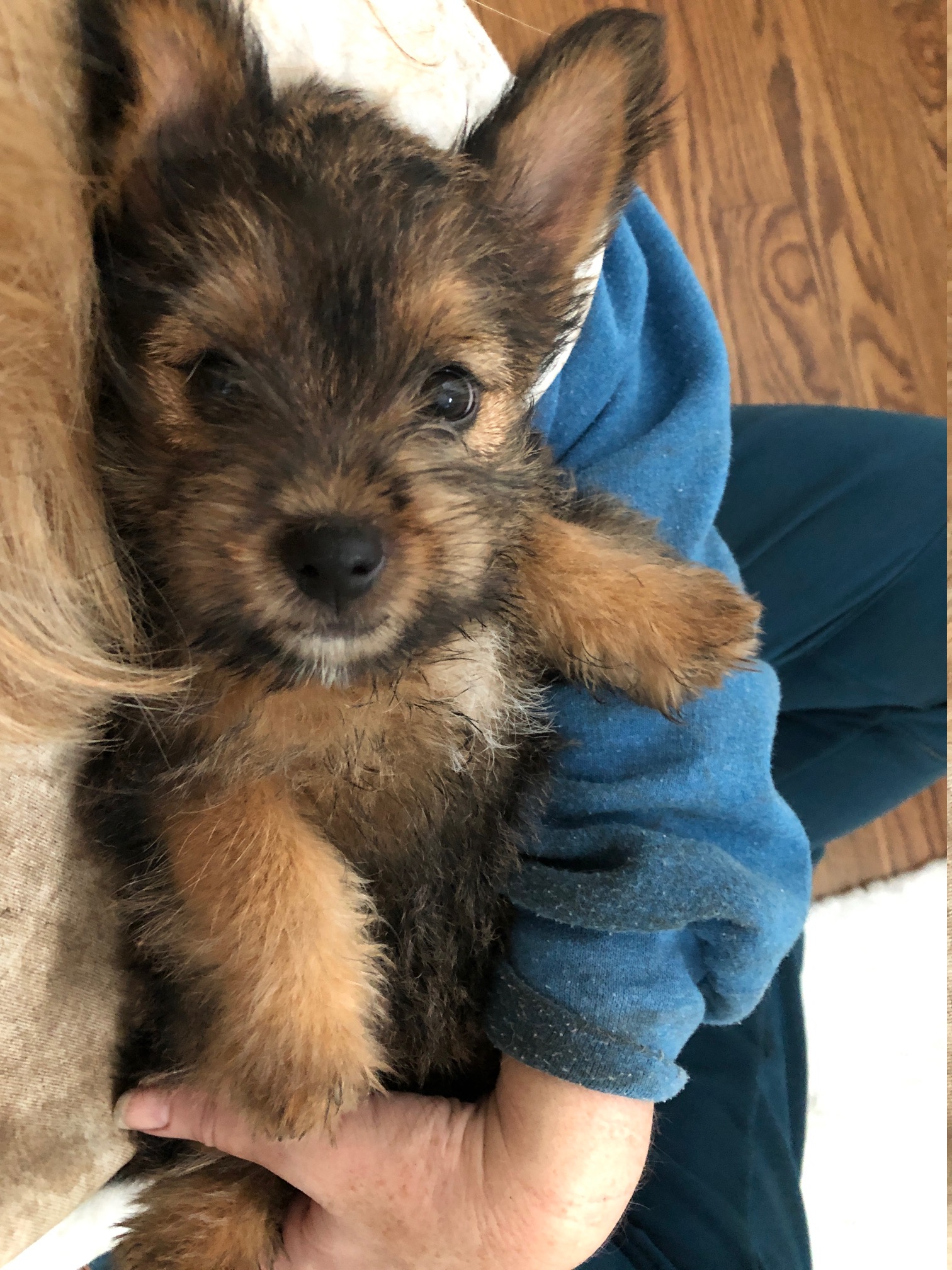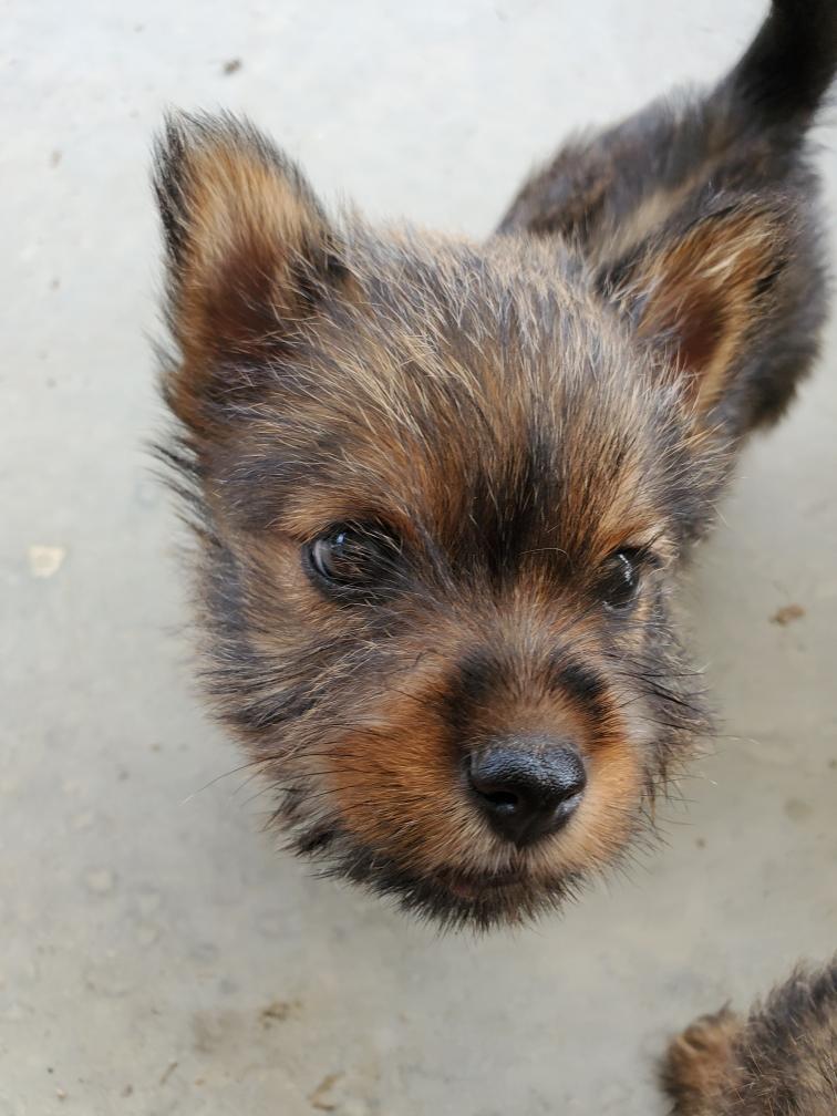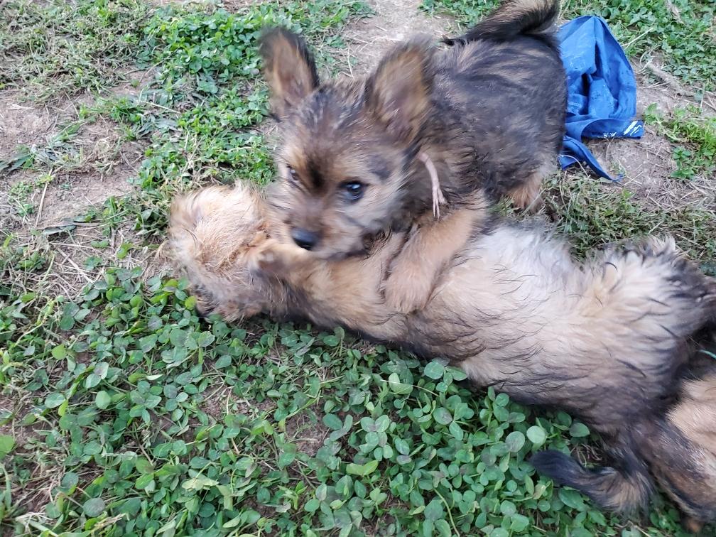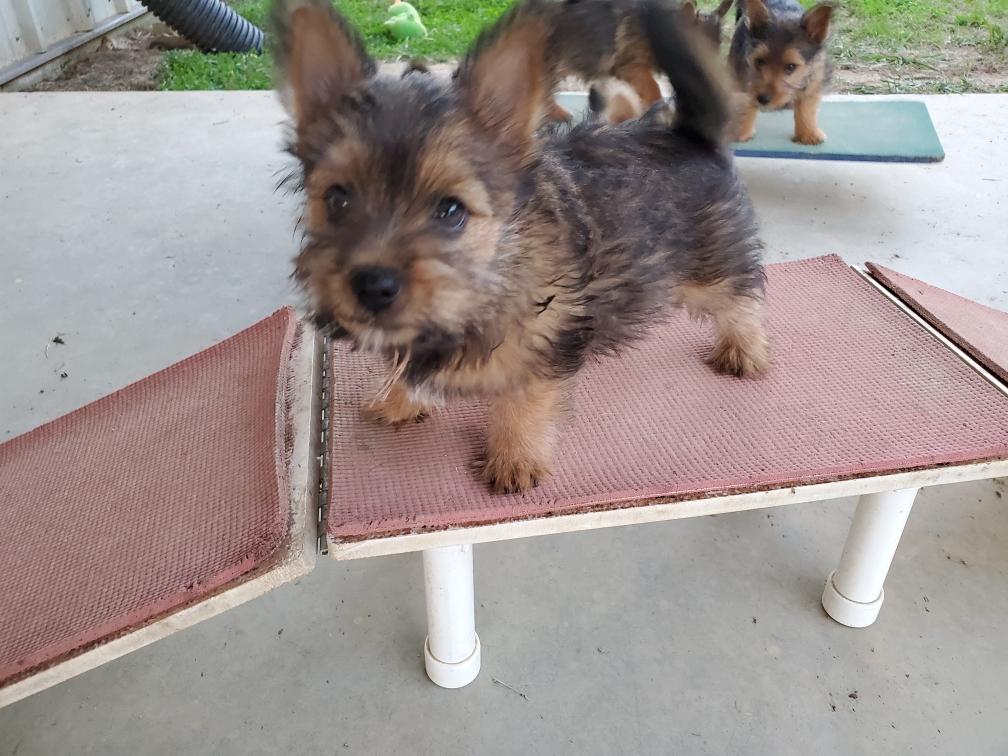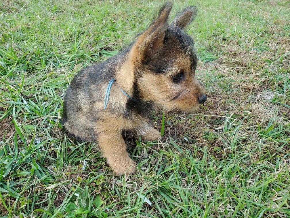Polly is a "fluffy" Norwich. This means that Polly has two copies of the (recessive) long coat allele that makes a long (and soft) coat. So Polly does not look like a typical Norwich, either in terms of the feel of her coat or its color. In the picture, Polly is shaved down. Gunner does not carry the fluffy allele, so any puppies from a Gunner x Polly breeding will have a normal Norwich coat.