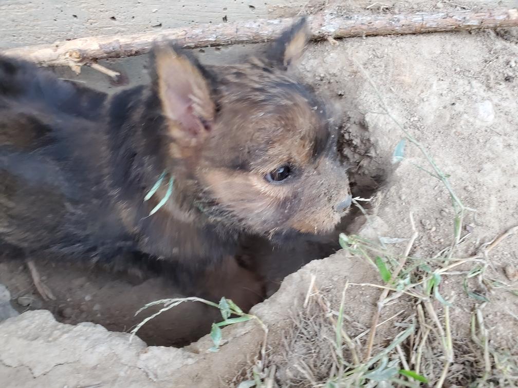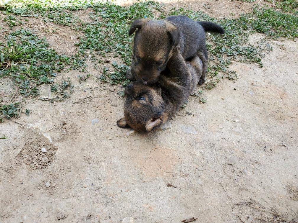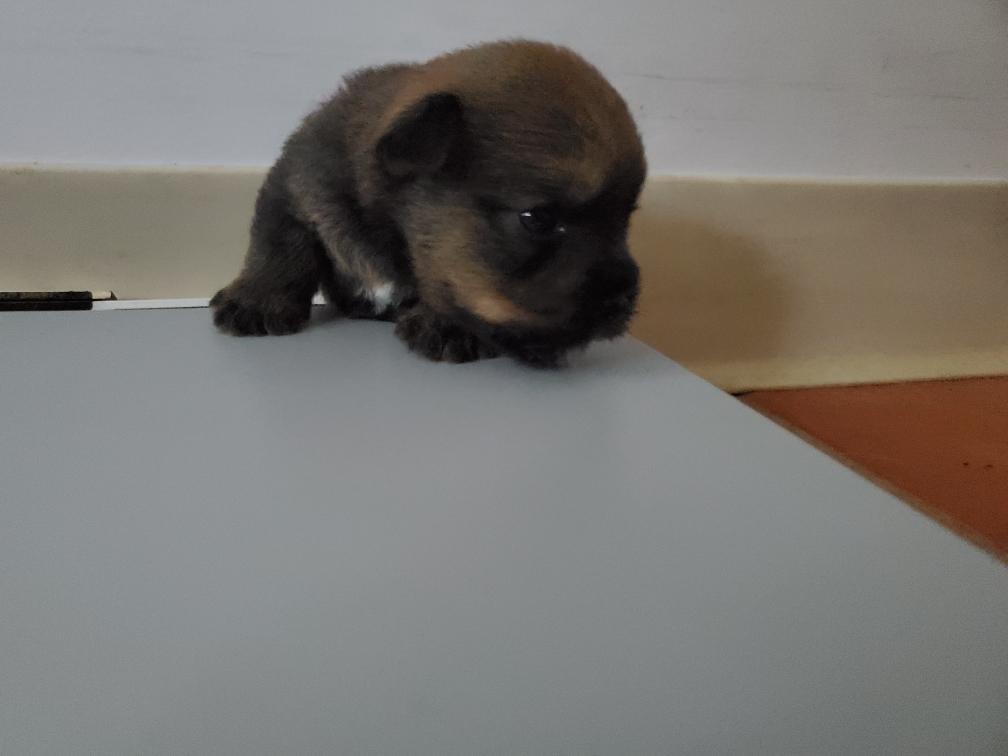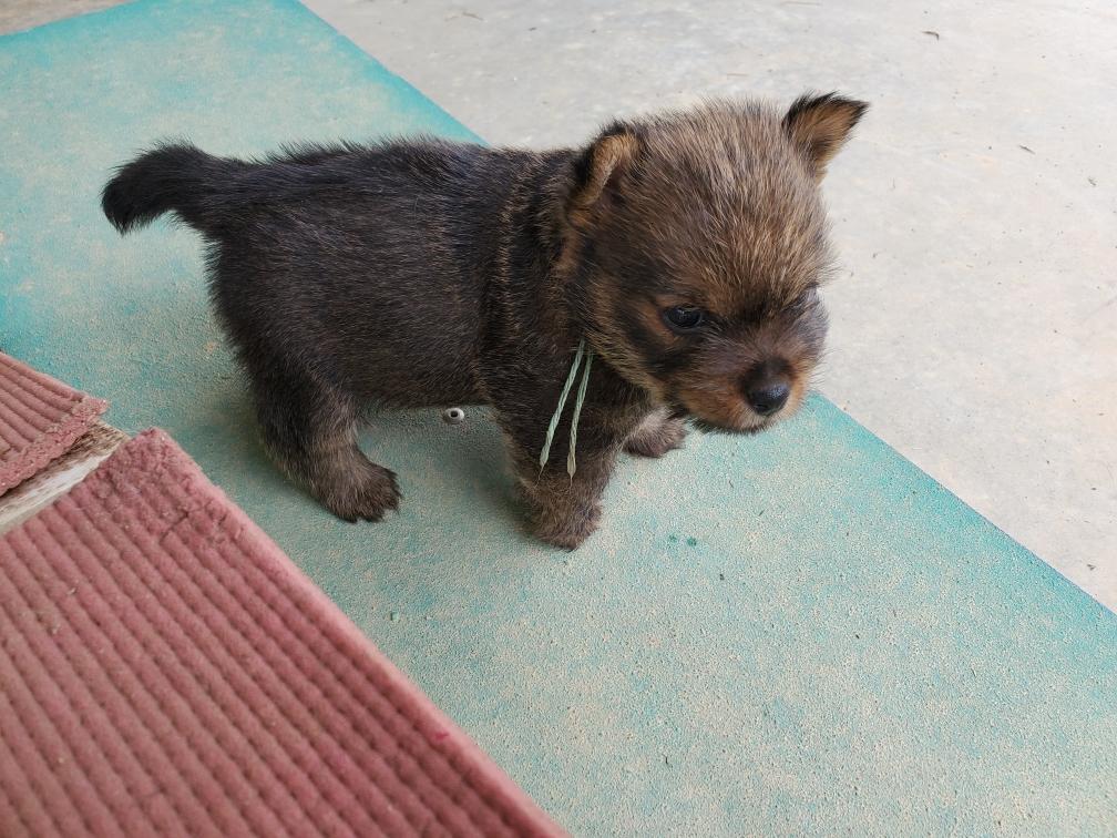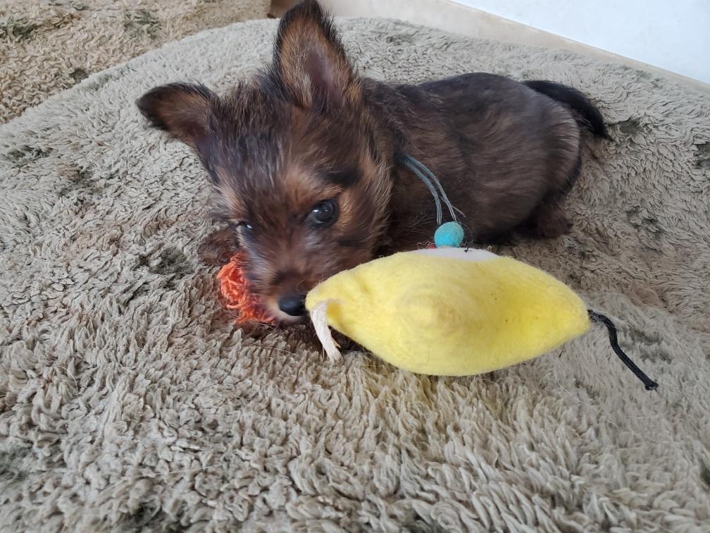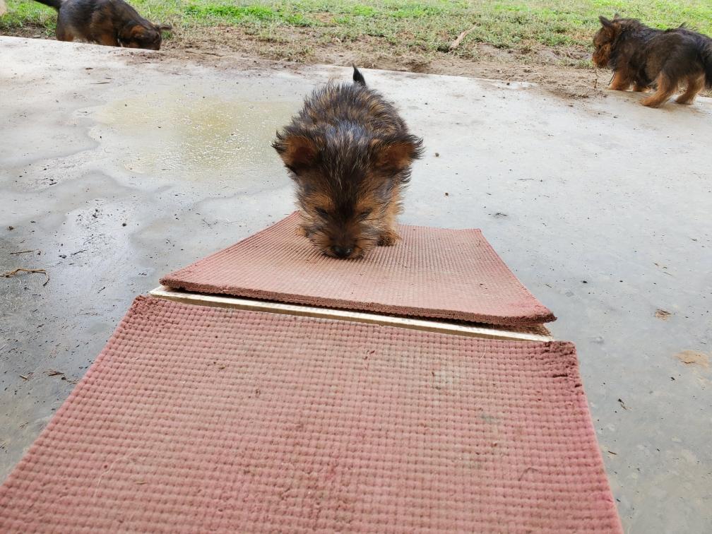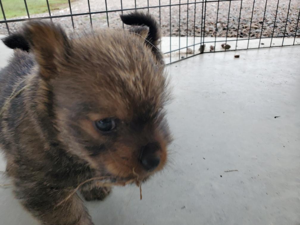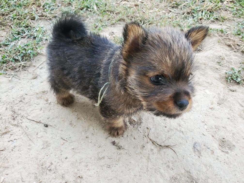 Polly is a "fluffy" Norwich. This means that Polly has two copies of the (recessive) long coat allele that makes a long (and soft) coat. So Polly does not look like a typical Norwich, either in terms of the feel of her coat or its color. In the picture, Polly is shaved down. Gunner does not carry the fluffy allele, so any puppies from a Gunner x Polly breeding will have a normal Norwich coat.