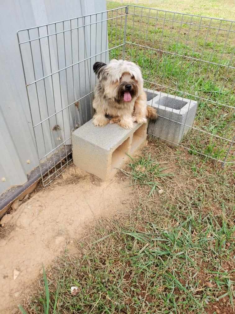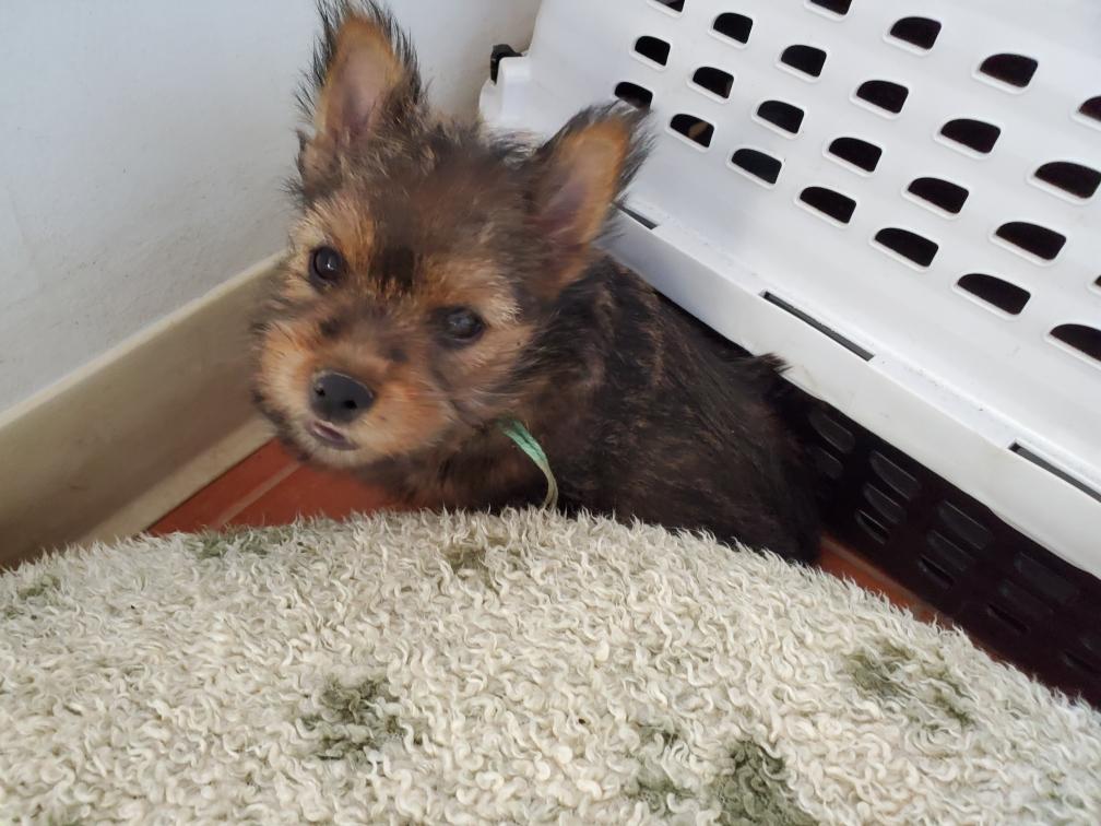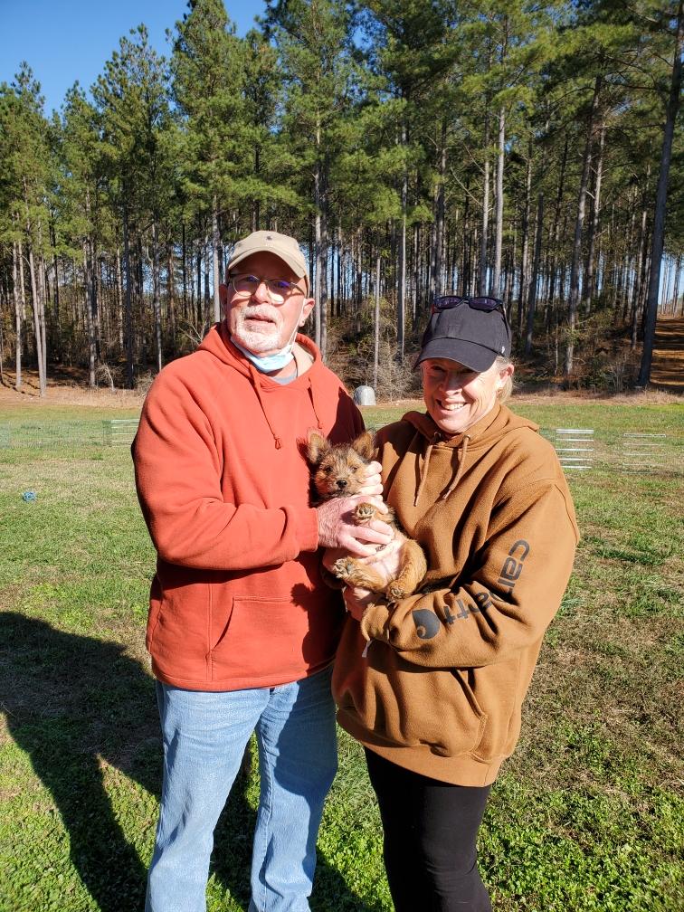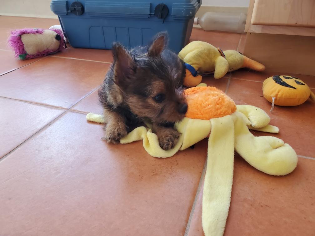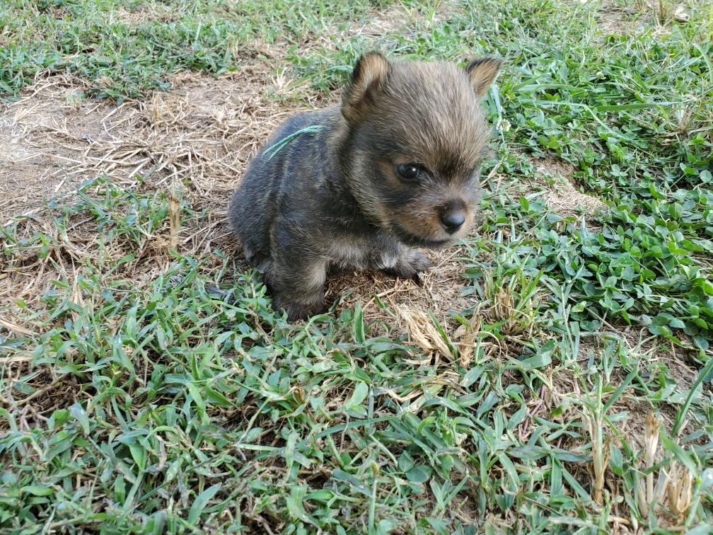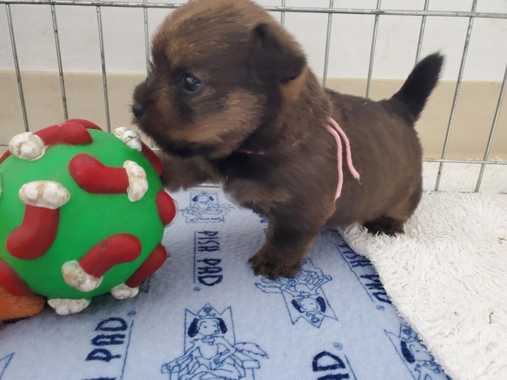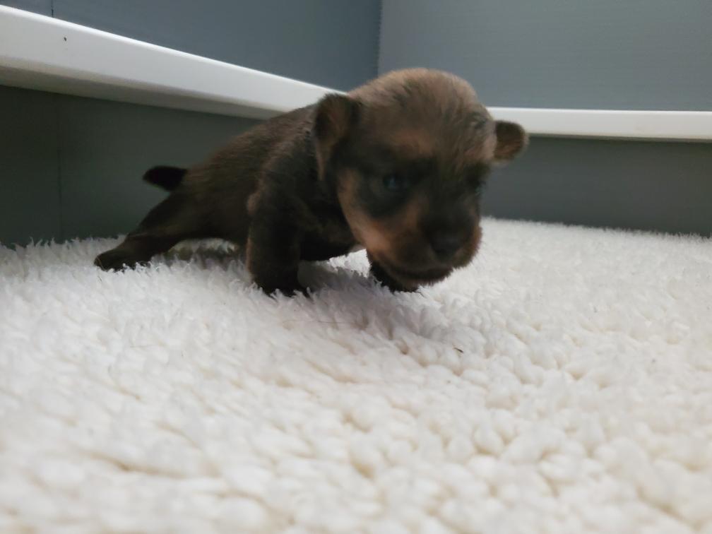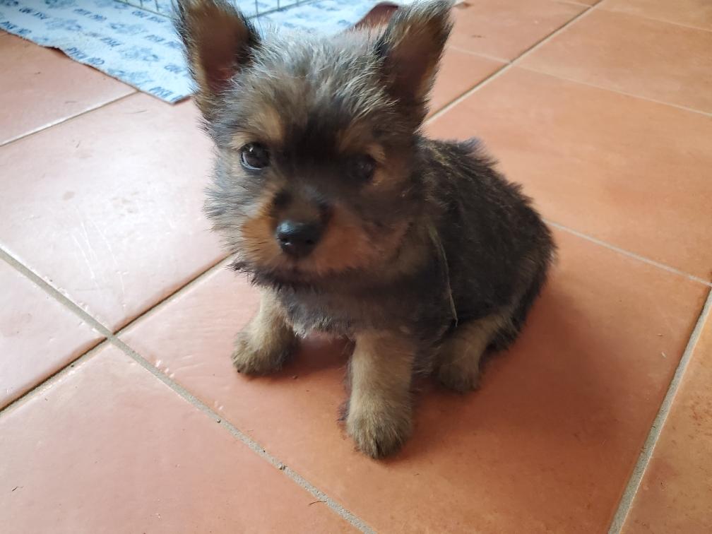 Polly is a "fluffy" Norwich. This means that Polly has two copies of the (recessive) long coat allele that makes a long (and soft) coat. So Polly does not look like a typical Norwich, either in terms of the feel of her coat or its color. In the picture, Polly is shaved down. Gunner does not carry the fluffy allele, so any puppies from a Gunner x Polly breeding will have a normal Norwich coat.