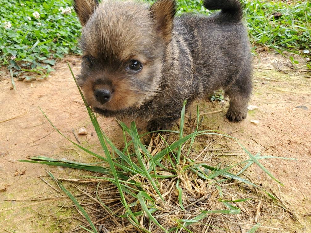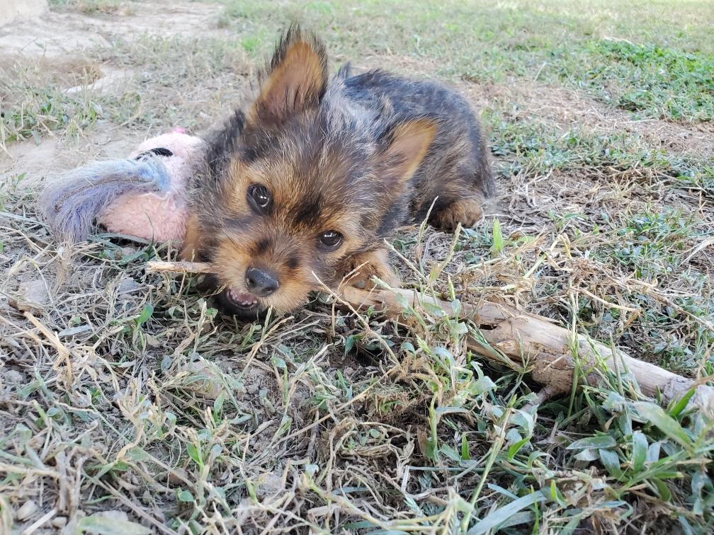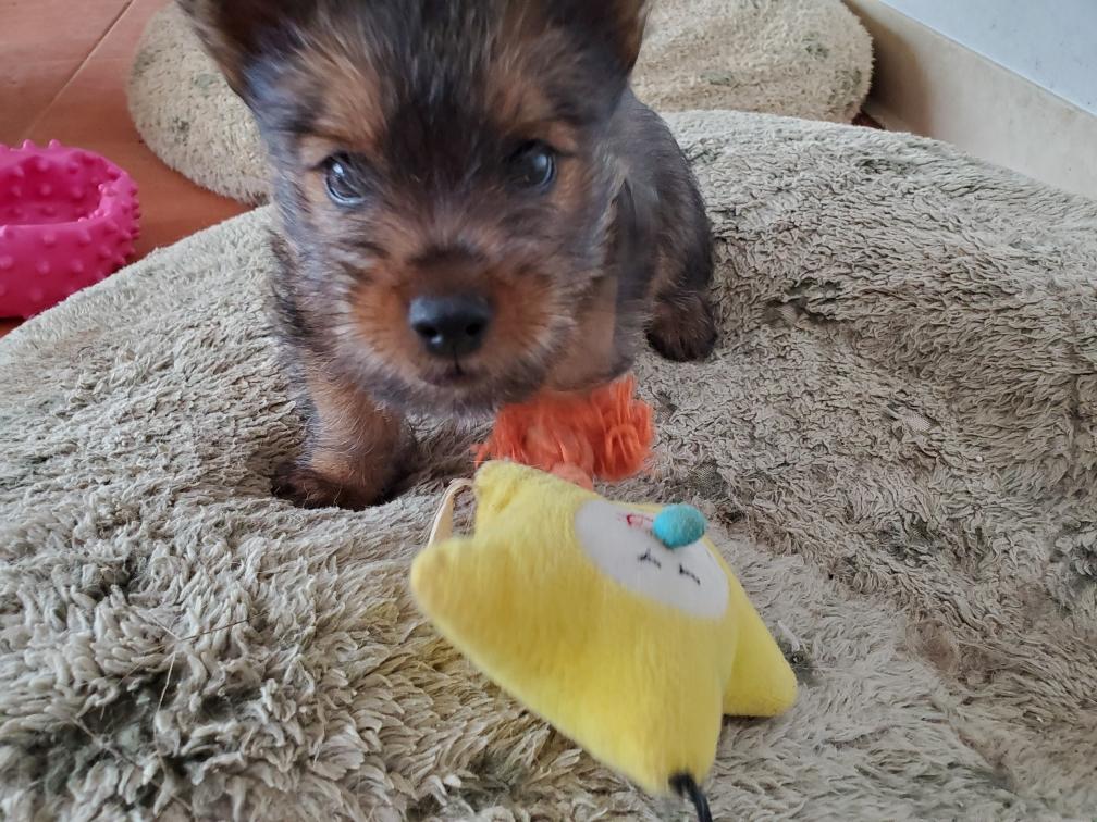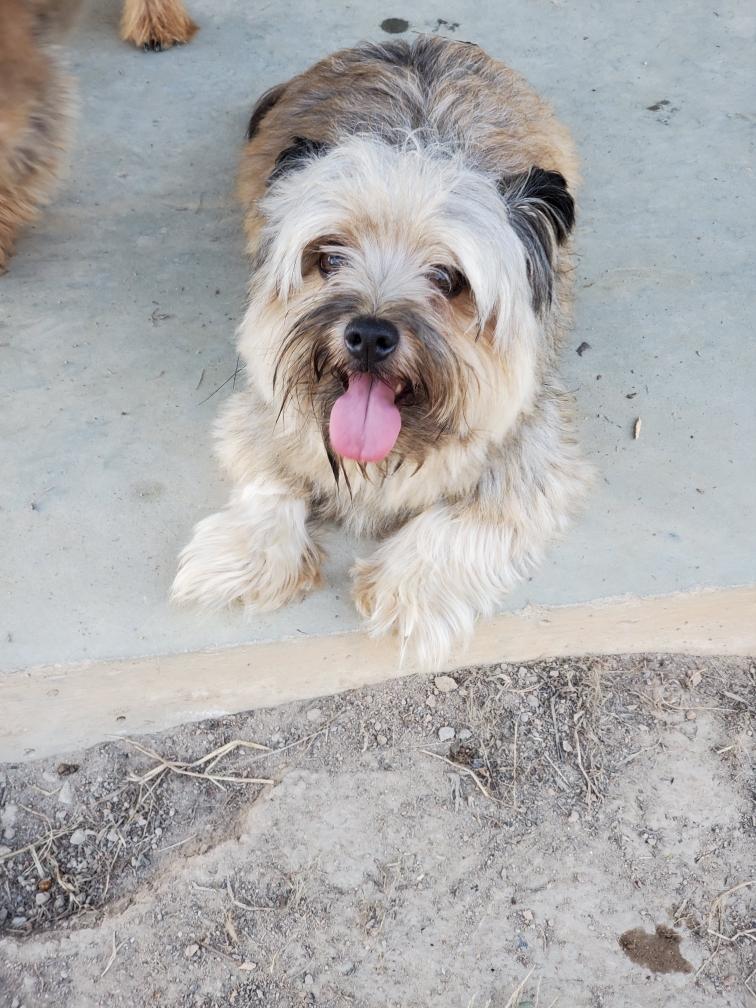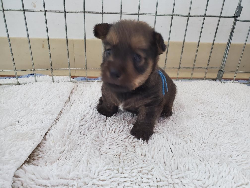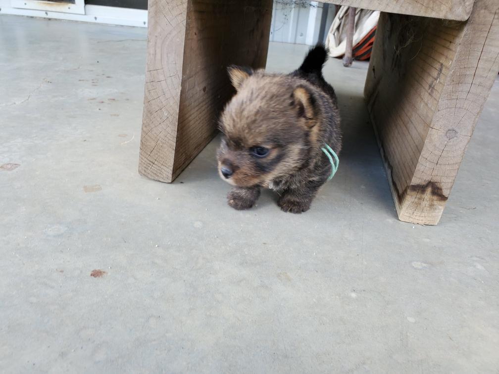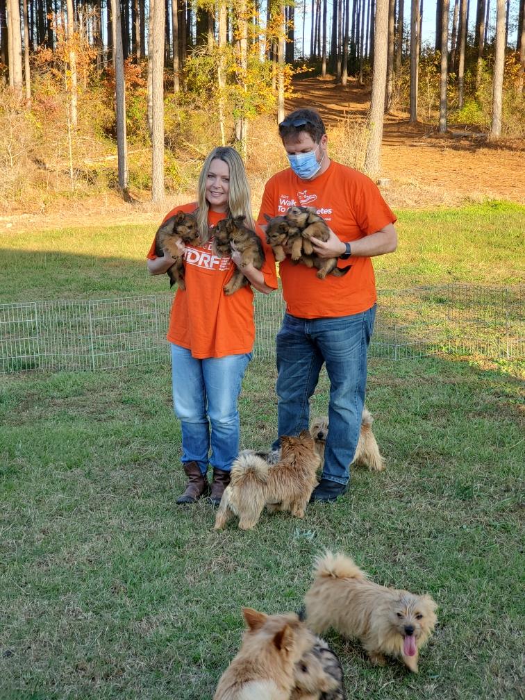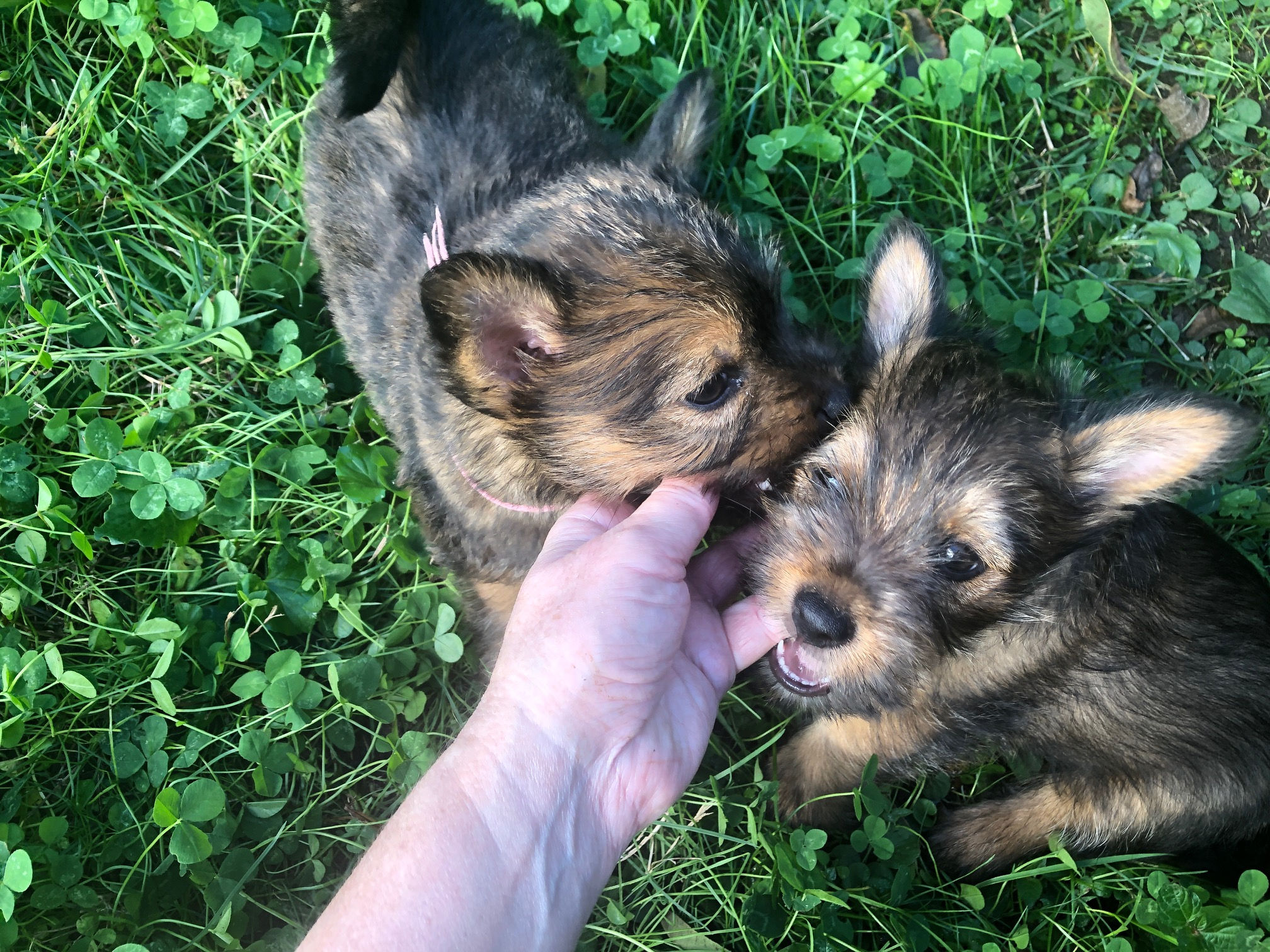 Polly is a "fluffy" Norwich. This means that Polly has two copies of the (recessive) long coat allele that makes a long (and soft) coat. So Polly does not look like a typical Norwich, either in terms of the feel of her coat or its color. In the picture, Polly is shaved down. Gunner does not carry the fluffy allele, so any puppies from a Gunner x Polly breeding will have a normal Norwich coat.