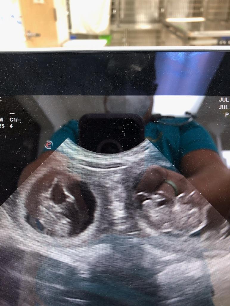 Polly was examined and I was told that the puppys' heartbeats all were in the normal range. Polly was given a shot of oxytocin to encourage contractions. After a wait and still no puppies, Polly was given another dose of oxytocin and again we waited. Around 8:30 pm and still no puppies the vets decided that a cesarean section might be necessary. They told me that Polly was having strong contractions, but they were only seeing minimal movement of the puppies. They said that they were going to start prepping for a c-section. If Polly started having puppies naturally, the surgery could be cancelled.