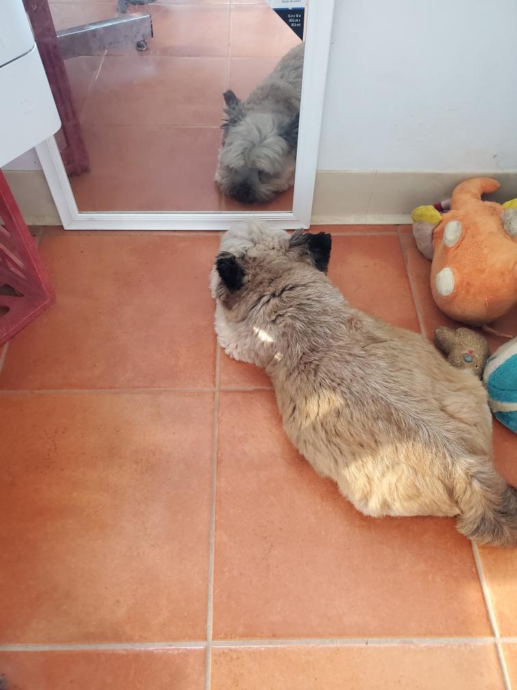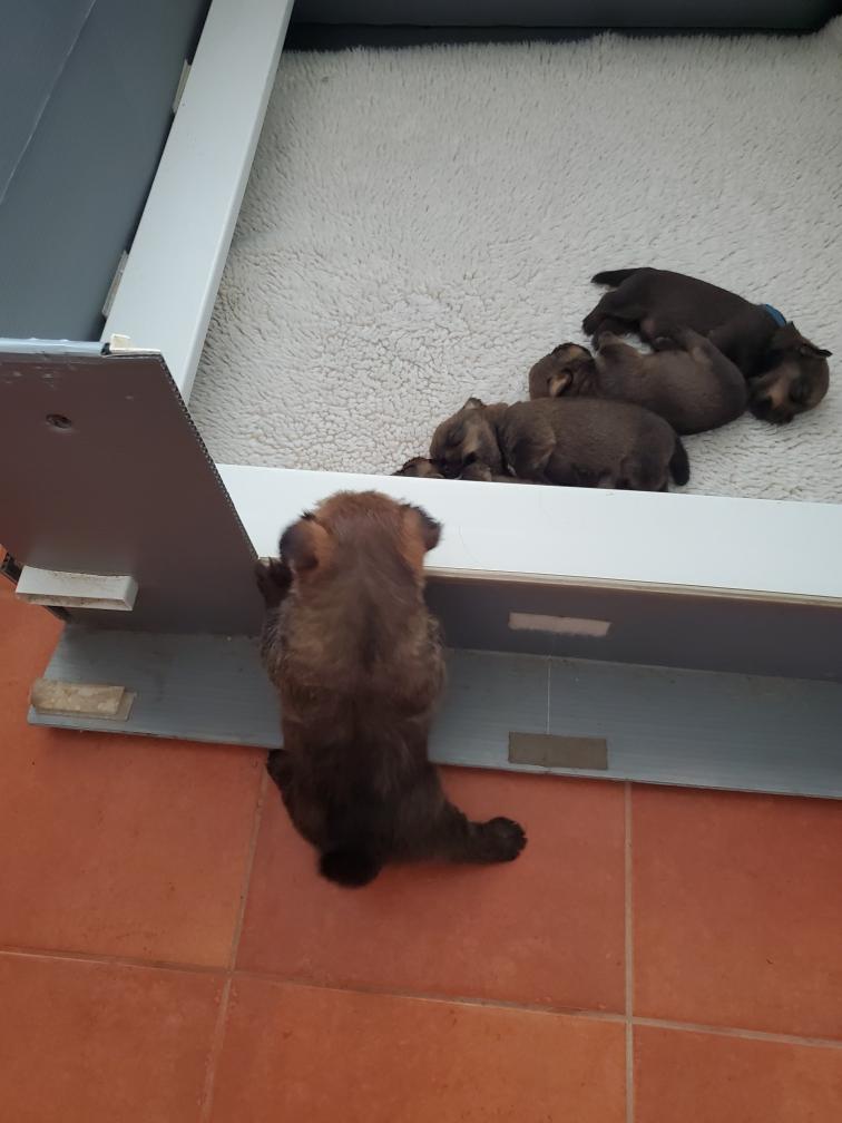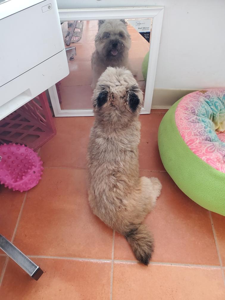 Polly has clearly put the puppies on a schedule (known only to her) and is spending more time during the day out in the living room with me. However if Polly hears a squeak from my bedroom, she immediately rushes back to check on the puppies. Here is Polly admiring herself in a mirrow.