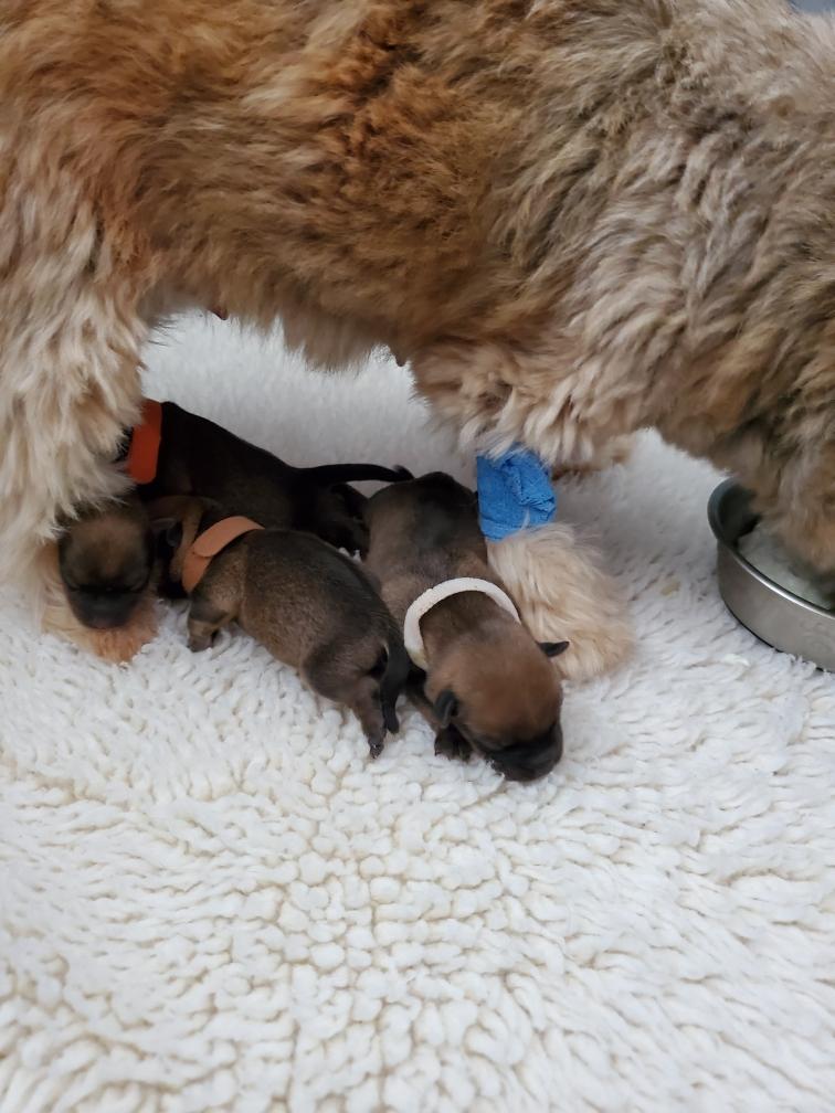 Here are the puppies, their birth weights, and you can read their morning weight on the scale. (I will be weighing the puppies twice a day for the first three weeks or so.) The vet school puts colored velcro collars on the puppies. I dislike this type of collar on puppies, preferring colored yarn. (Both have their advantages and disadvantages.) I will replace their collars in a day or so. Until I do, I will refer to each puppy by its current collar color and its future collar color.