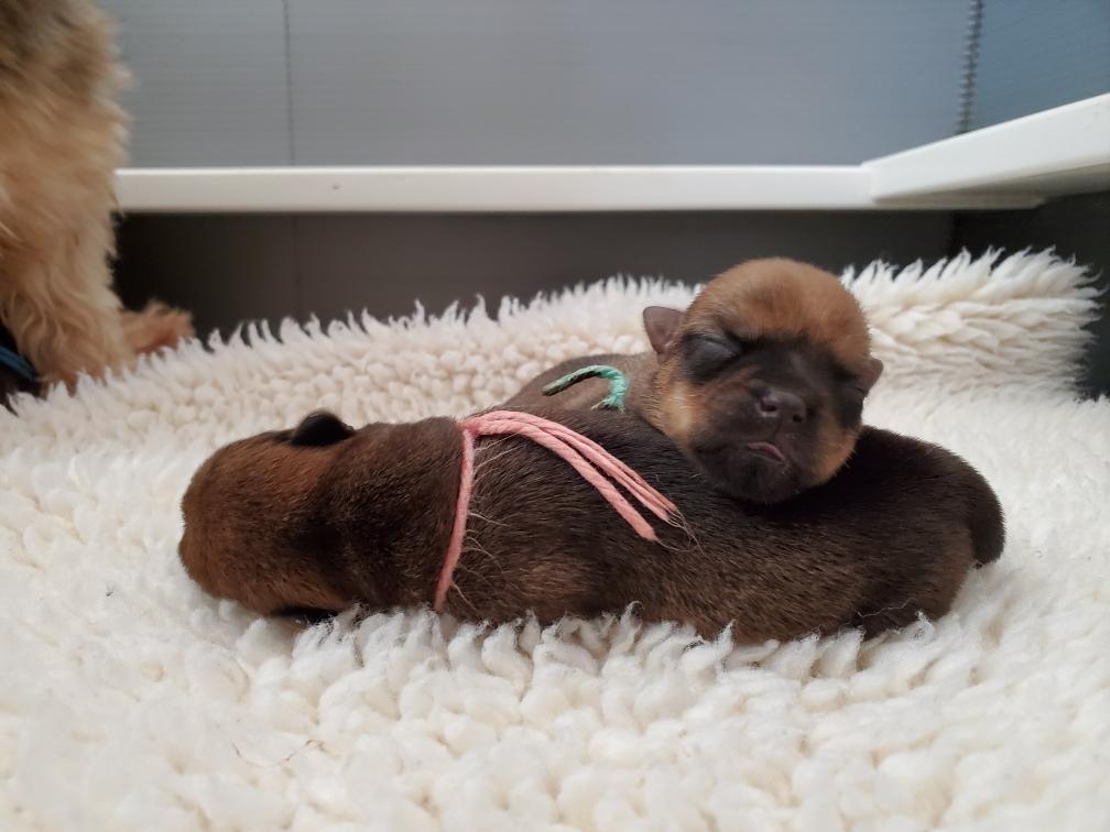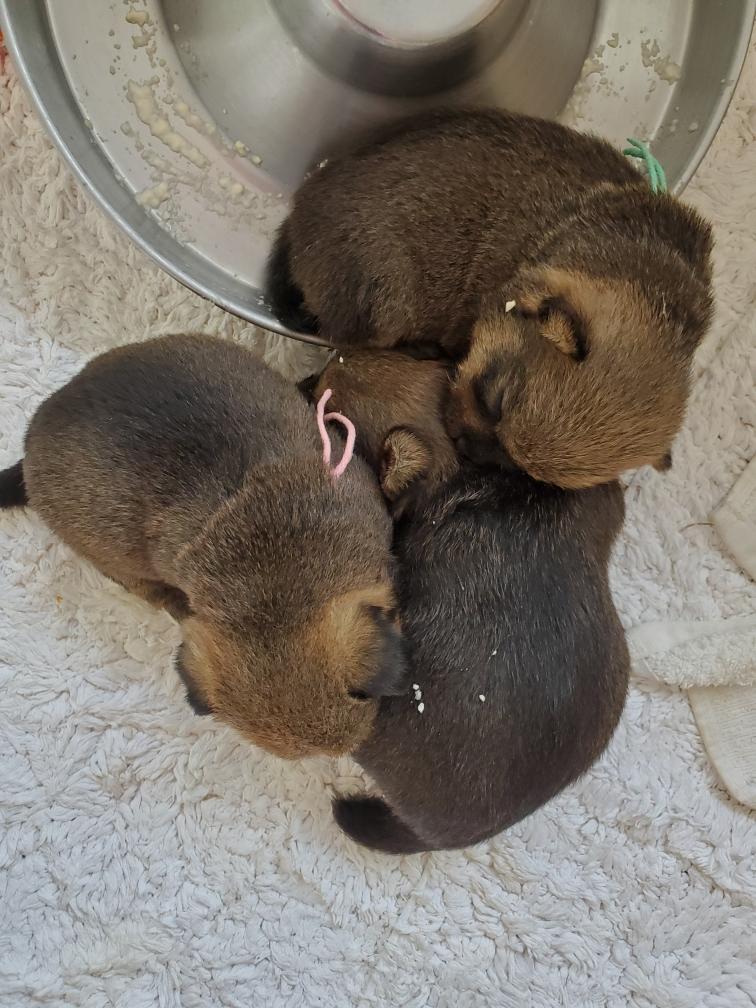 Green using her sister Pink as a pillow. Puppies are born blind and deaf, the only senses they have are feeling and smell. Their eyes open later (usually around ten to fourteen days after birth), and their ear canals open severals days after their eyes open.