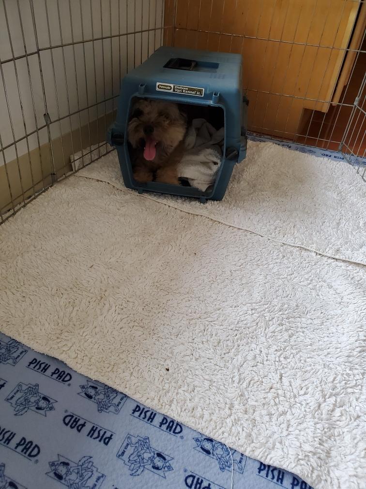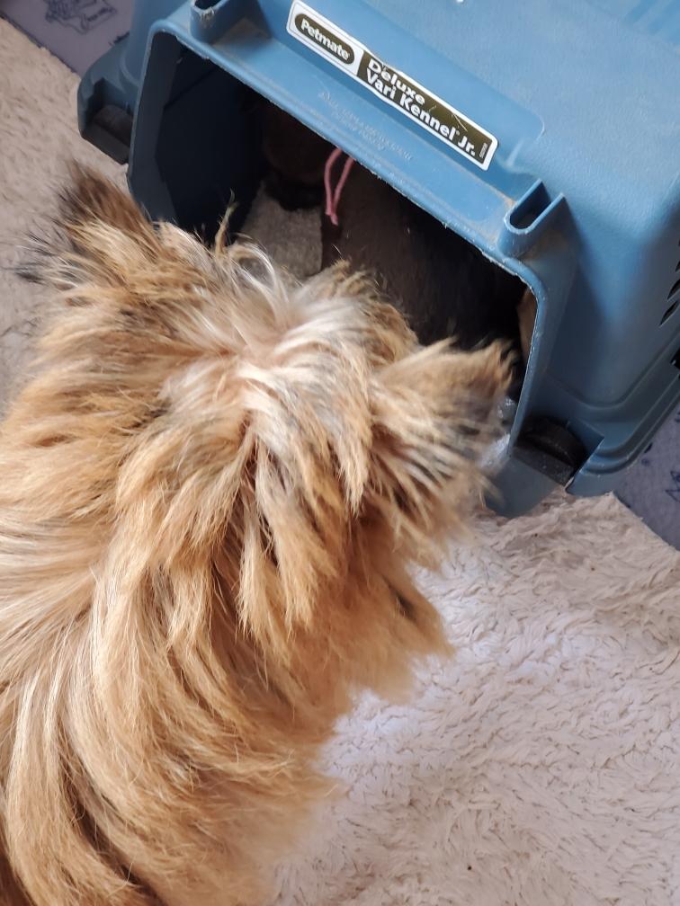 Polly checking out the crate in the playpen in my living room. I have set up the playpen for Portia and her puppy Gwynie to use as a whelping box. All my other dogs are coming home today.