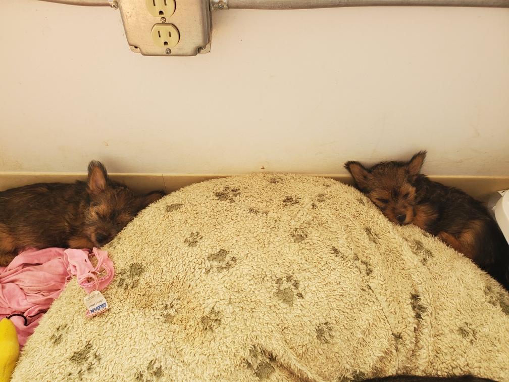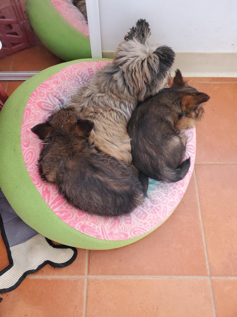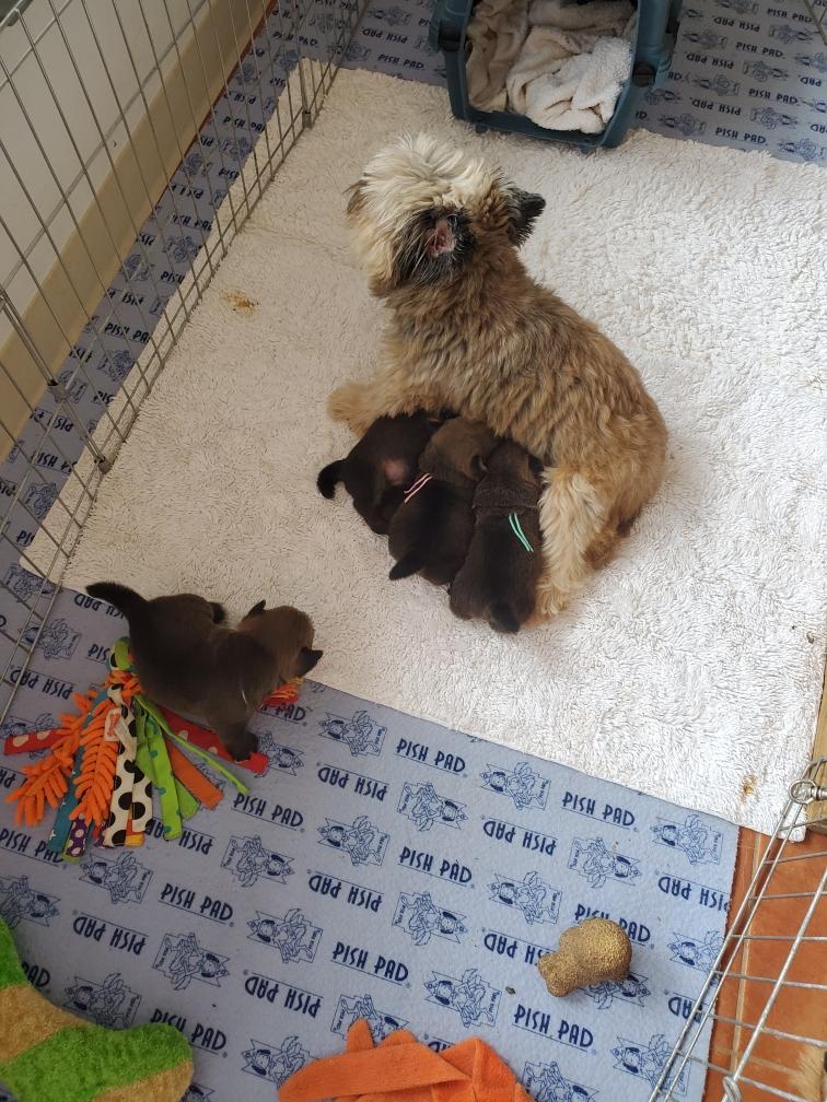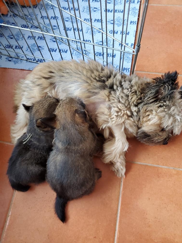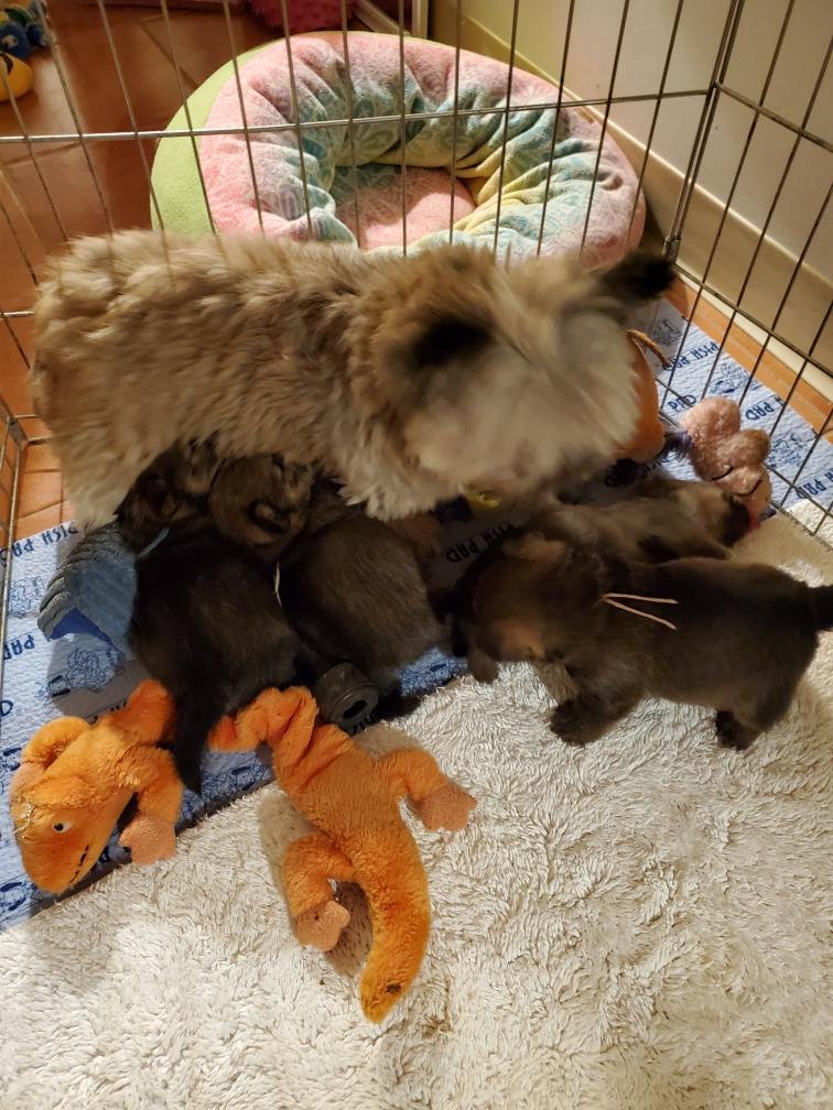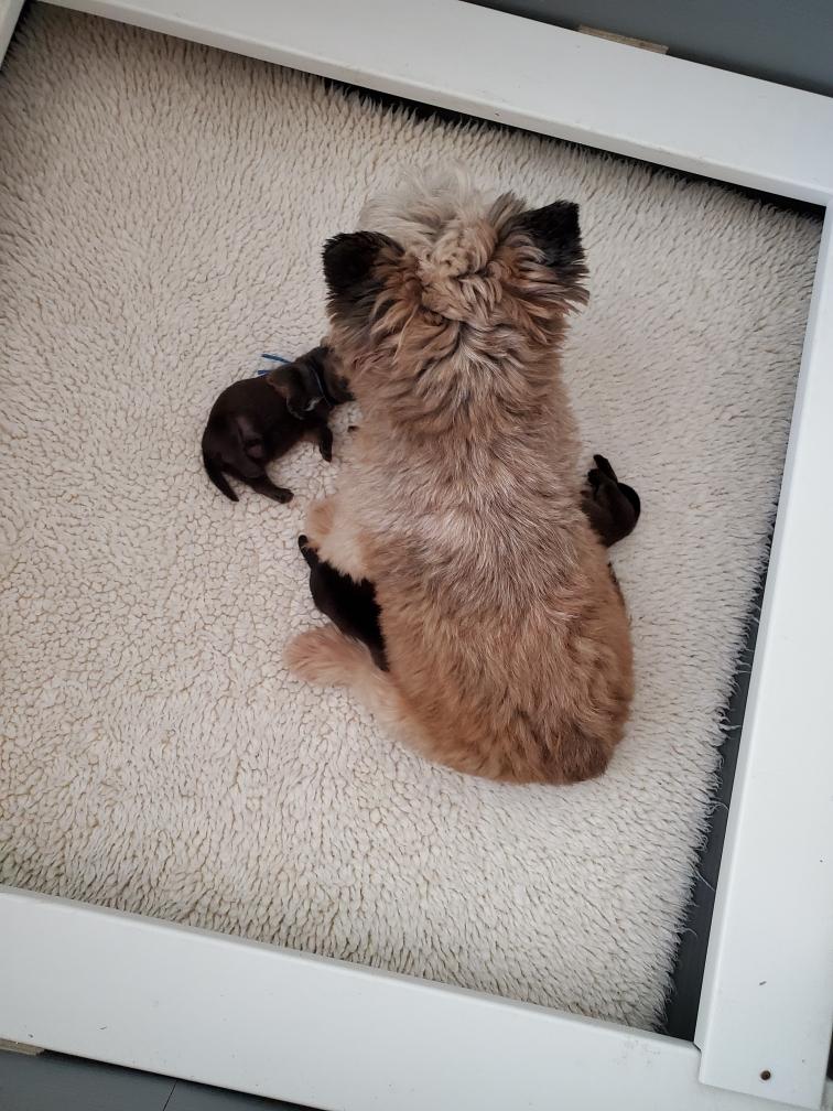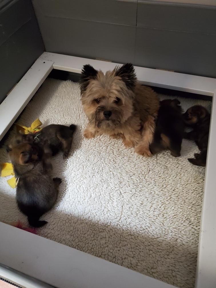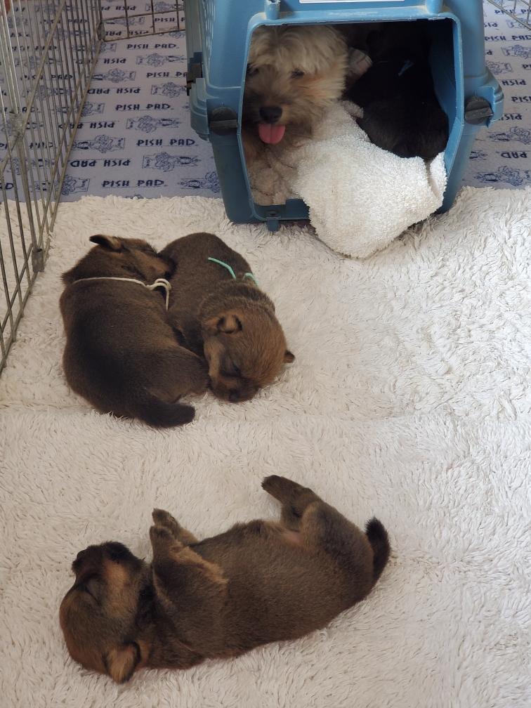 Polly and morning puppies. I can tell from the picture that it is morning because the puppies have not soiled the mats. Now that the puppies are bigger, Polly can not drink all their urine, so yellow spots appear on the mats during the day. And since I have started feeding the puppies - although the puppies are still getting most of their nutrition from their two mommies - Polly has said "Right, you clean up the messes." So add sanitation detail to my list of chores. This includes inspecting rear ends; and if necessary, cleaning any messy rear ends with a cotton ball dipped in warm water.