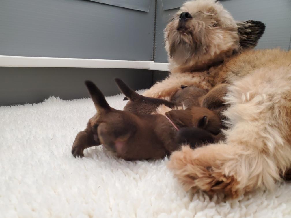 Portia has continued to nurse Polly's puppies. If you look carefully, you will see five puppies in the photo! (Polly's puppies and Gwynie). Hotspur telling Gwynie "You are in my spot".