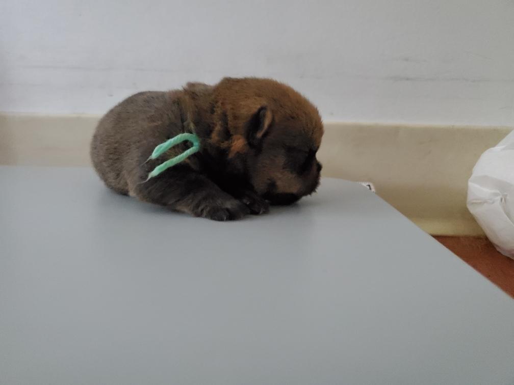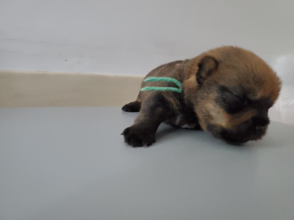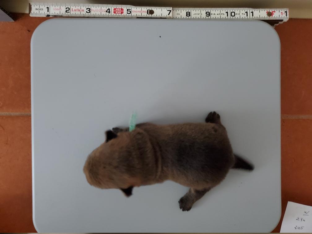 The boy White seems to be the explorer of the group. I always seem to find him crawling around the whelping box away from the others. He does not seem in distress, just on a mission. White is also leading the puppies in the race to gain weight. The girl Green is bringing up the rear, but gaining weight.