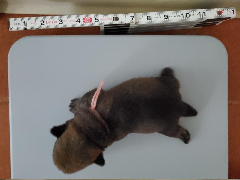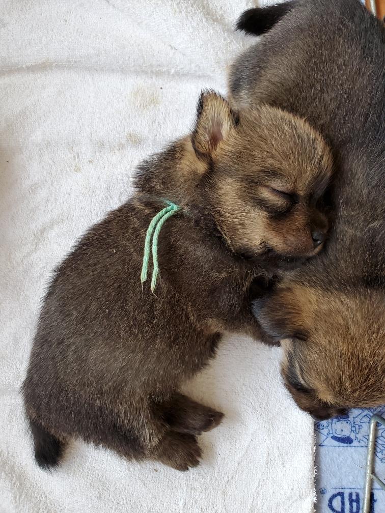A fan of puppies. One can clearly see that Green (on the far left) is smaller than her siblings. Pink joined the 400 gram club today, leaving Green as the sole remaining member of the 300 gram club. Green is now approximately 50 grams lighter than Pink. As long as Green continues to gain weight, I am not too concerned but I am watching Green's weight closely. Green's left eye seems all normal today, although I will continue to apply the antibiotic ointment for several more days.