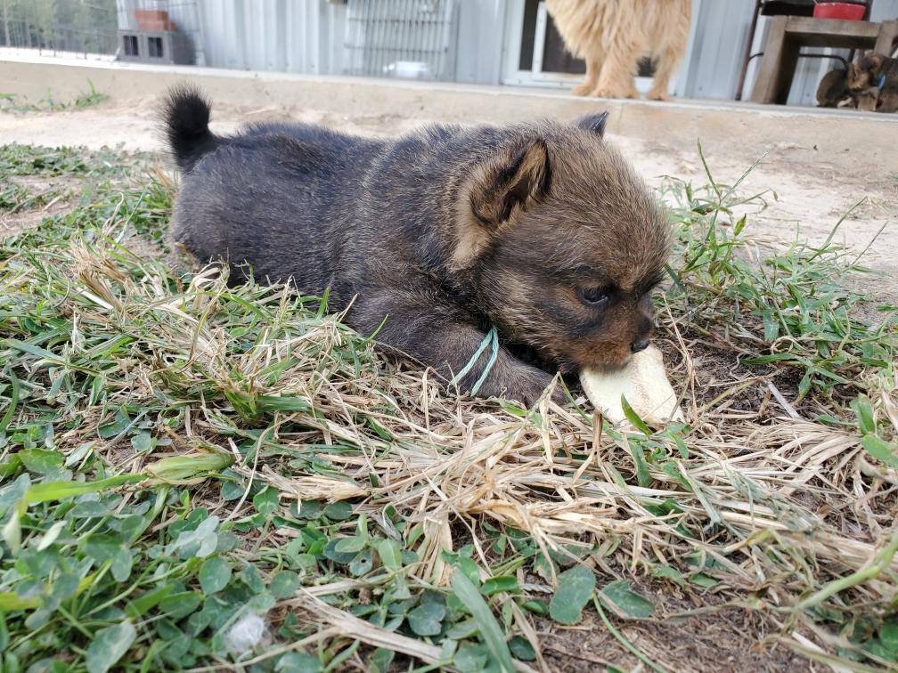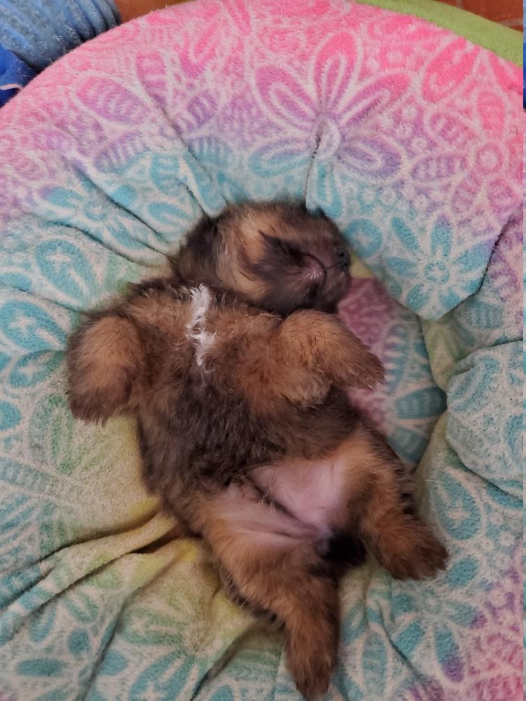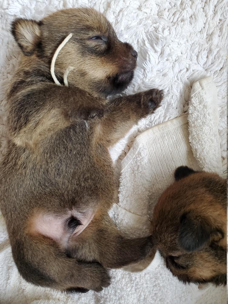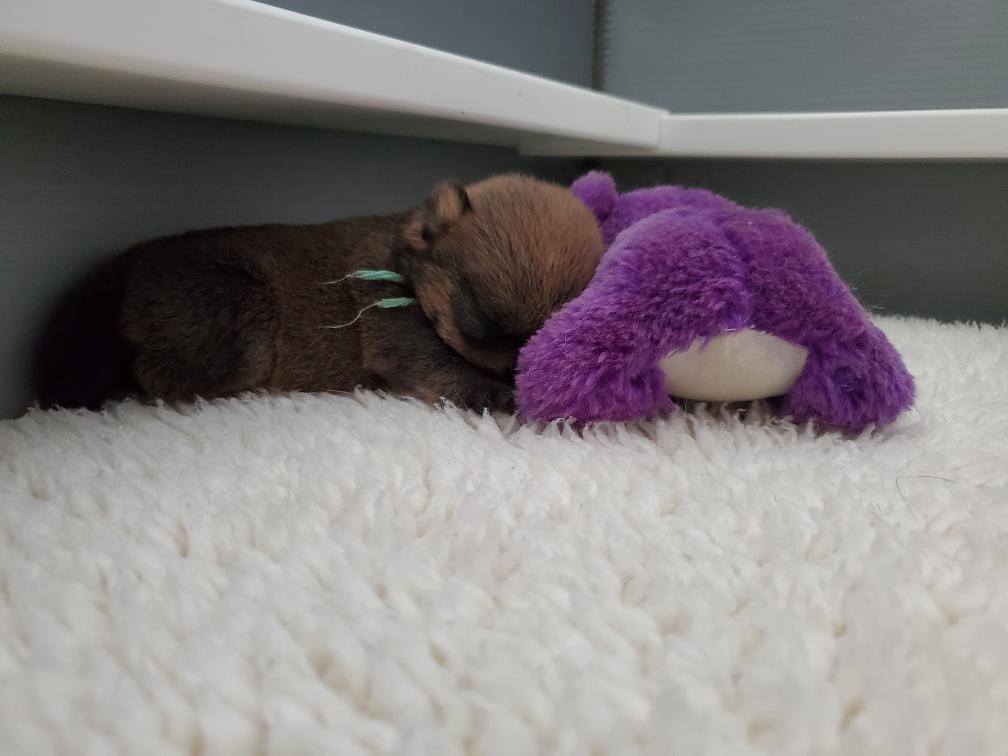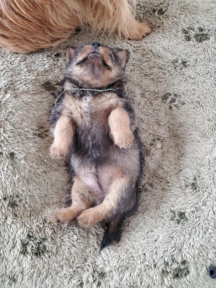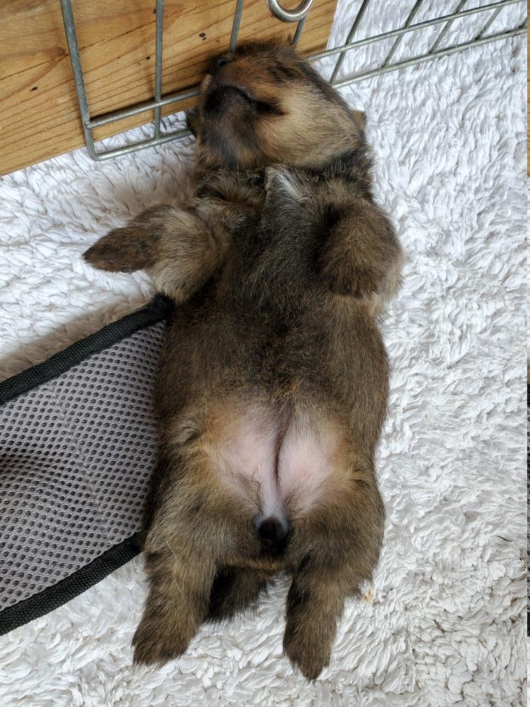 Blue is the first puppy to sleep on his back. The white patch on Blue's chest will "shrink" as he grows, until as an adult most likely the only white on Blue's chest will be a small line of white hairs.