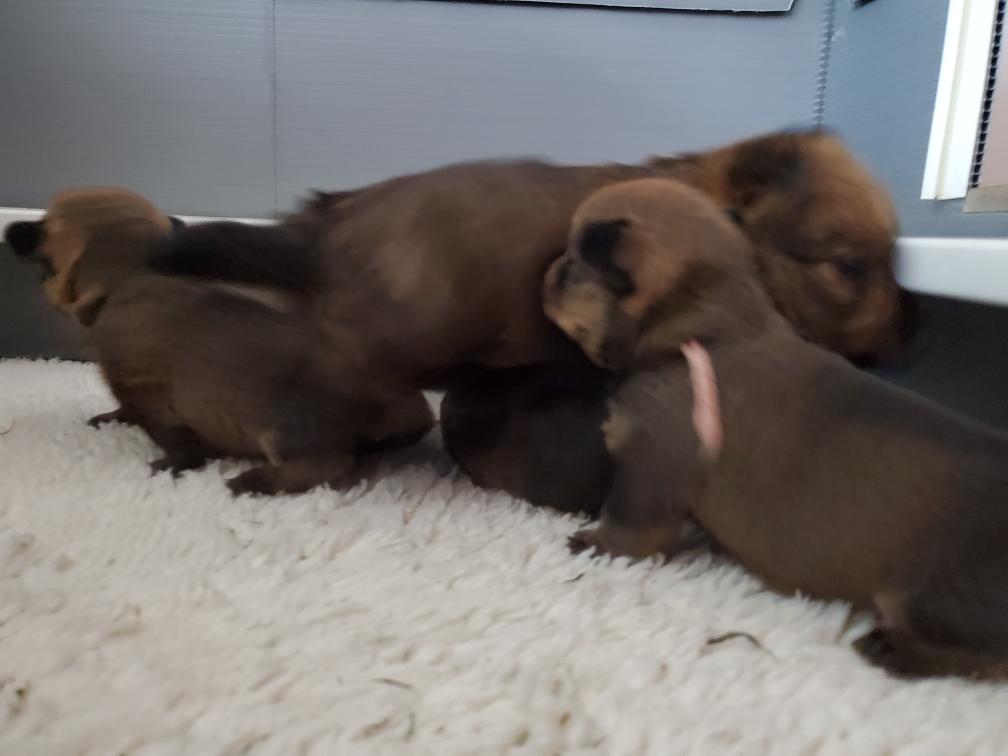 Polly nursing the puppies. It is getting crowded underneath Polly now that the puppies are getting bigger.