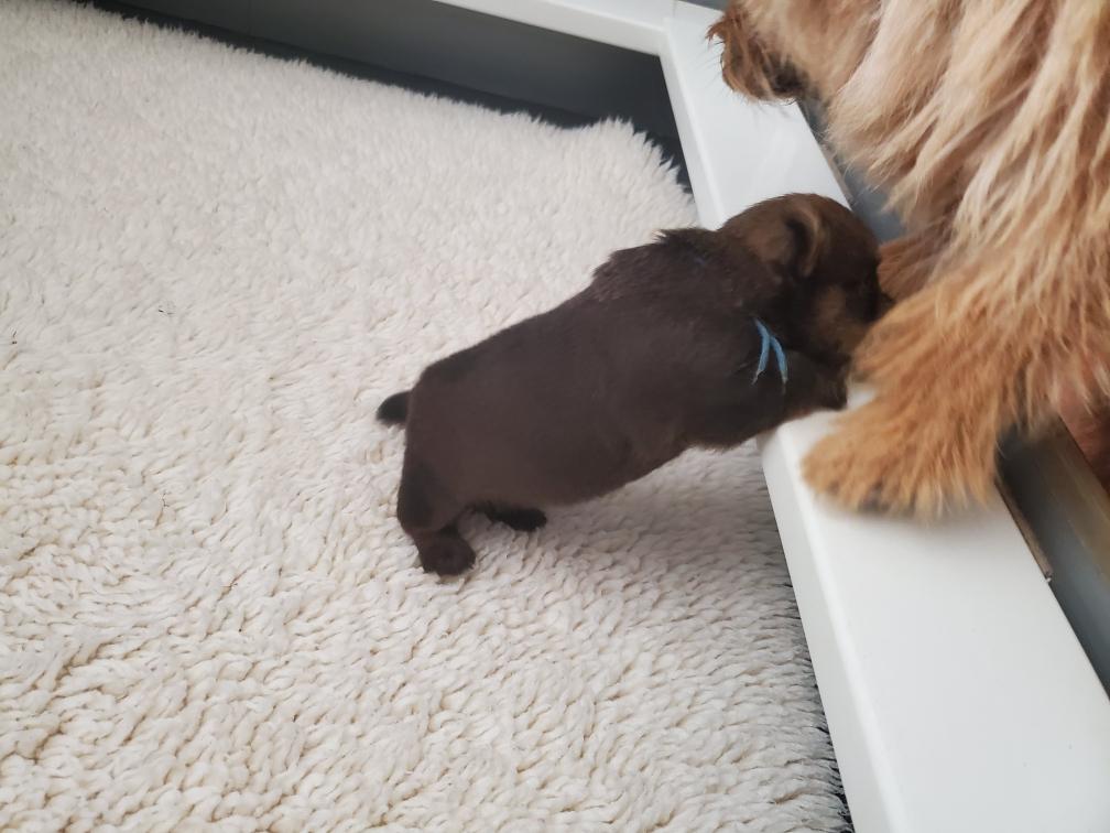 Hotspur is the first to climb over the wall (the wooden block) and get outside the playpen. Mortimer was a bit more cautious, but quickly followed. Both puppies were not sure what to do next and found my tile floor slippery. I put both back in the playpen. Hotspur took a long nap after his excursion.