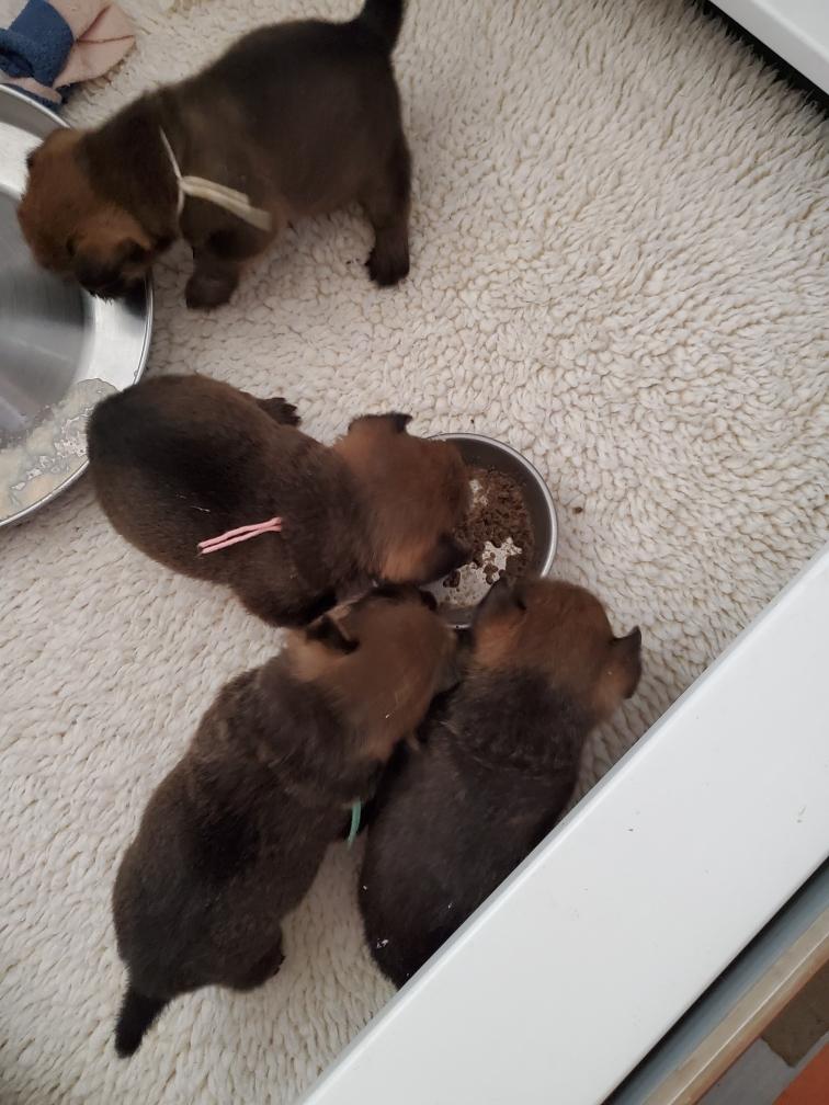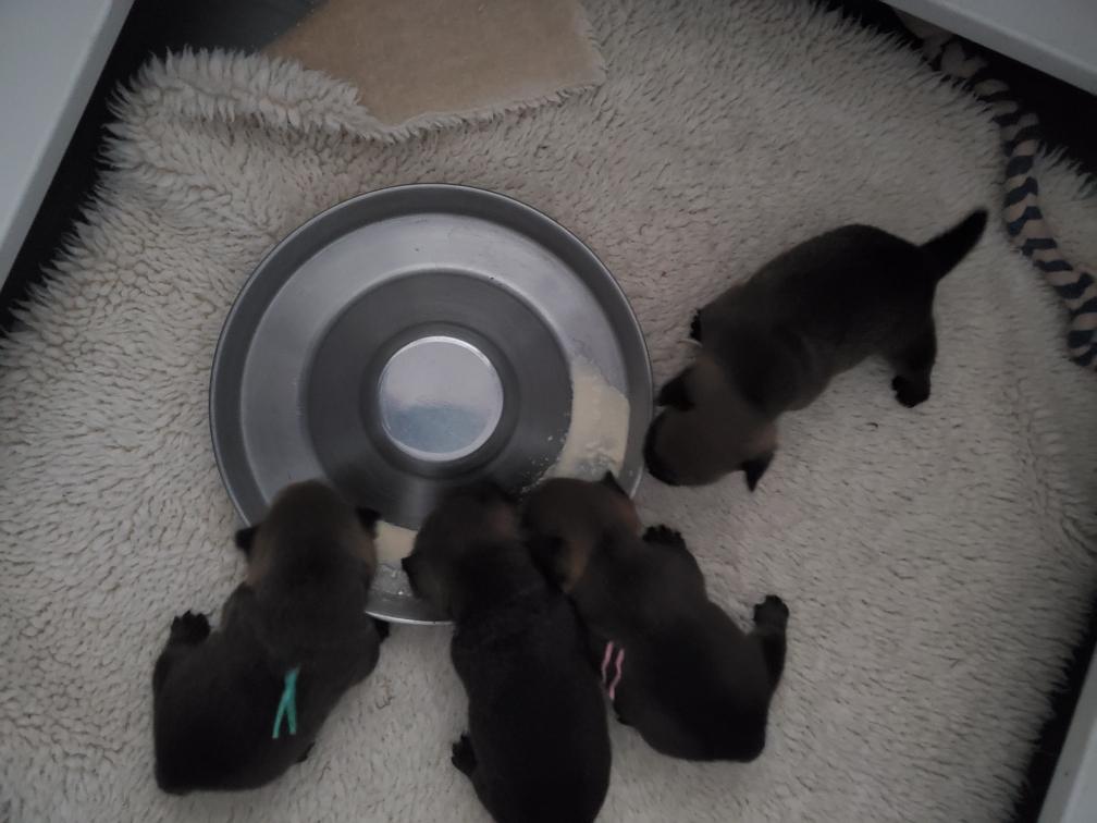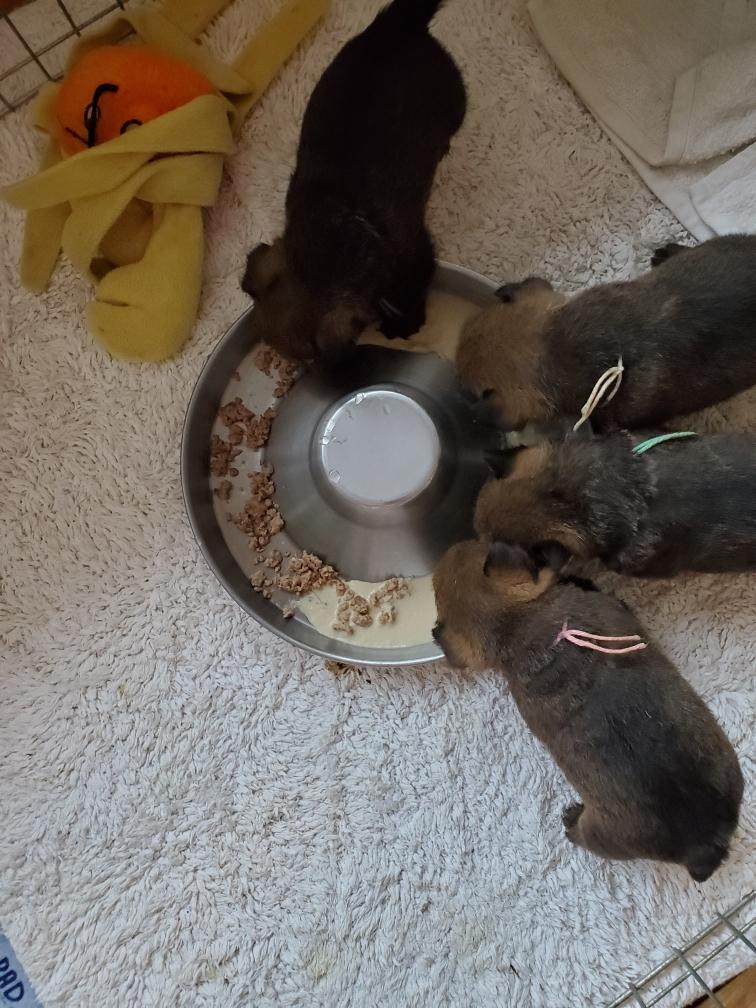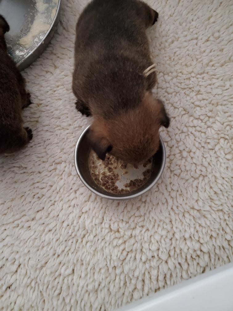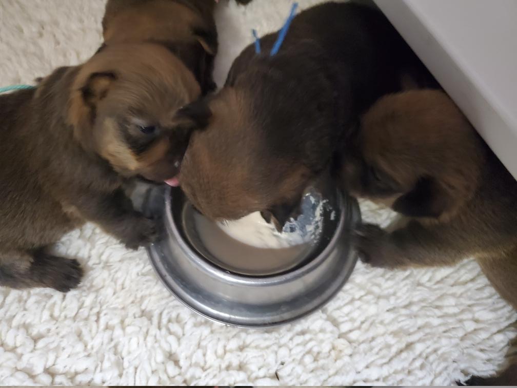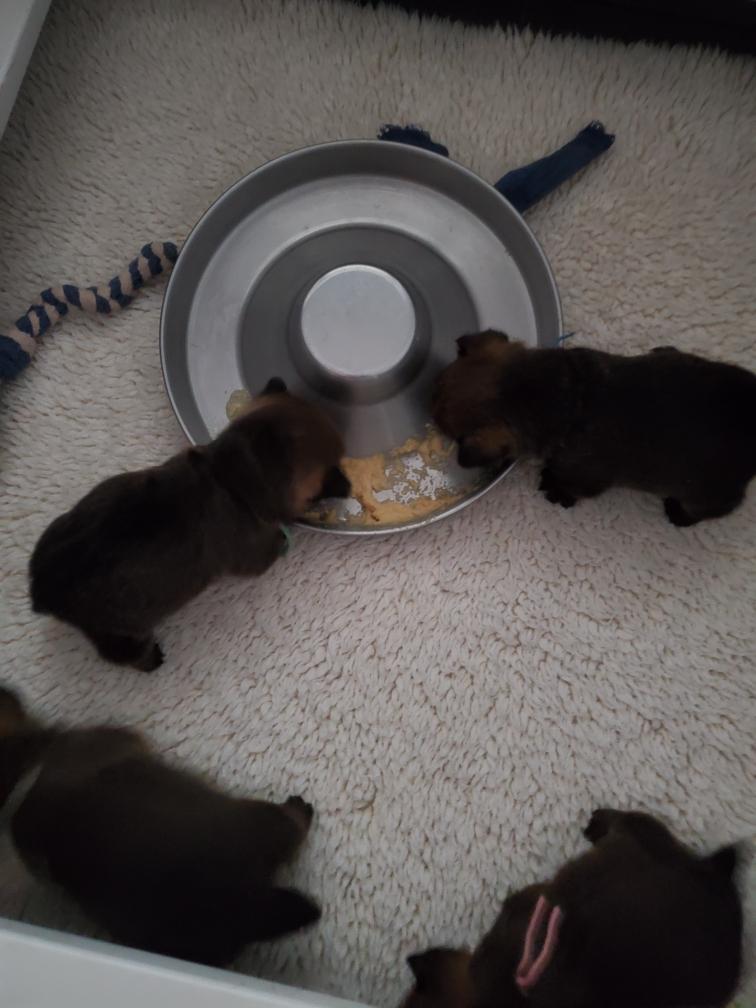 When Gwynie hardly touched her evening meal of "gruel", as an experiment I put the bowl in the whelping box with the puppies. The puppies thought this was a great present and cleaned the bowl! I have never had puppies so young interested in food.