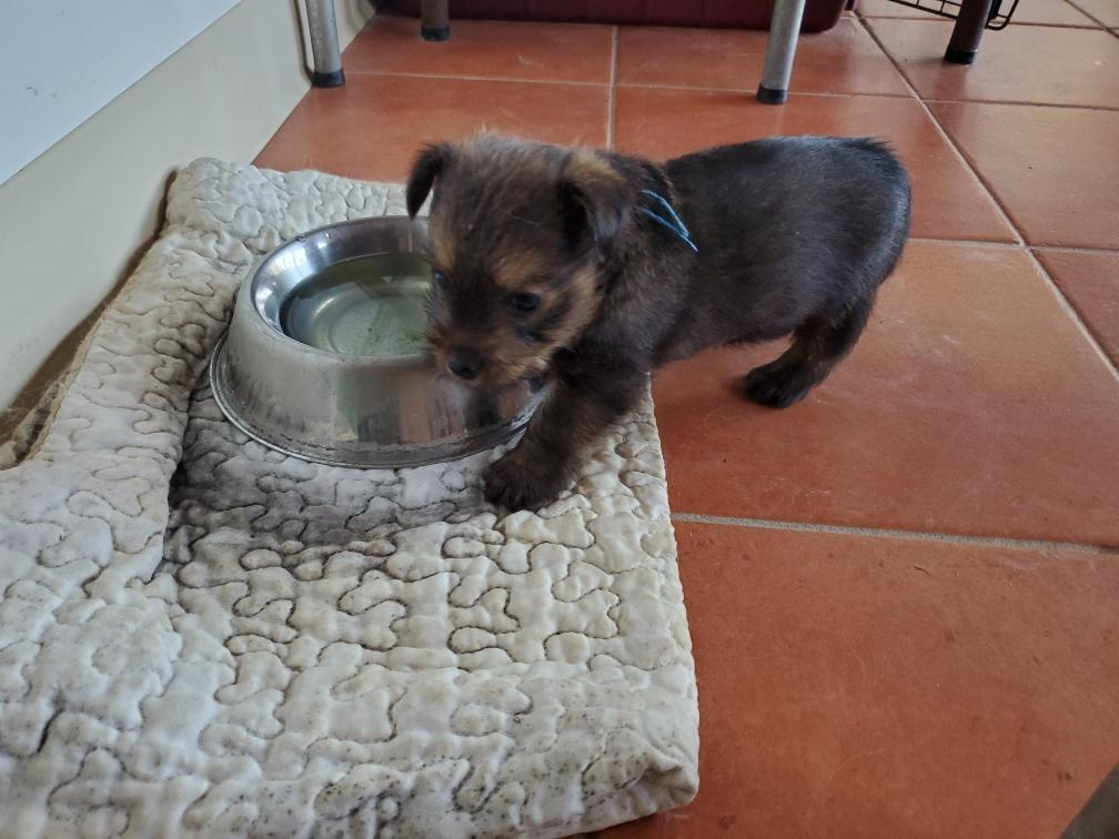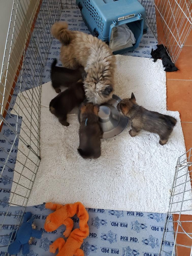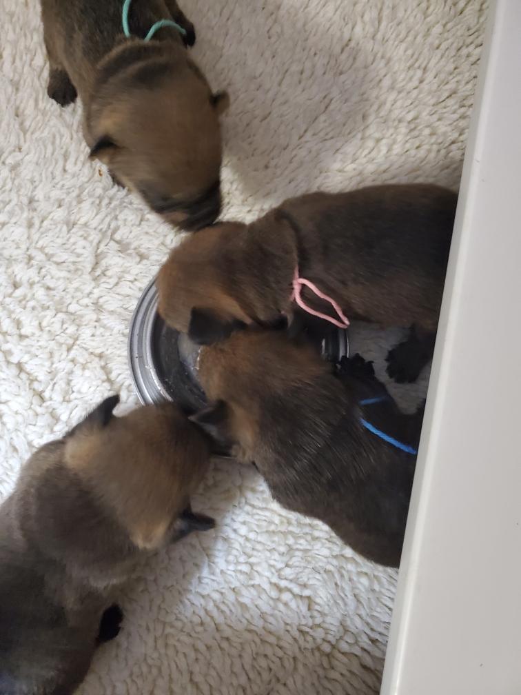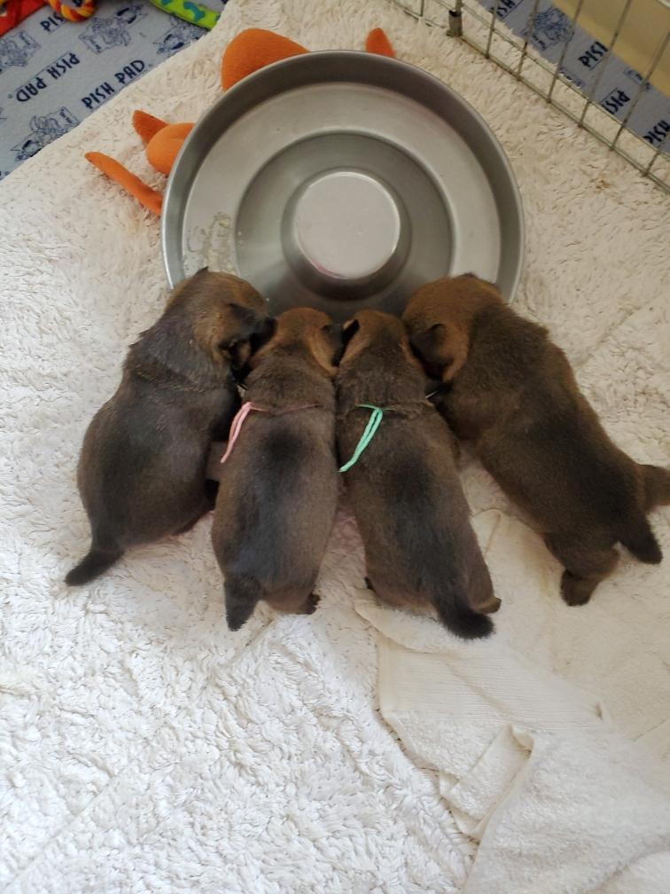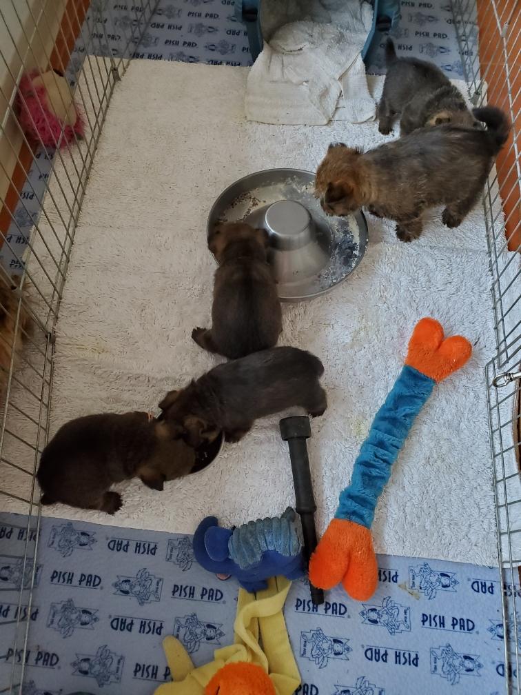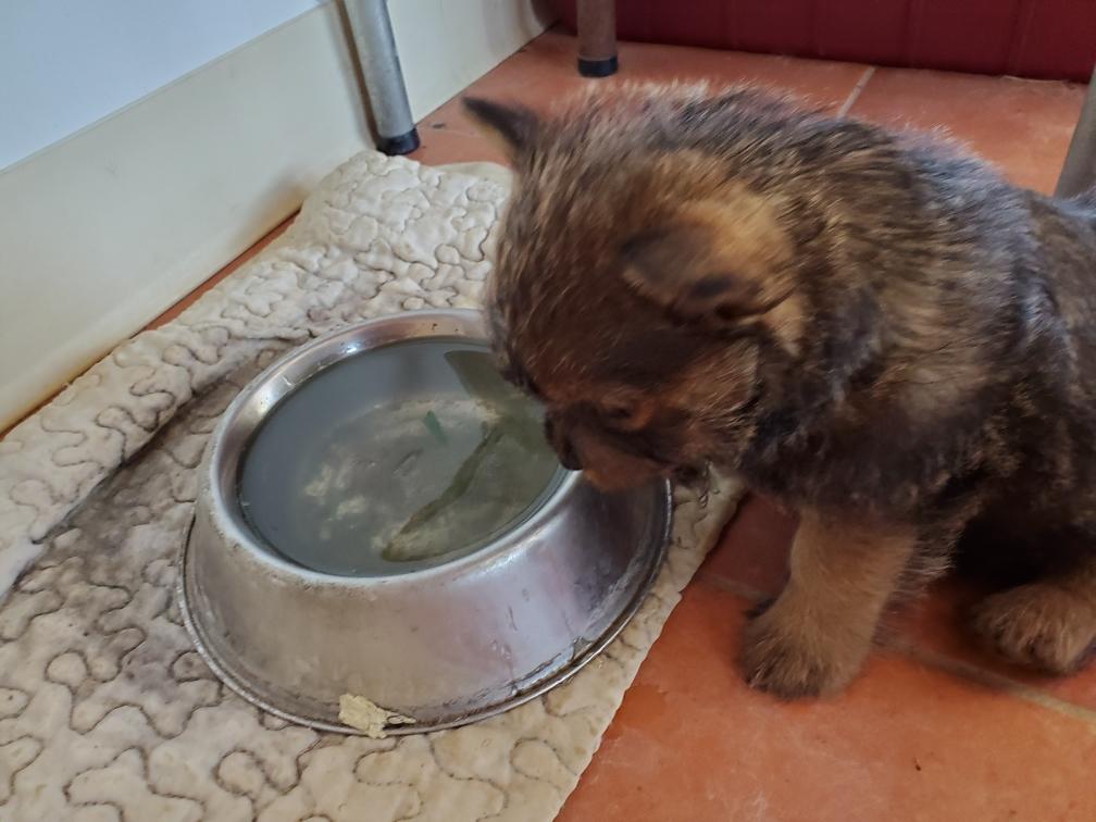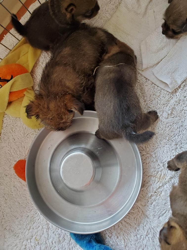 When Gwynie hardly touched her evening meal of "gruel", as an experiment I put the bowl in the whelping box with the puppies. The puppies thought this was a great present and cleaned the bowl! I have never had puppies so young interested in food.