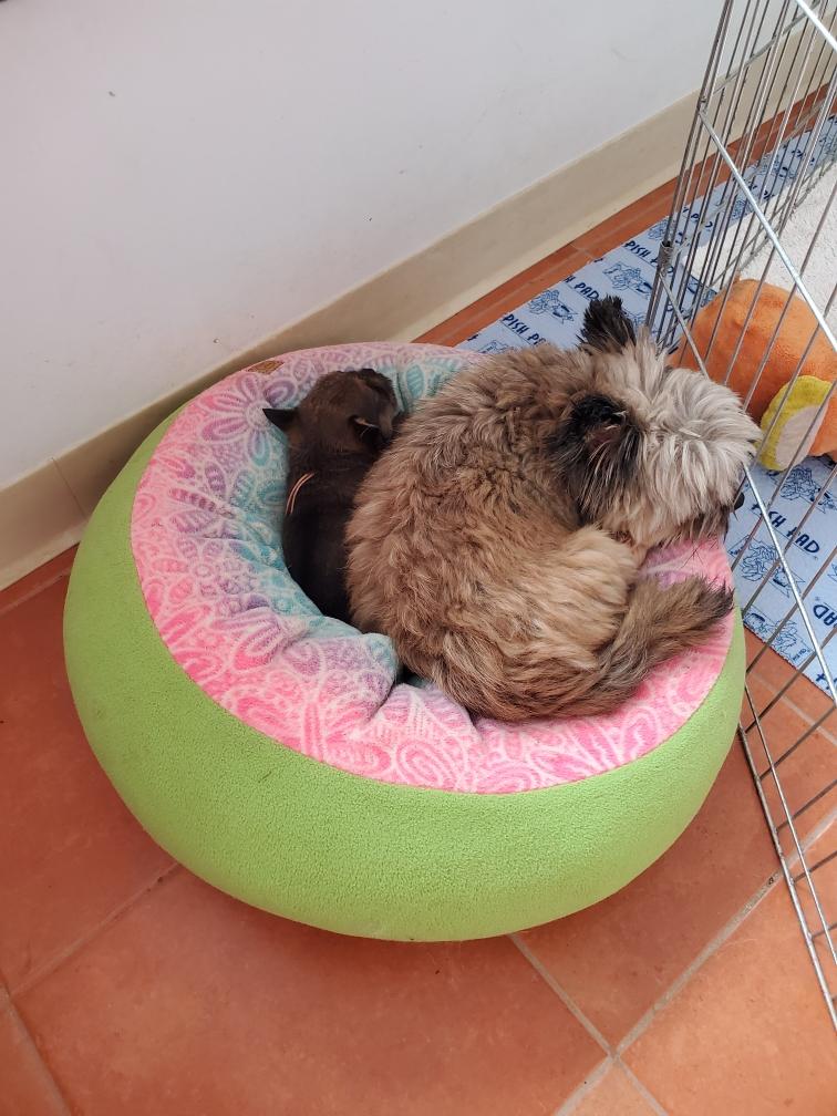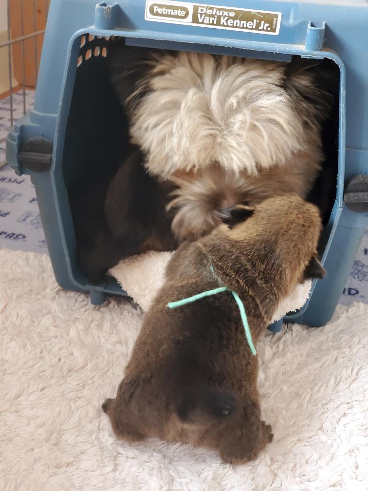 Ten-month old cousin Ophelia is also getting in the whelping box to play with the puppies. Here is Kate checking if Ophelia makes a good pillow.