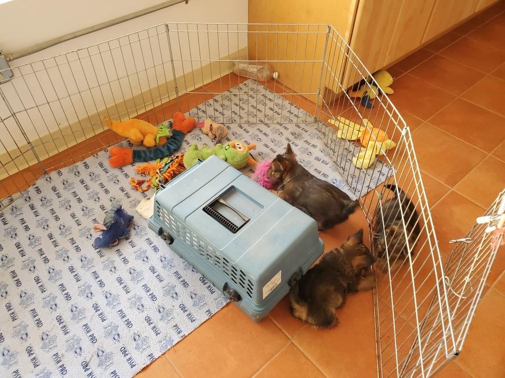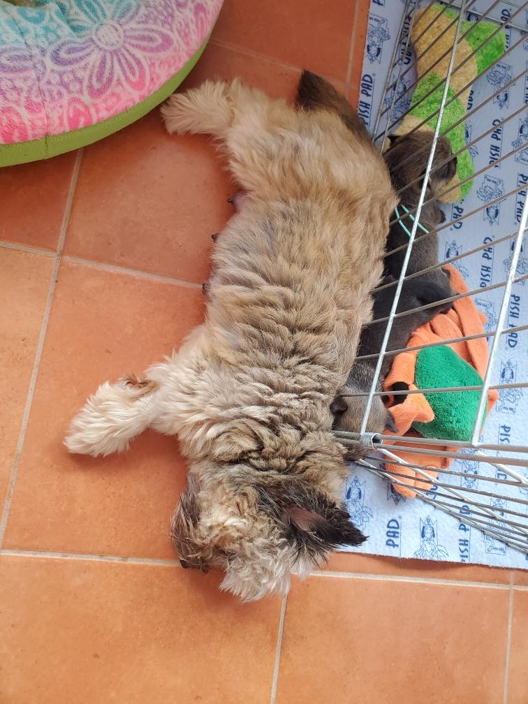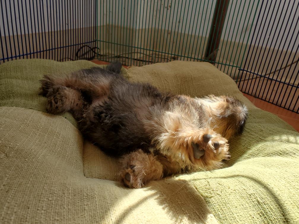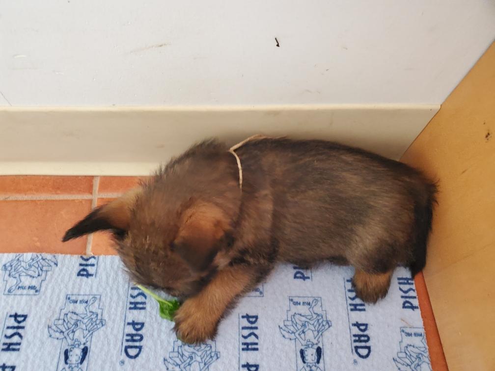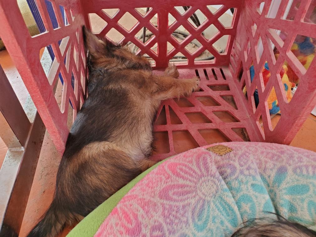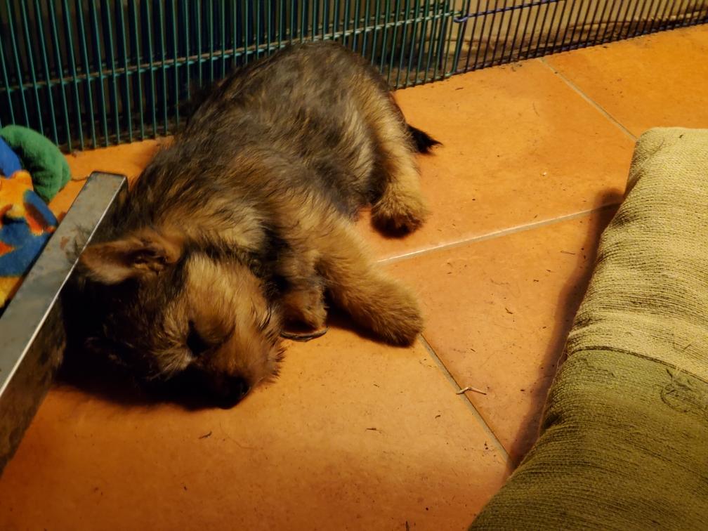 When in the playpen, the puppies often sleep inside a dog crate whose door I have taken off. Catrin was sleeping outside the crate.