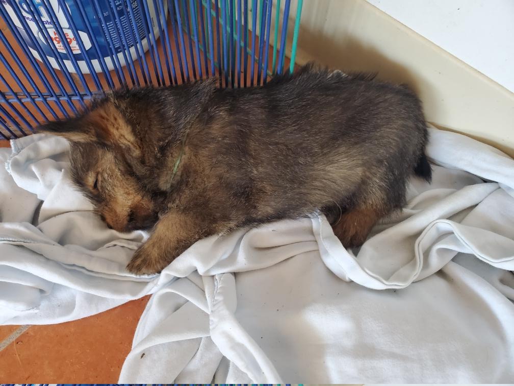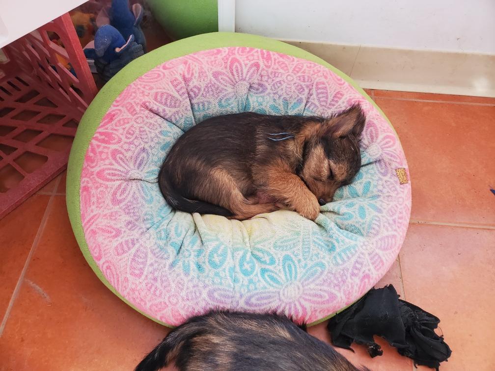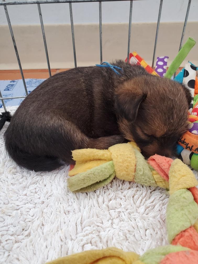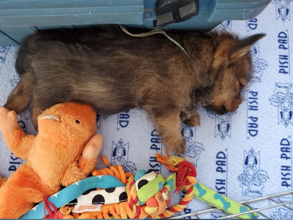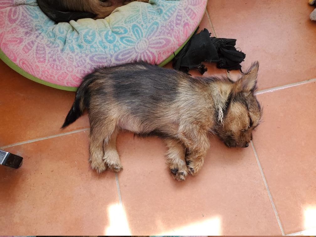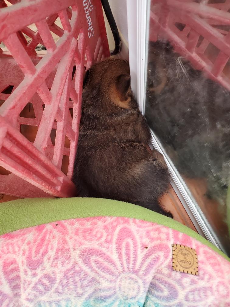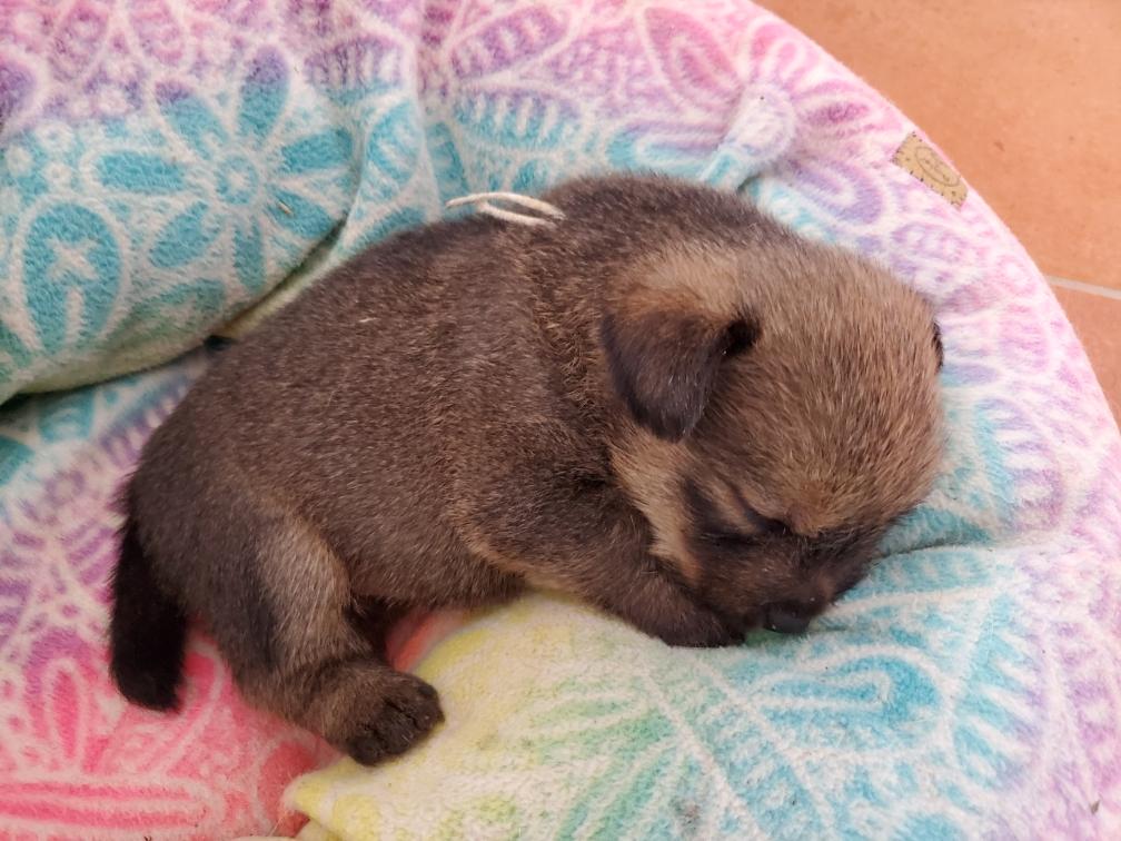 When in the playpen, the puppies often sleep inside a dog crate whose door I have taken off. Catrin was sleeping outside the crate.