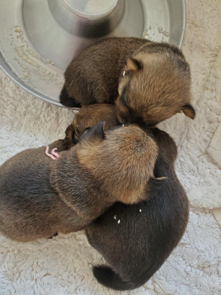 Note Catrin, who has fallen asleep in the feeding pan! The white specks are some baby rice that the puppies have gotten on them. Dinner was such a success that I fed the puppies another meal just before bedtime, which they gobbled down. So going forward I will feed the puppies four times a day.