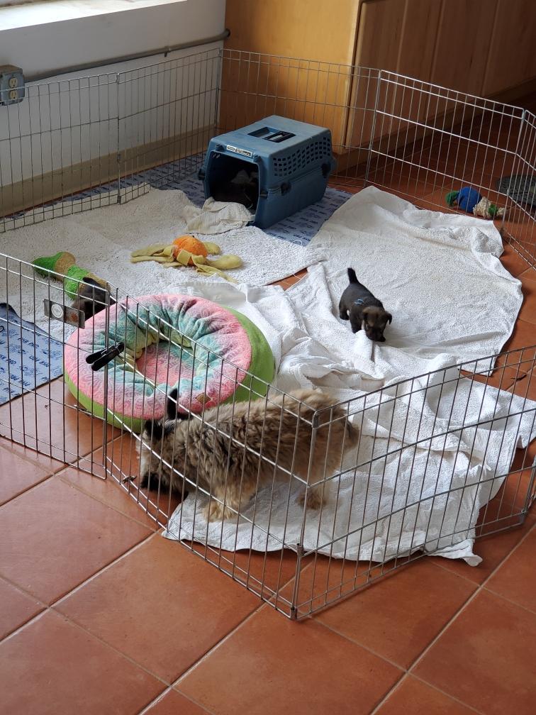I moved the puppies out to the playpen in my living room for the day. There was much concern about this move from both Polly and Portia. At first the puppies did not want to come out of the crate. Or wanted back in, like Catrin here. And throughout the day, the puppies would occasionally realize that they were not in the whelping box and would sing out their displeasure at this change of venue.