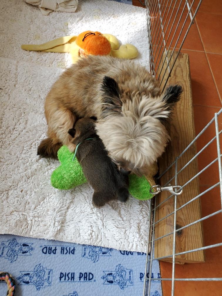 Blue has learned the most efficient way to get milk. Blue sleeping next to the purple bunny.