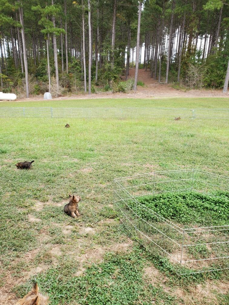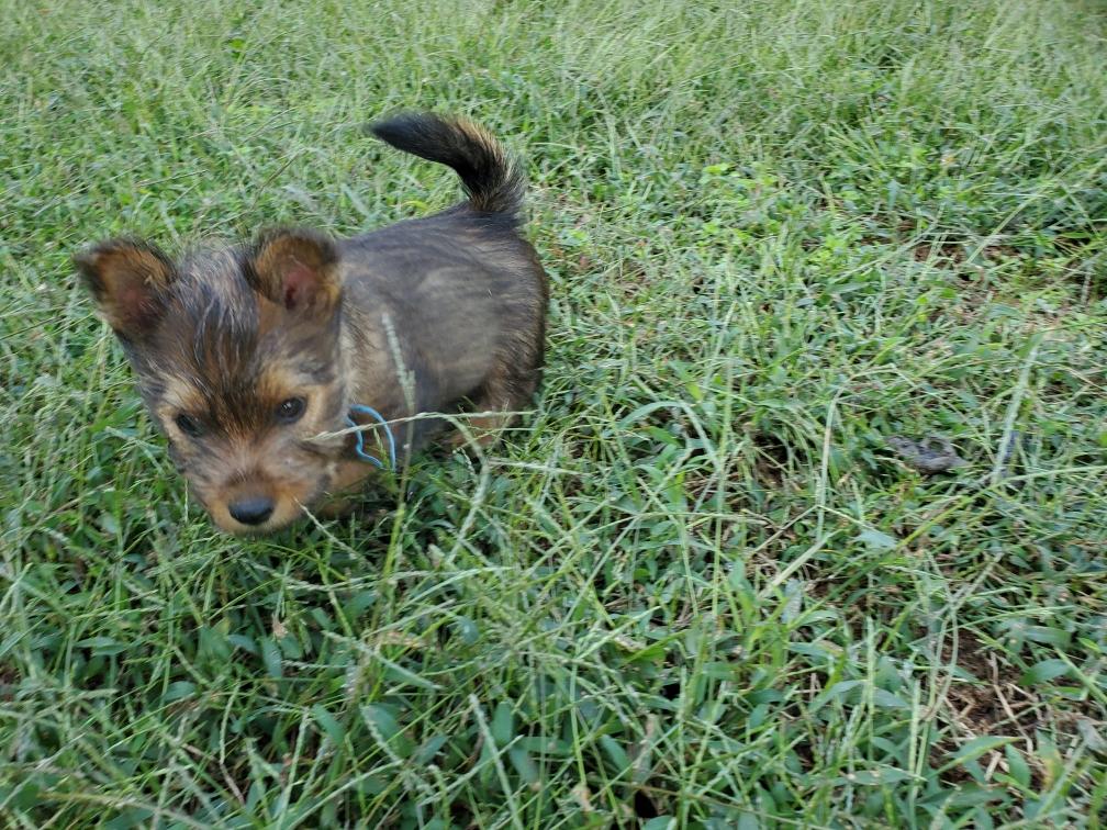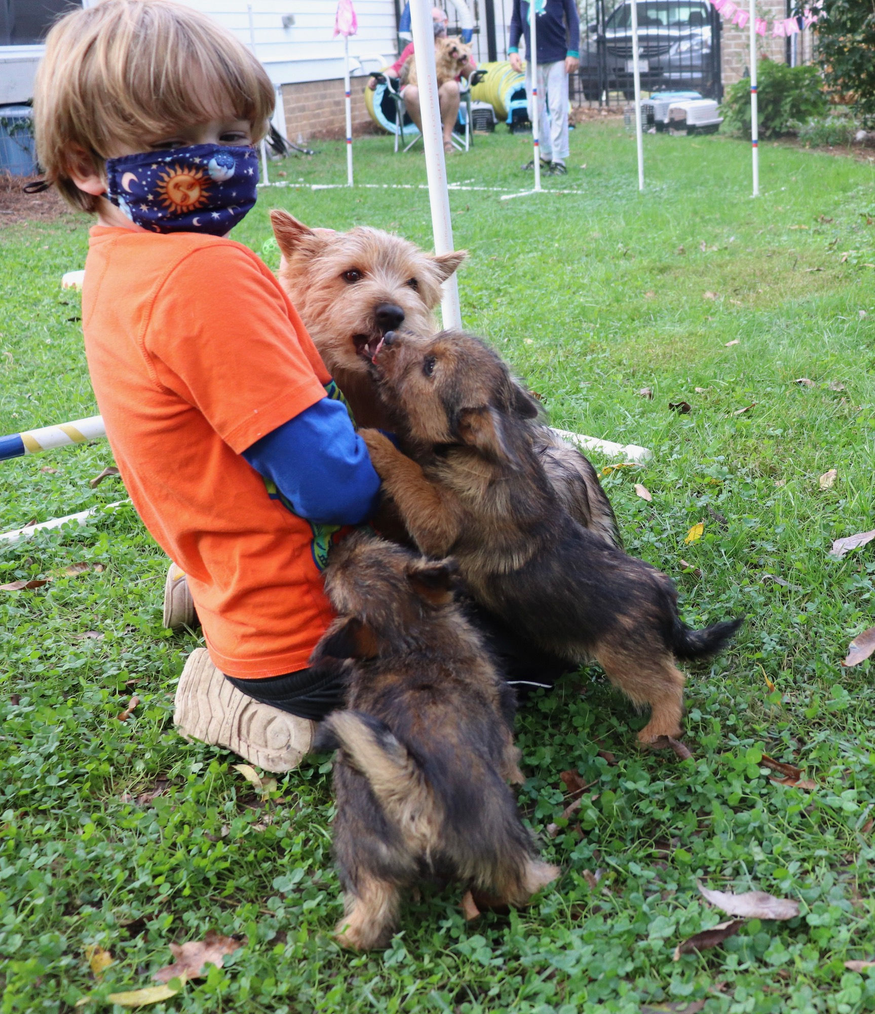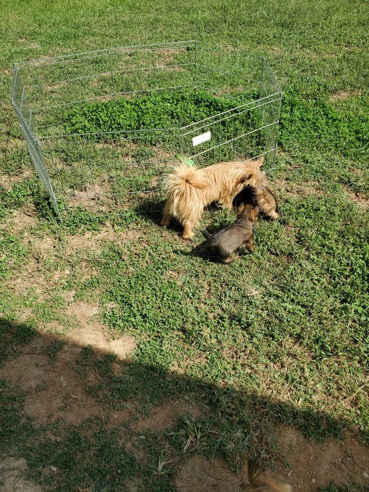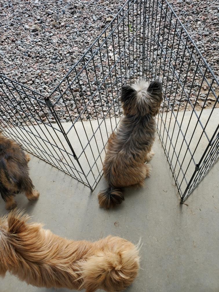 Hotspur surveying lands to conquer. (The puppy pan is in the middle of the floor so that the older dogs will clean it before I give it a wash.)Jennifer and Keith, their niece Rosalind, and their two Norwich came to visit today to see the puppies. So the puppies had their first trip outside where we were sitting.
