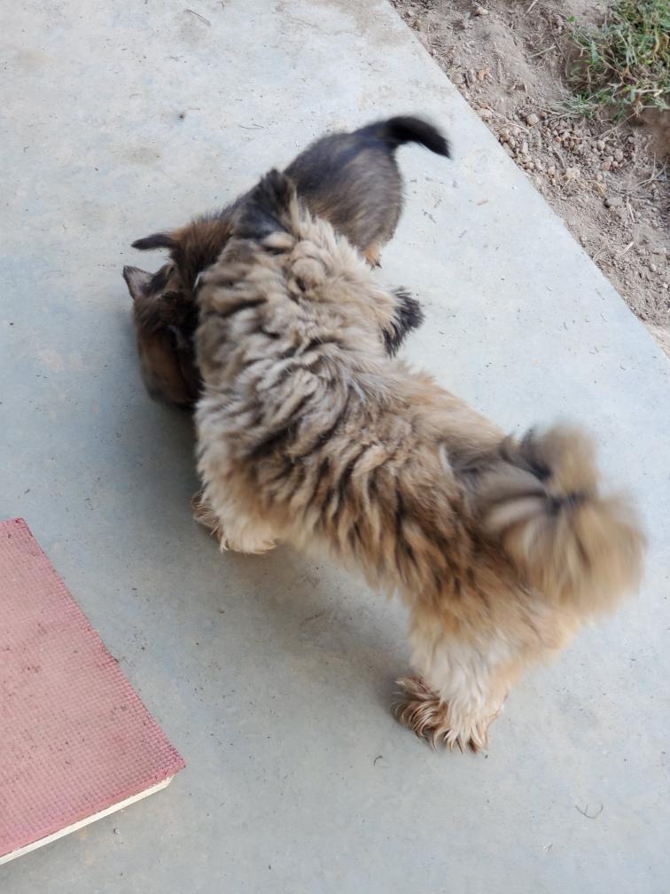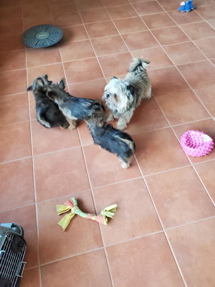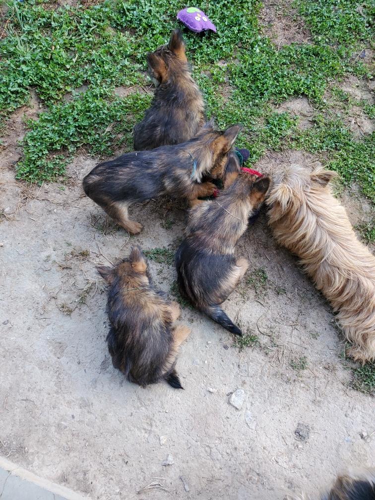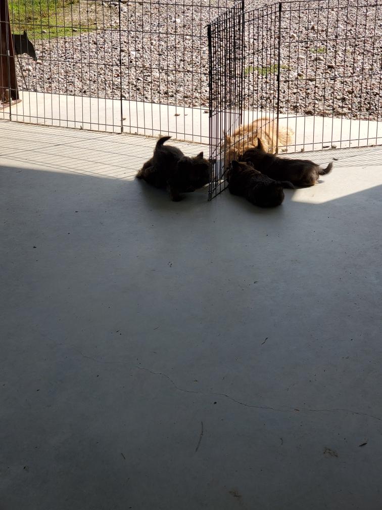 Puppies playing watched over by second-mommy Portia with cousin Ophelia in the background.