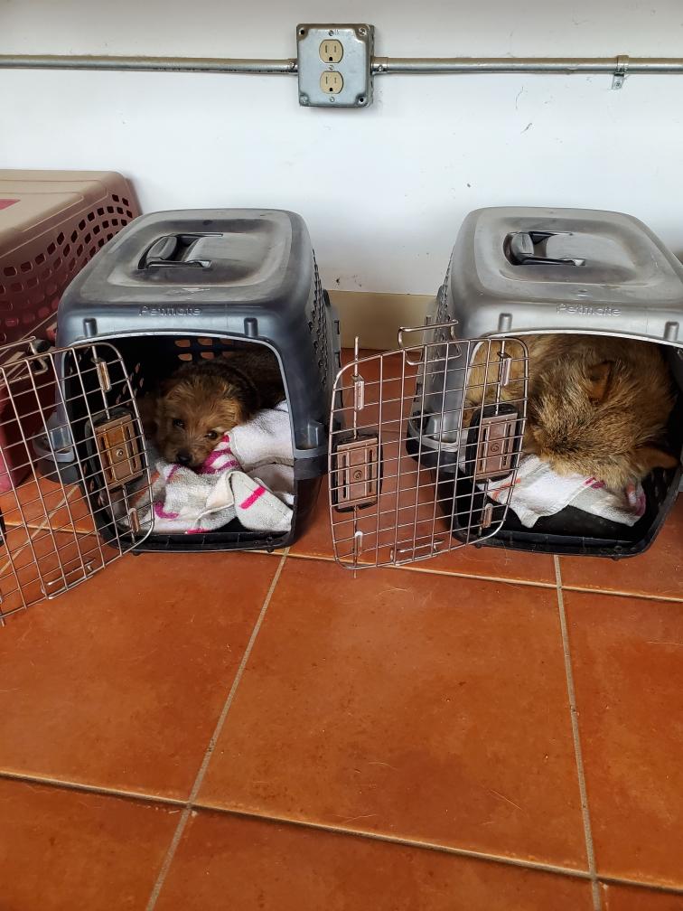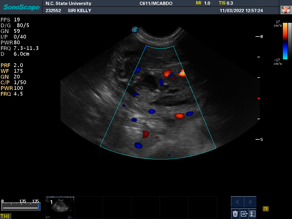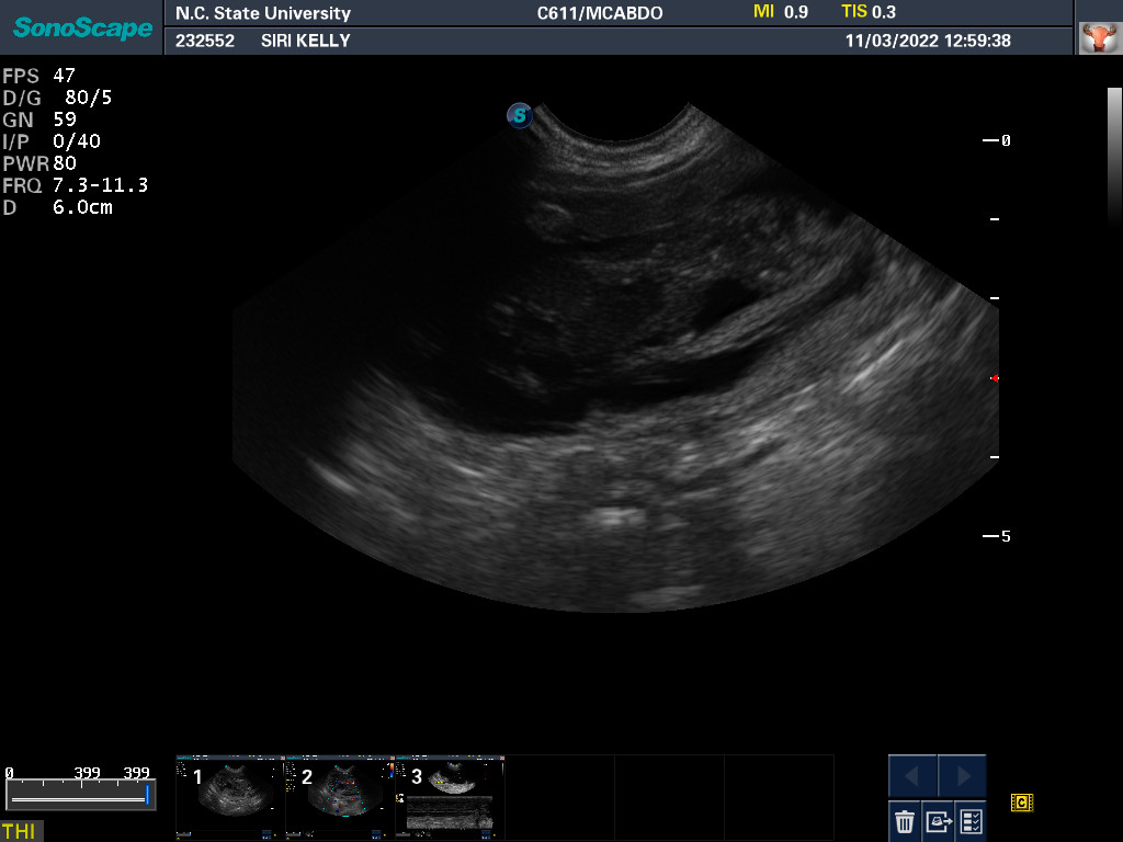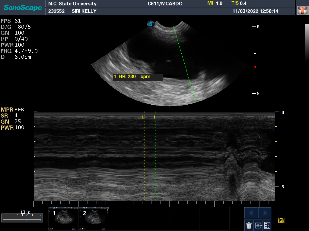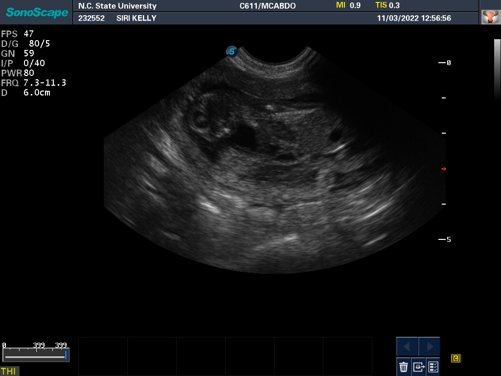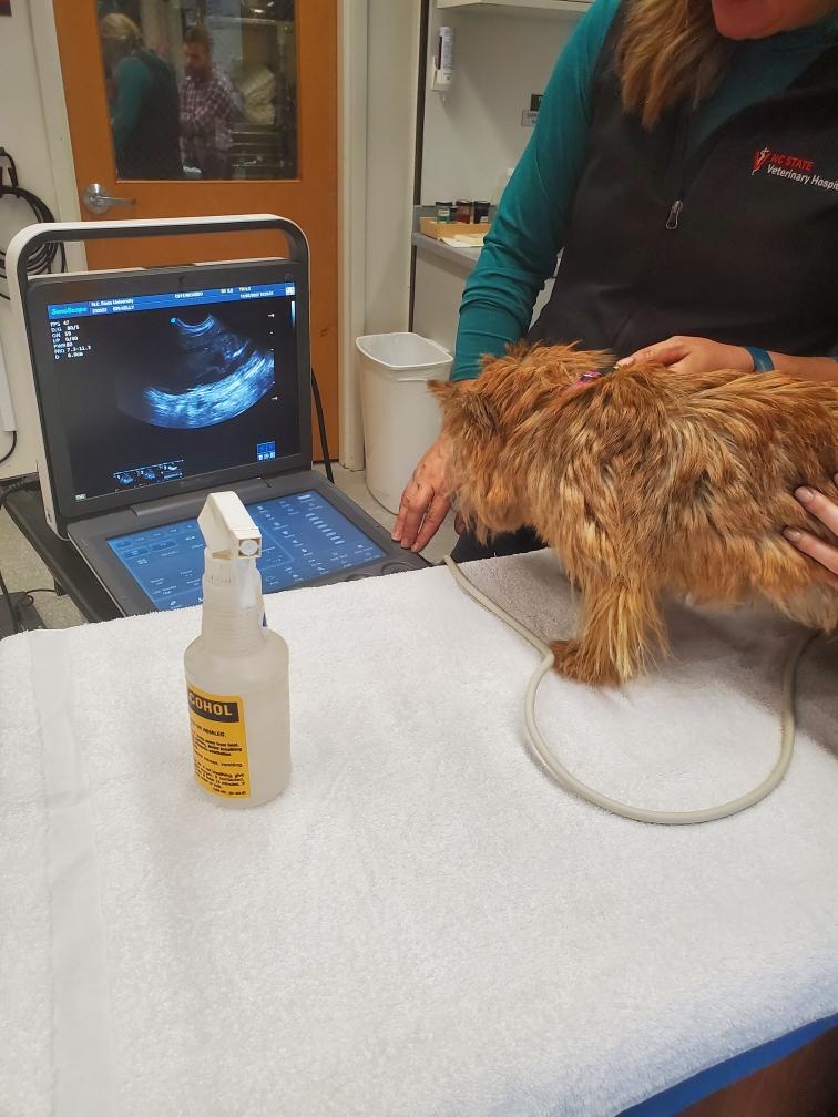 By measuring the size of the puppies' skulls and the width of Siri's pelvic opening, it was determined that the puppies should be able to fit through Siri's pelvis. Thus Siri might be able to have the puppies naturally (free-whelp), rather than needing a cesarean section (c-section). The rule of thumb is that if there is only one puppy, a c-section is almost always necessary; whereas if there are three or more puppies, one should try to free-whelp. If there are only two puppies, it is not clear what to do.