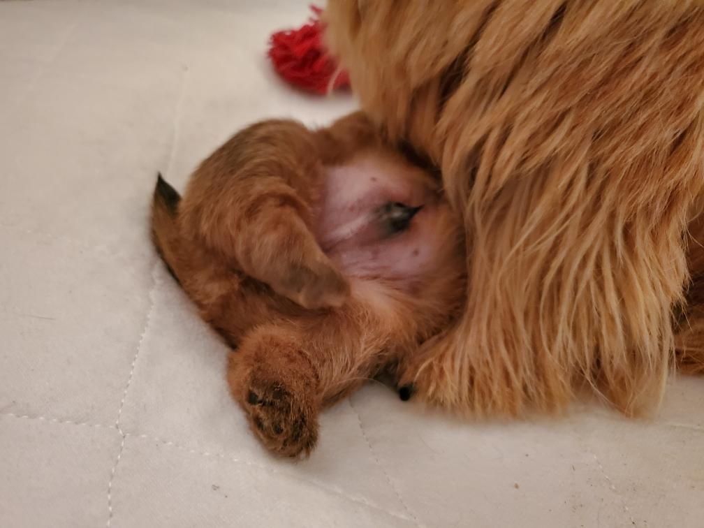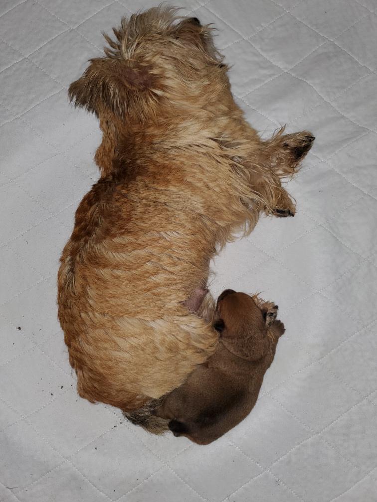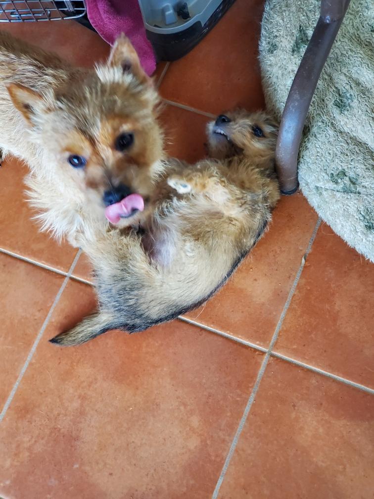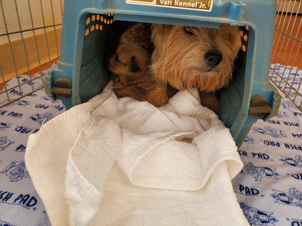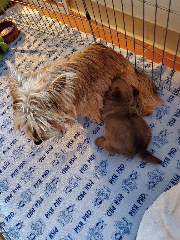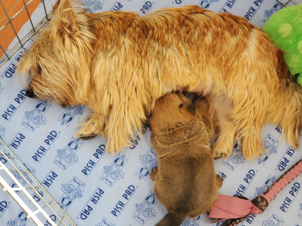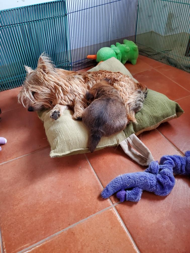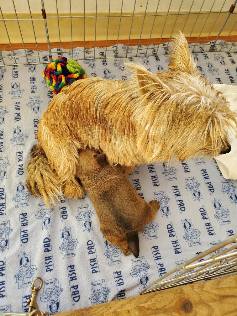 White nursing. I feel embarrassed about my "shaggy" Norwich. But I still do not want to stress Siri by stripping her until White is a bit older.