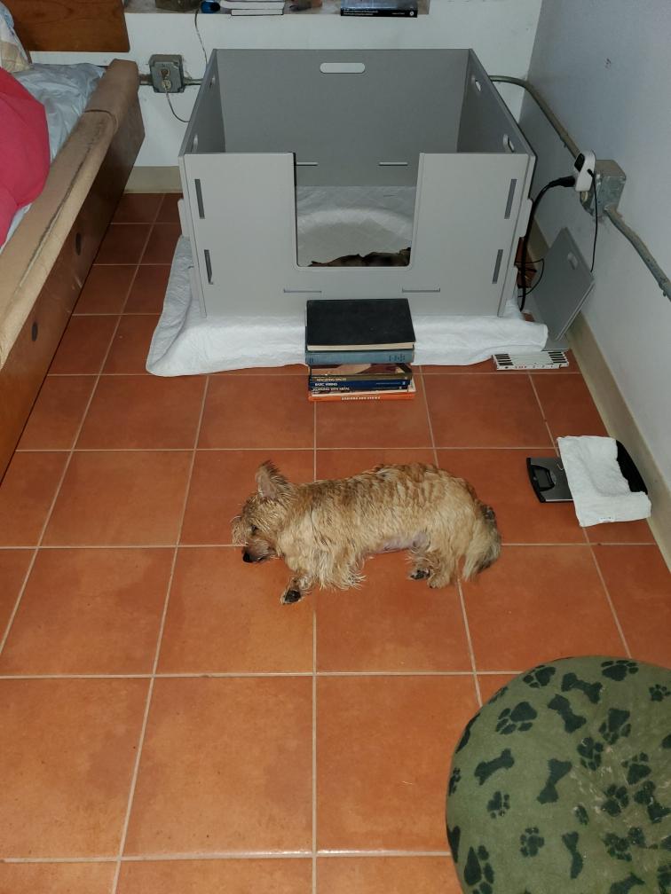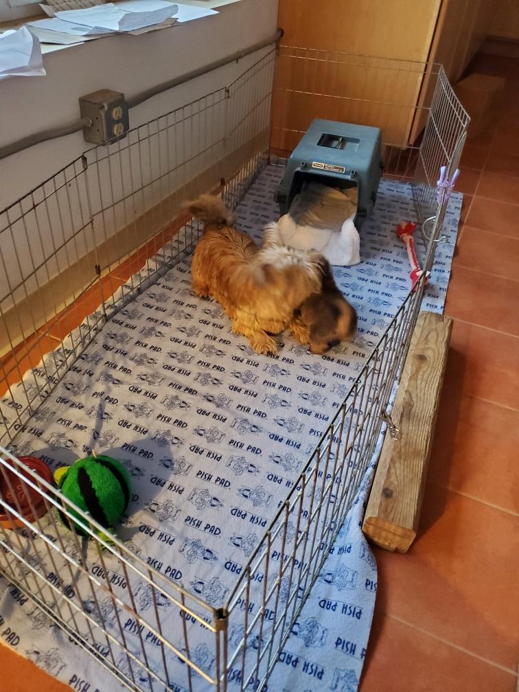 I finally had enough energy to build Chang's playpen in my living room. Siri got in the crate with Chang to assure him that it was a safe place. Later Chang crawled out of the crate to explore. But what Chang really wanted was to nurse. In the evening, I put Chang back in the whelping box for the night.