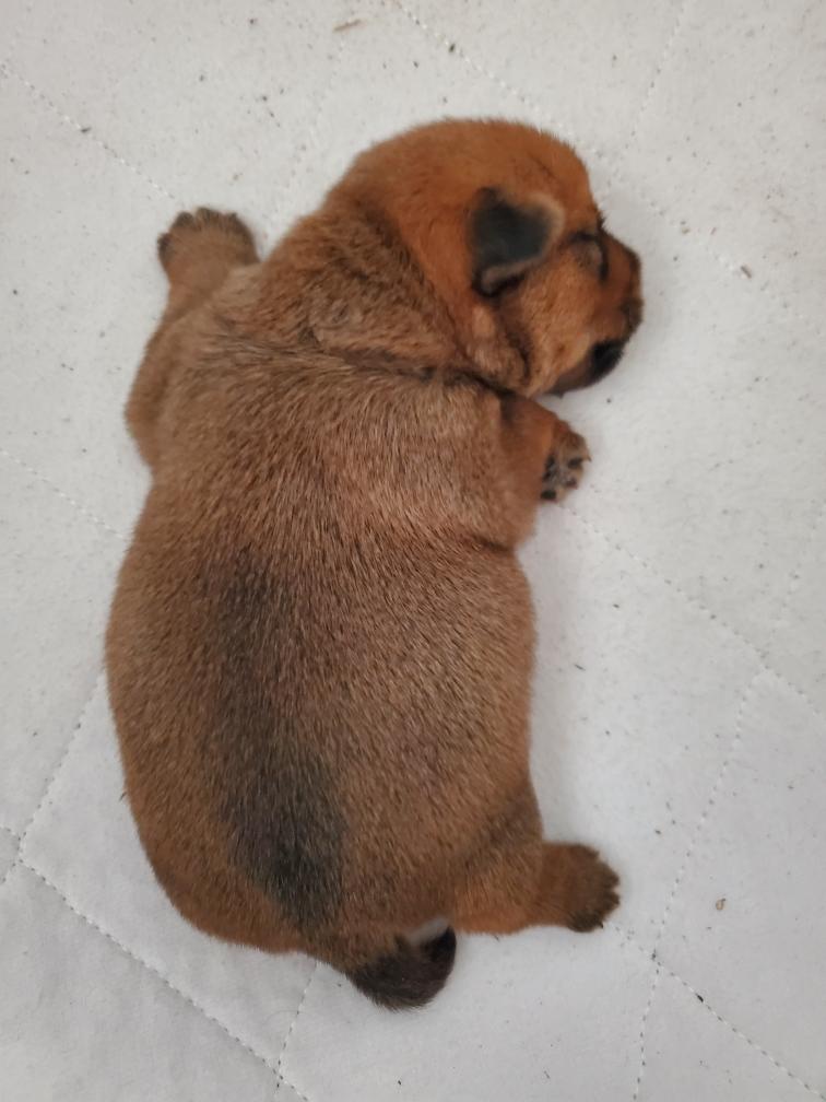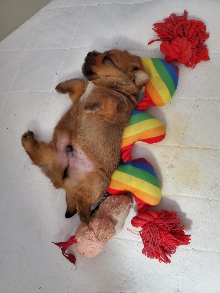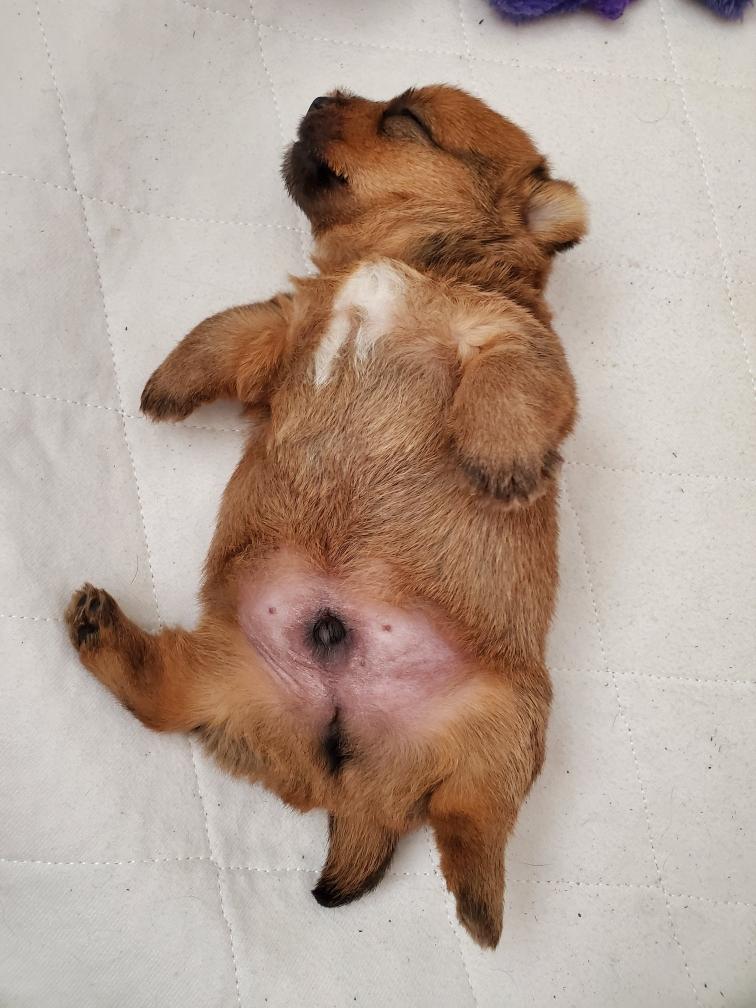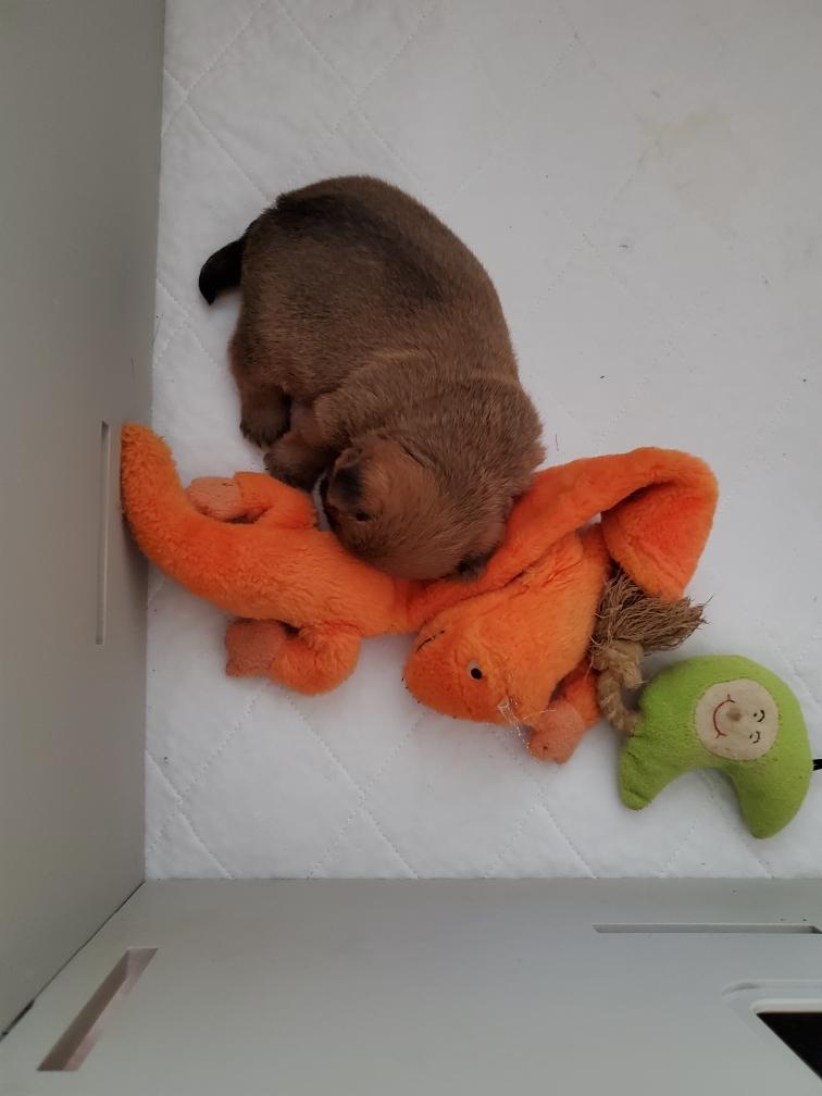 Chang sleeping on his back. And later sleeping on his back next to his toys. Note the stain to the right of the toys. Mommy Siri does a good job of keeping her puppy clean. But sometime Siri is not around when Chang has to pee. I change and wash the bedding in the whelping box every day.