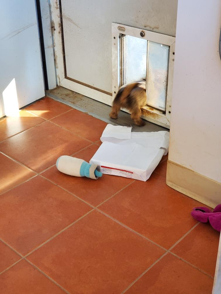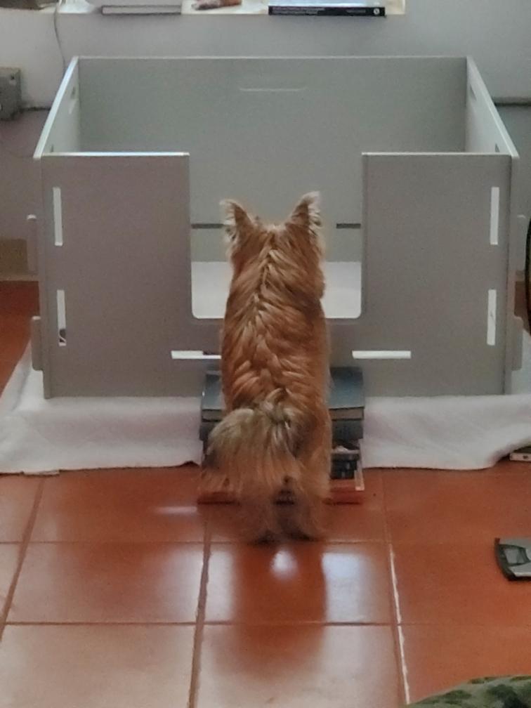 Siri guarding the approach to her puppy. I later picked up my postal scale which you can see in the picture.