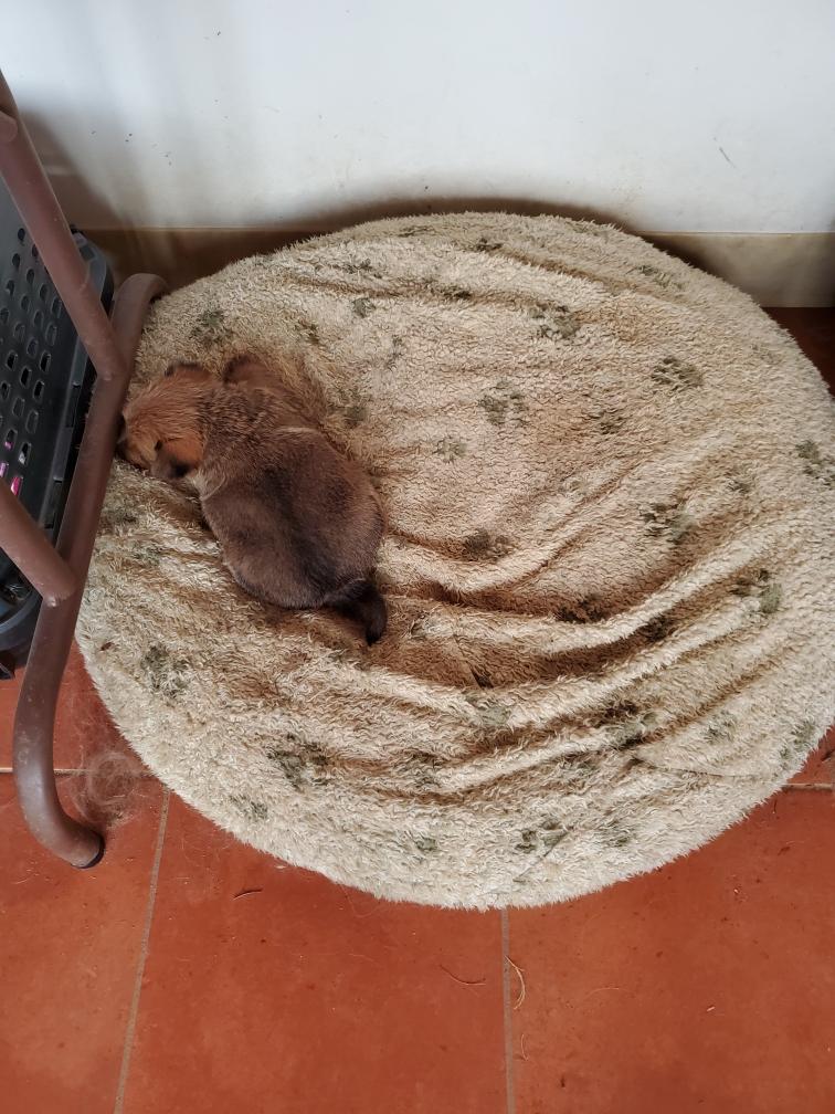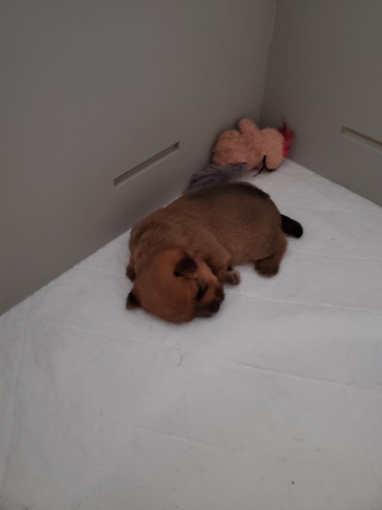 Chang again sleeping in the corner of the whelping box. I suspect that Chang is getting bored with the whelping box. Normally by now I would have set up a playpen in my living room for Chang for during the day. Instead today I let Chang come up and crawl around on my bed.