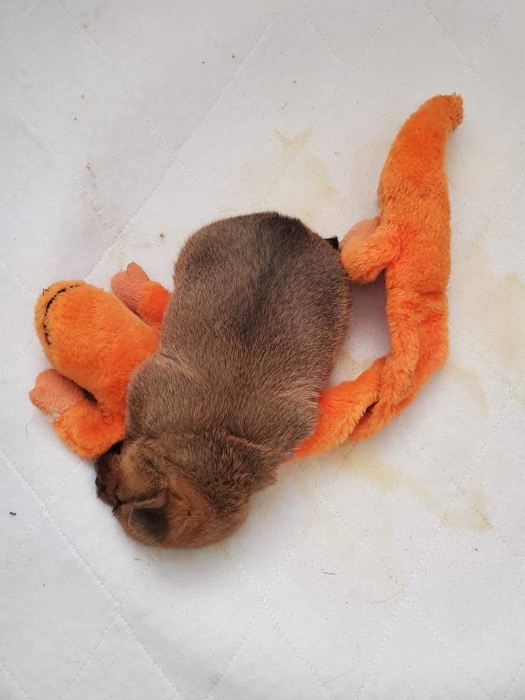 I put a plush toy in the whelping box with White. I did this mostly to give his eyes something to focus on during those rare moments when he wakes up and opens his eyes. White has never seemed very interested in sleeping next to something. I suspect the warmth of the whelping nest is all that he really wants.