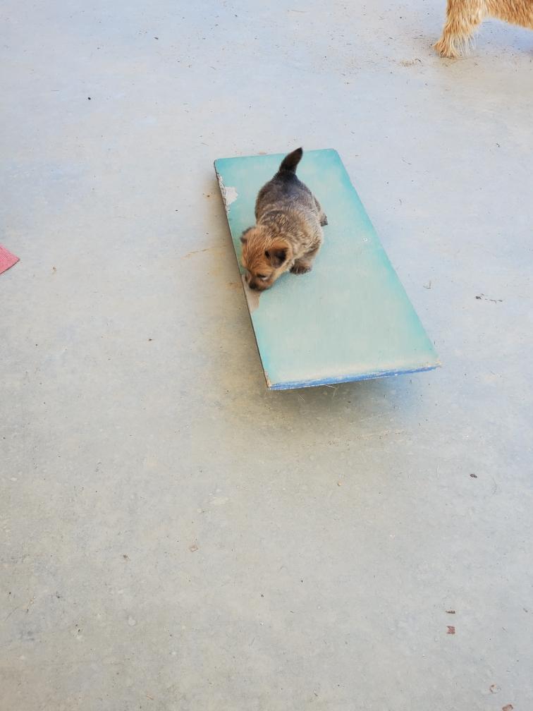 After (almost) conquering the baby dogwalk on my porch, today Chang showed that he can do my baby teeter. Chang also went into my baby tunnel, but after exploring a short way turned around and came back out.