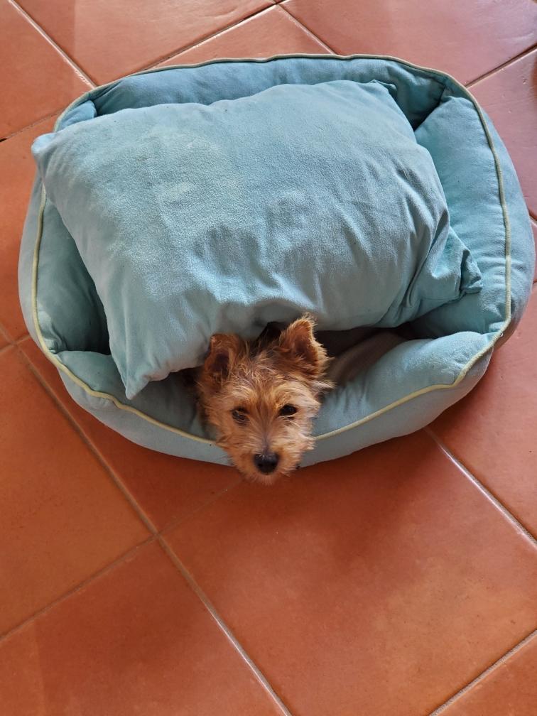 Chang sleeping on the dog bed underneath my desk.