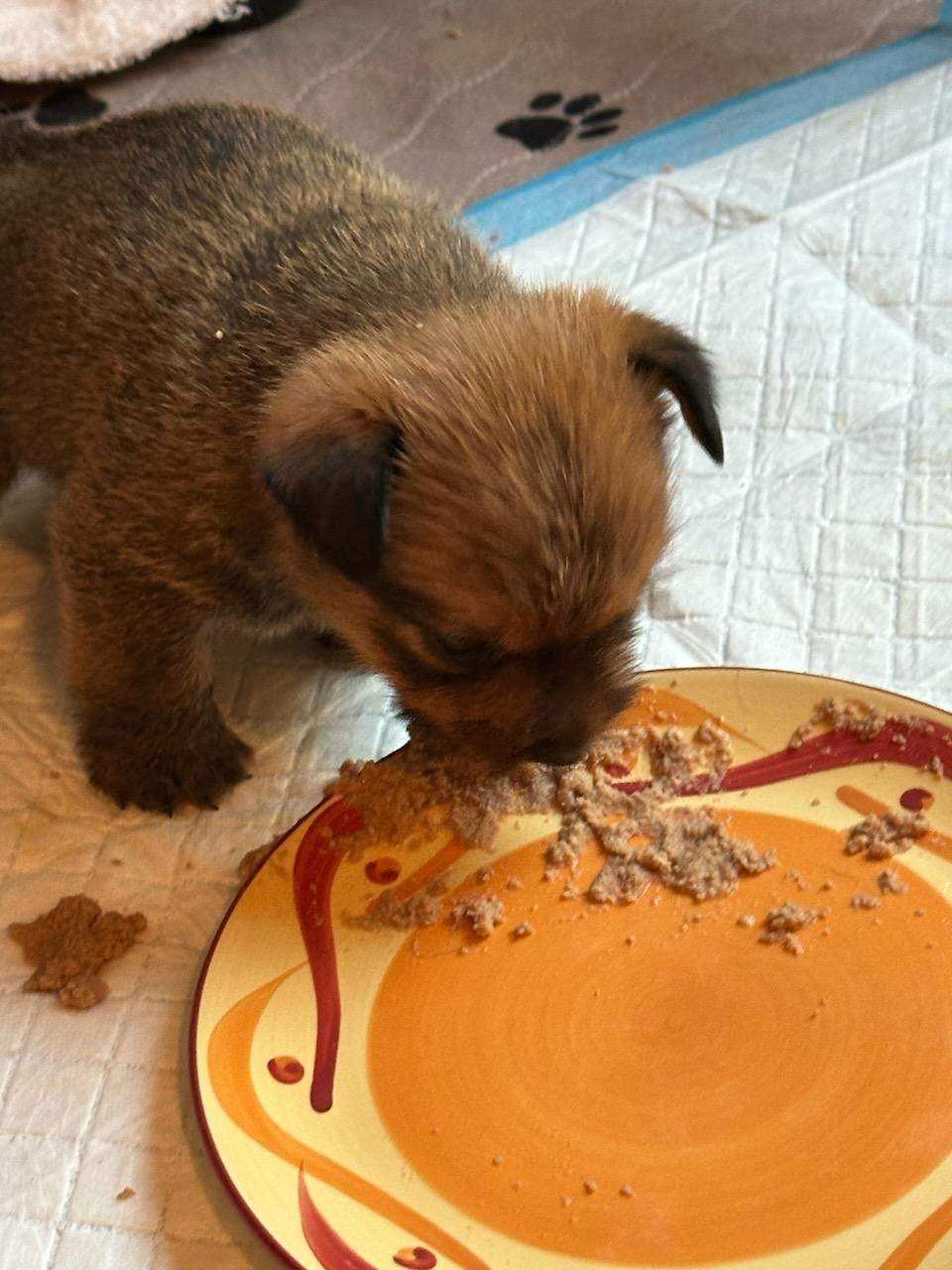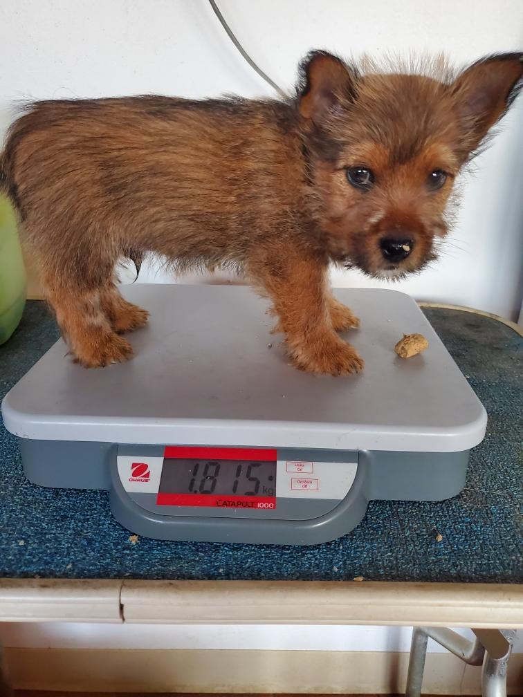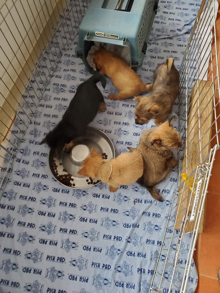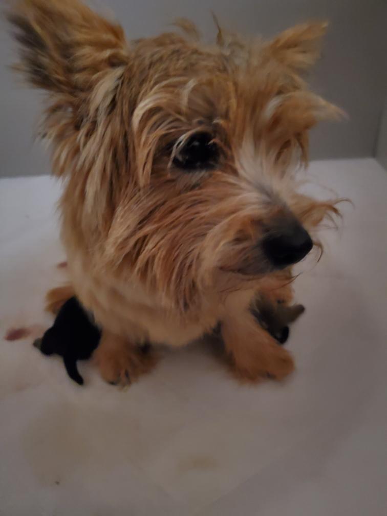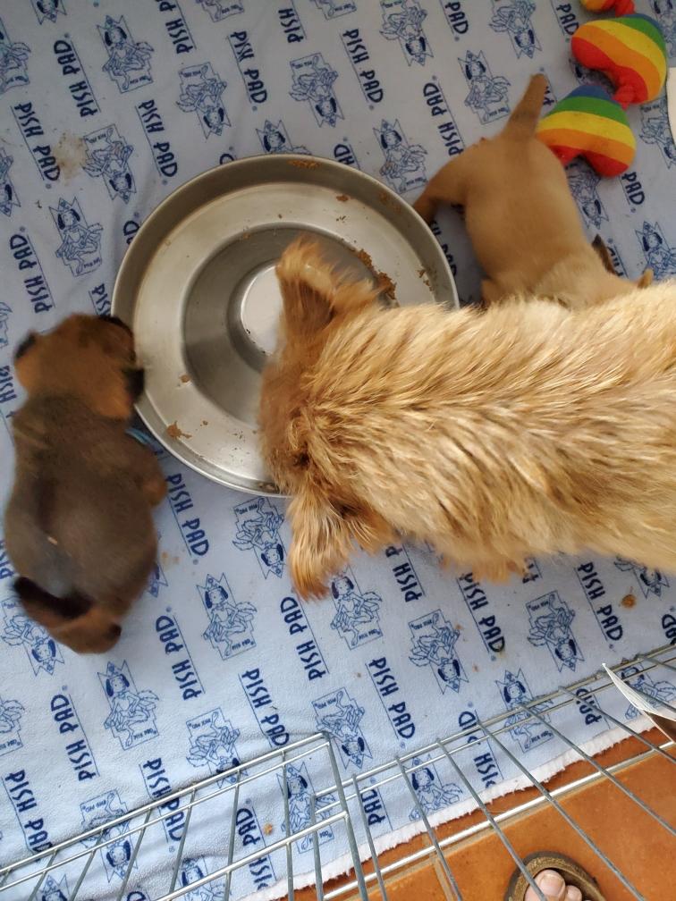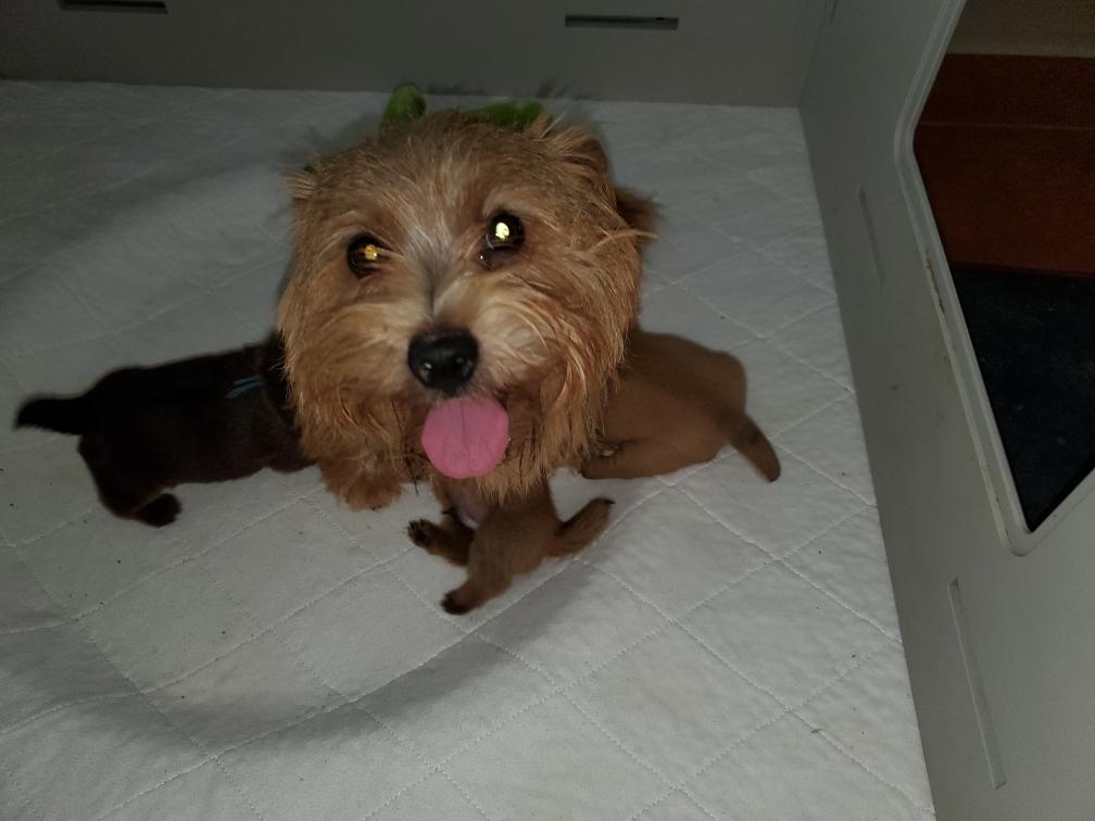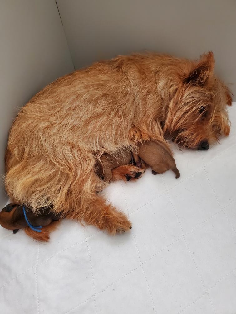 Gwynie greeted me when I got home. I needn't have worried, Gwynie had taken good care of her puppies. (Note Blue yawning and stretching.) When I later weighed Gwynie's puppies, everyone - including Pink - had very nice weight gains. Gwynie was more happy to see me than in eating dinner ... which given how much Norwich like food, says a lot!