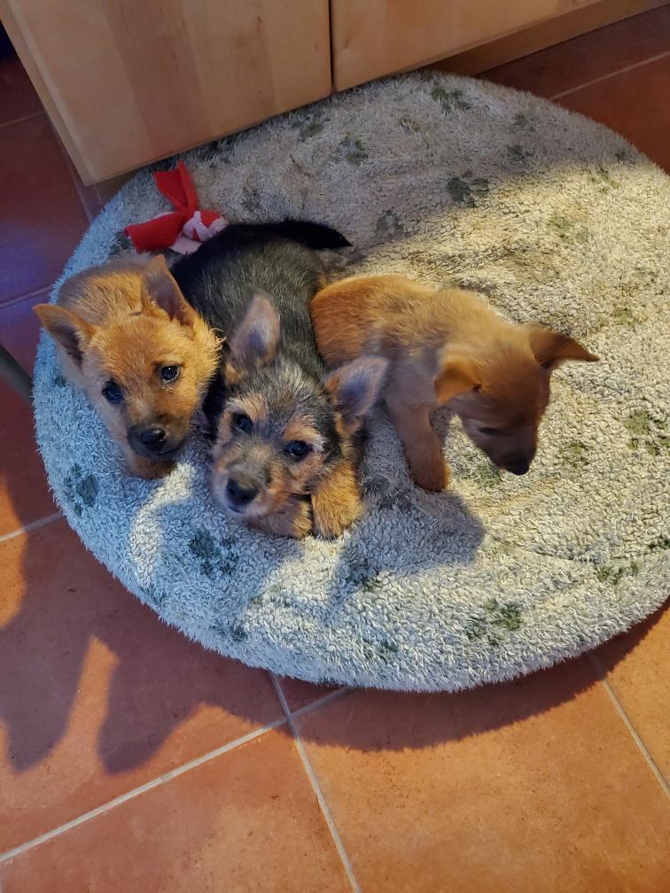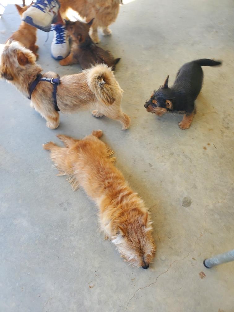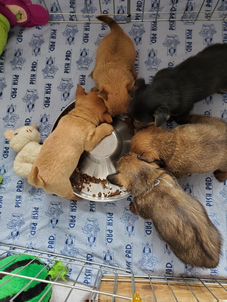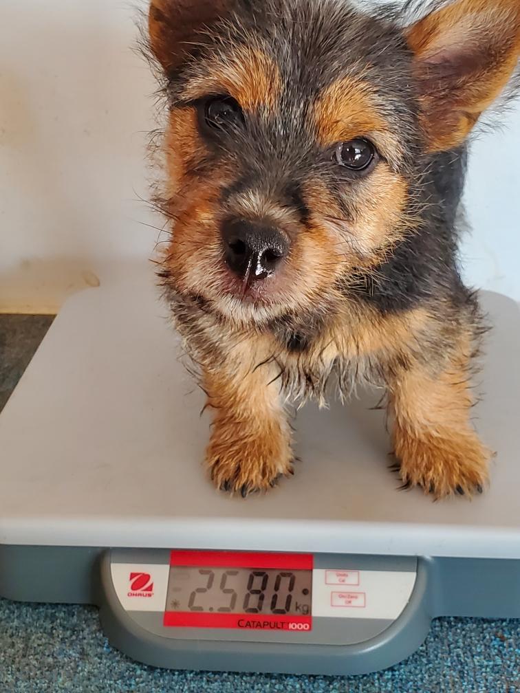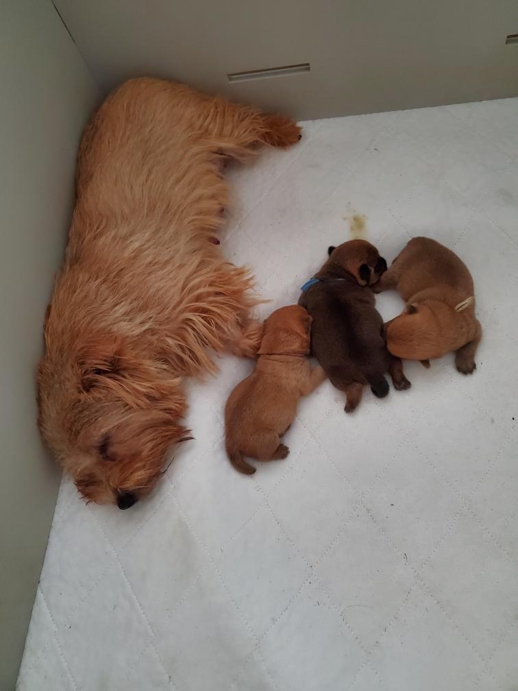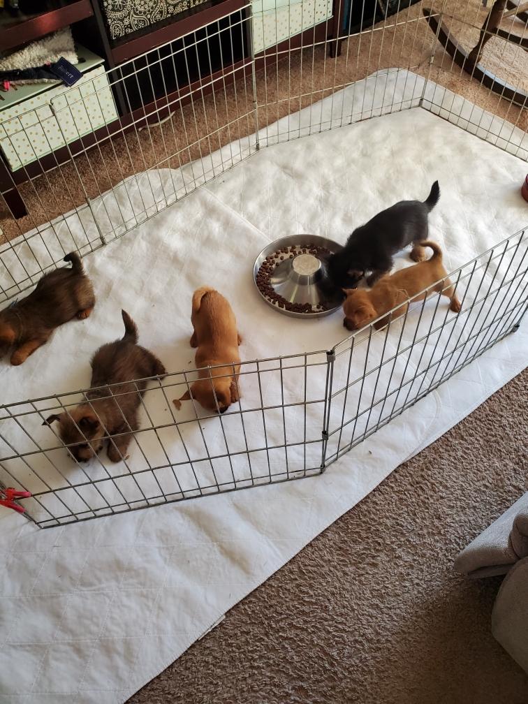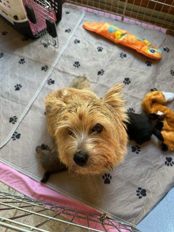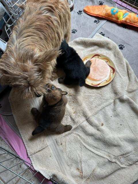 Gwynie greeted me when I got home. I needn't have worried, Gwynie had taken good care of her puppies. (Note Blue yawning and stretching.) When I later weighed Gwynie's puppies, everyone - including Pink - had very nice weight gains. Gwynie was more happy to see me than in eating dinner ... which given how much Norwich like food, says a lot!
