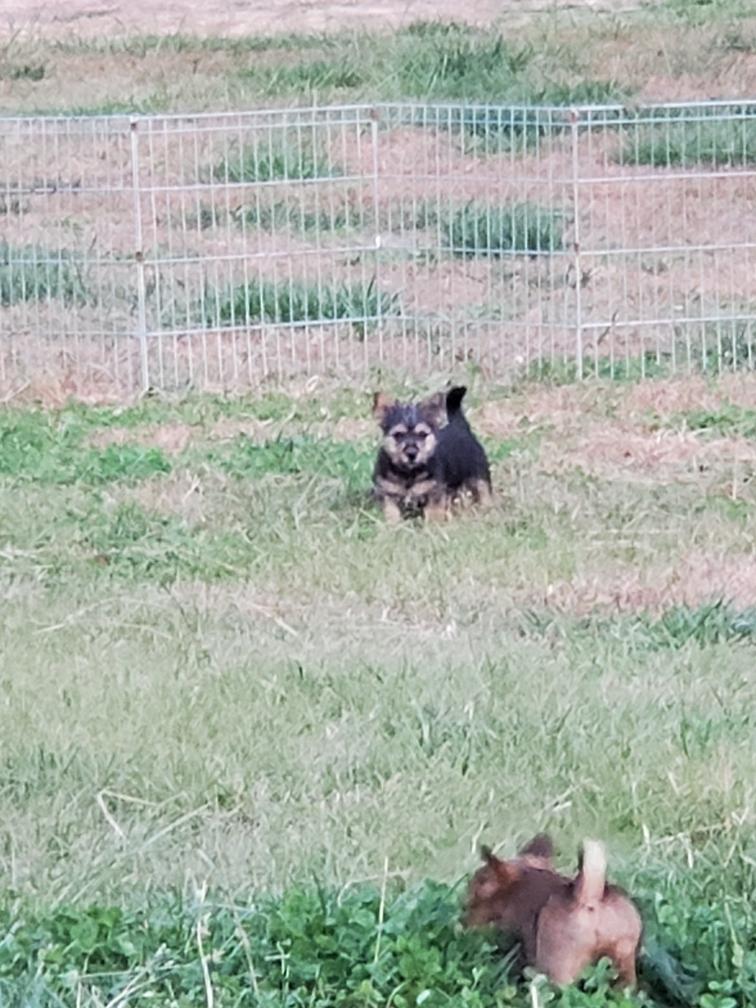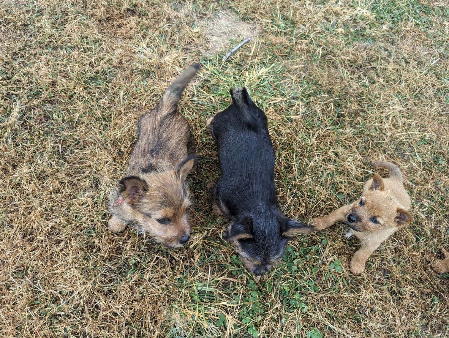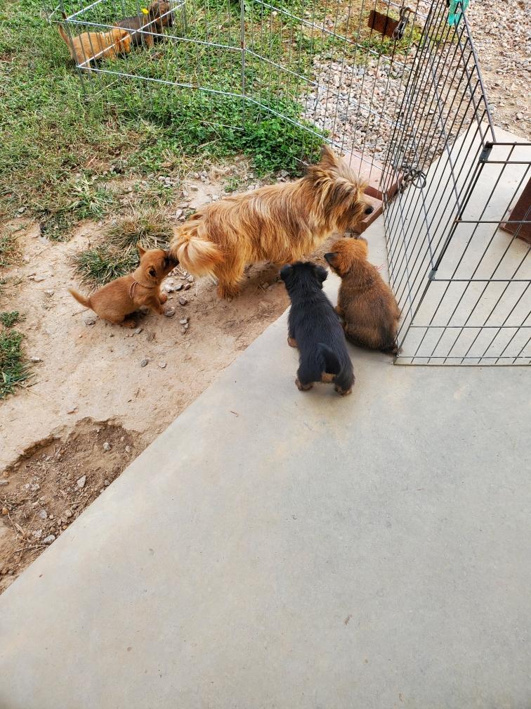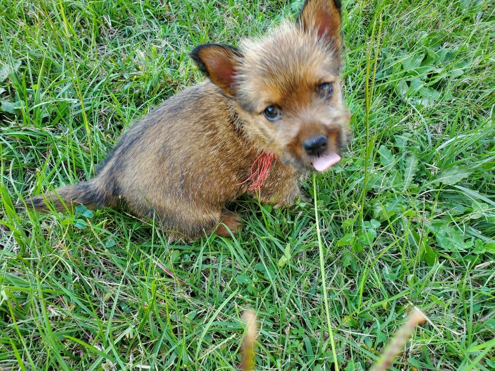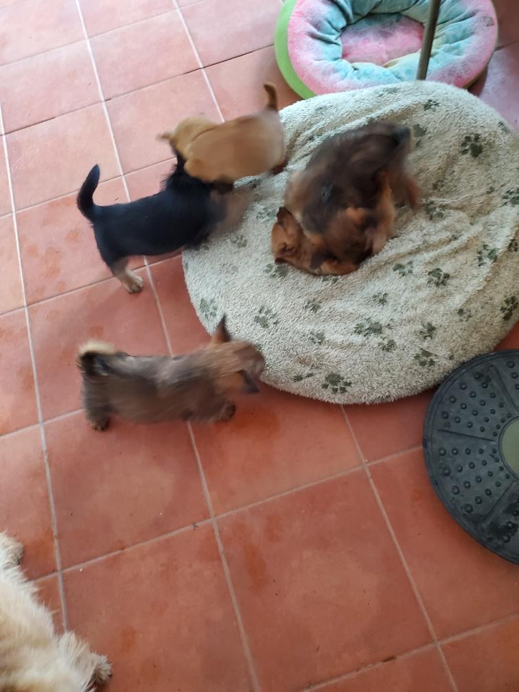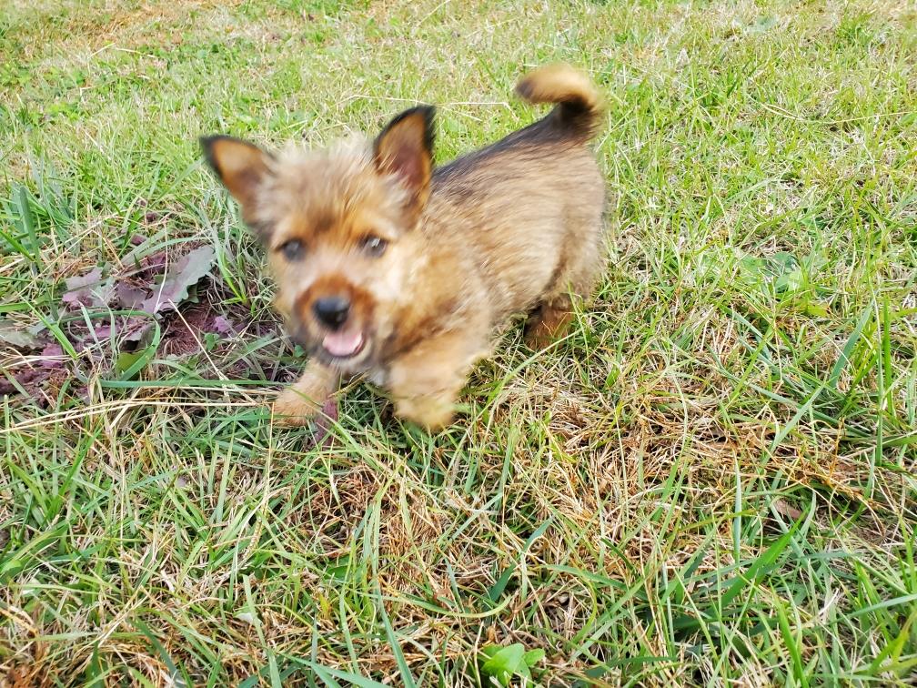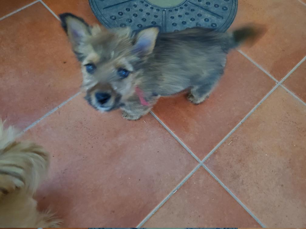 Gwynie greeted me when I got home. I needn't have worried, Gwynie had taken good care of her puppies. (Note Blue yawning and stretching.) When I later weighed Gwynie's puppies, everyone - including Pink - had very nice weight gains. Gwynie was more happy to see me than in eating dinner ... which given how much Norwich like food, says a lot!