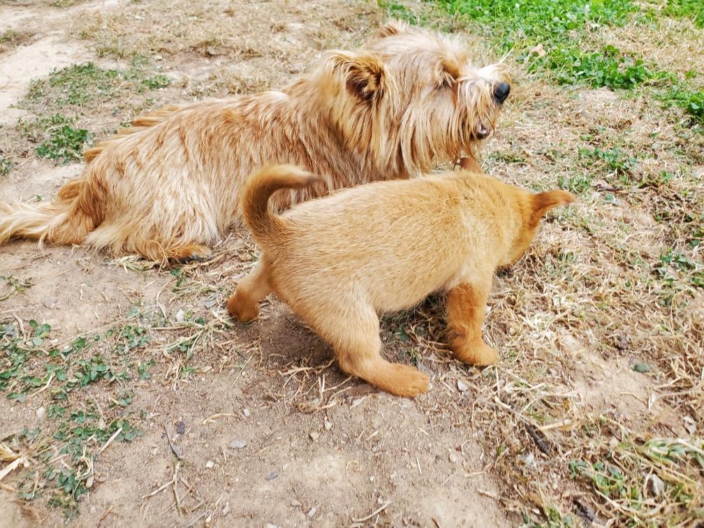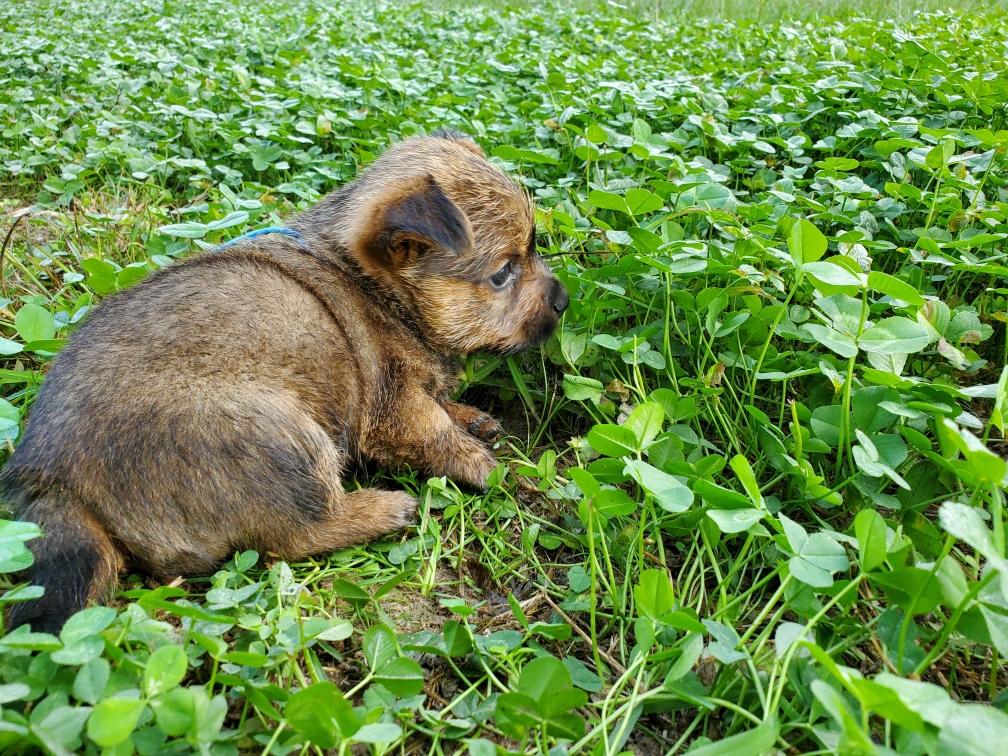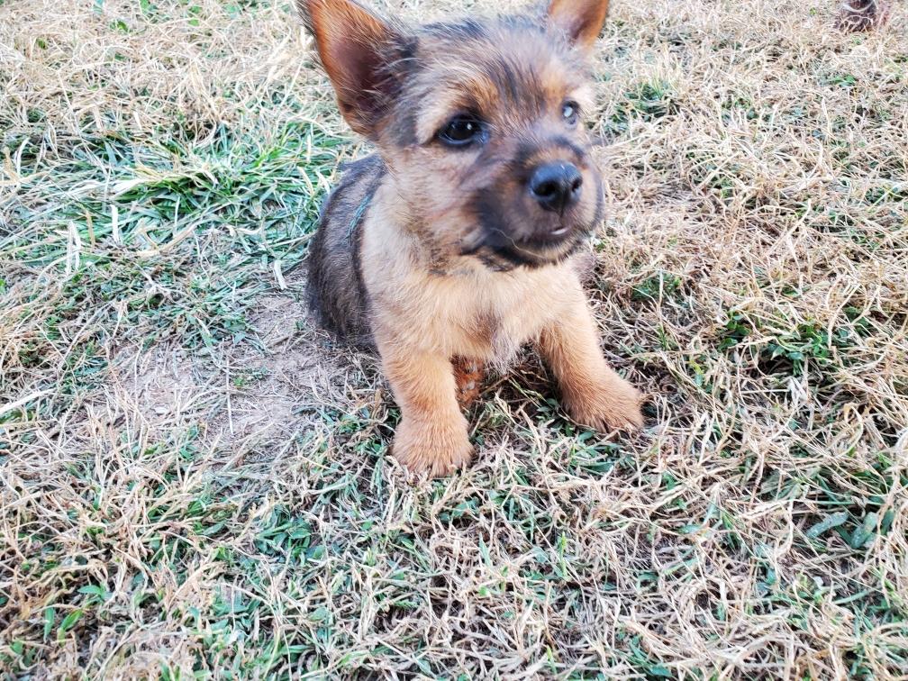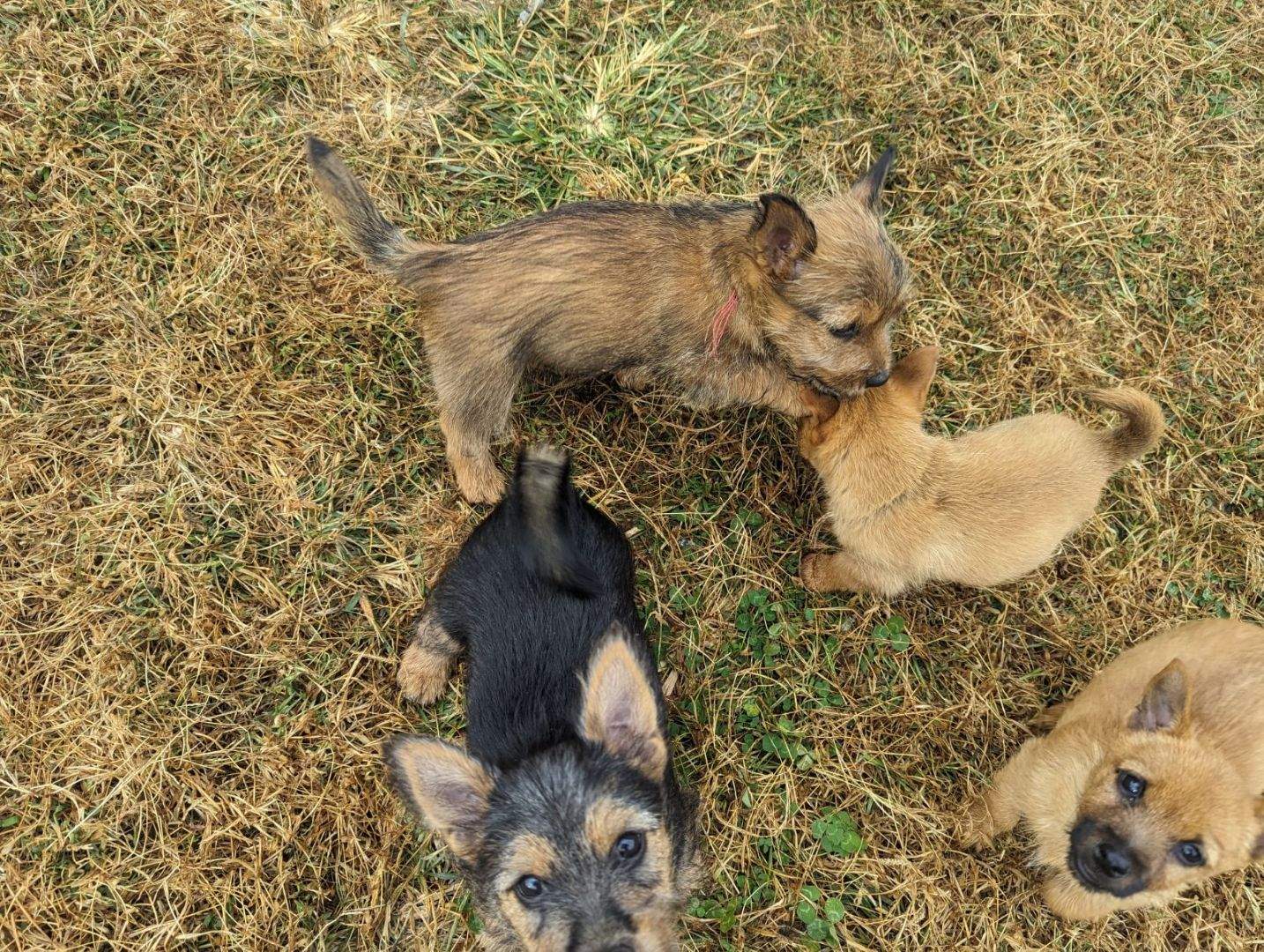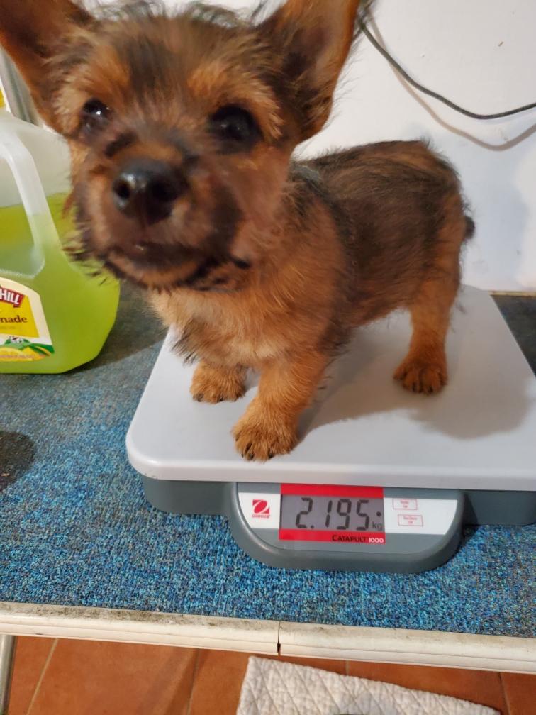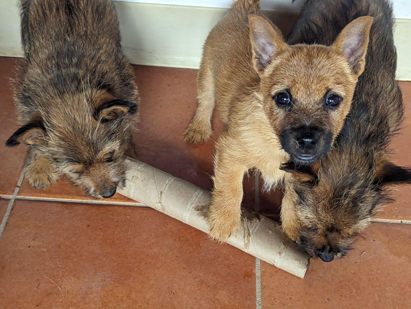 Gwynie greeted me when I got home. I needn't have worried, Gwynie had taken good care of her puppies. (Note Blue yawning and stretching.) When I later weighed Gwynie's puppies, everyone - including Pink - had very nice weight gains. Gwynie was more happy to see me than in eating dinner ... which given how much Norwich like food, says a lot!