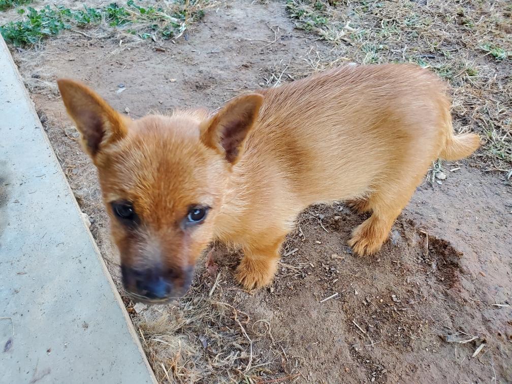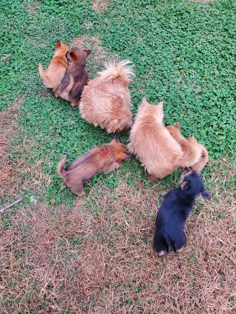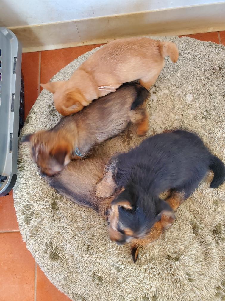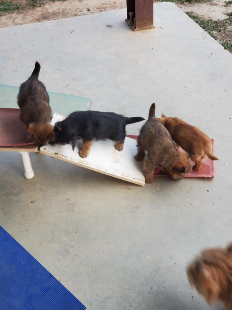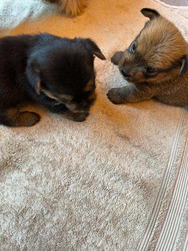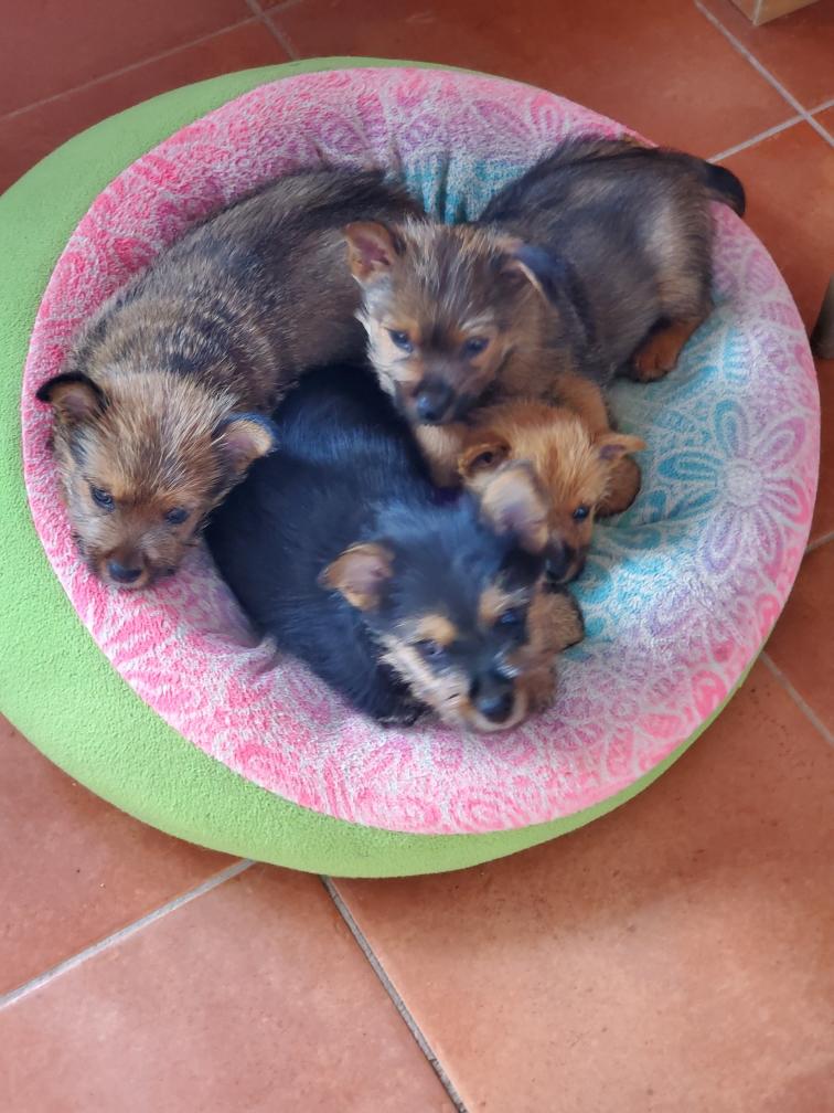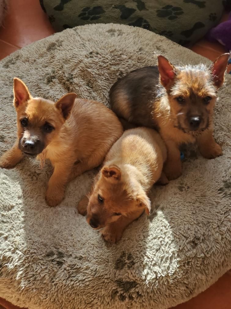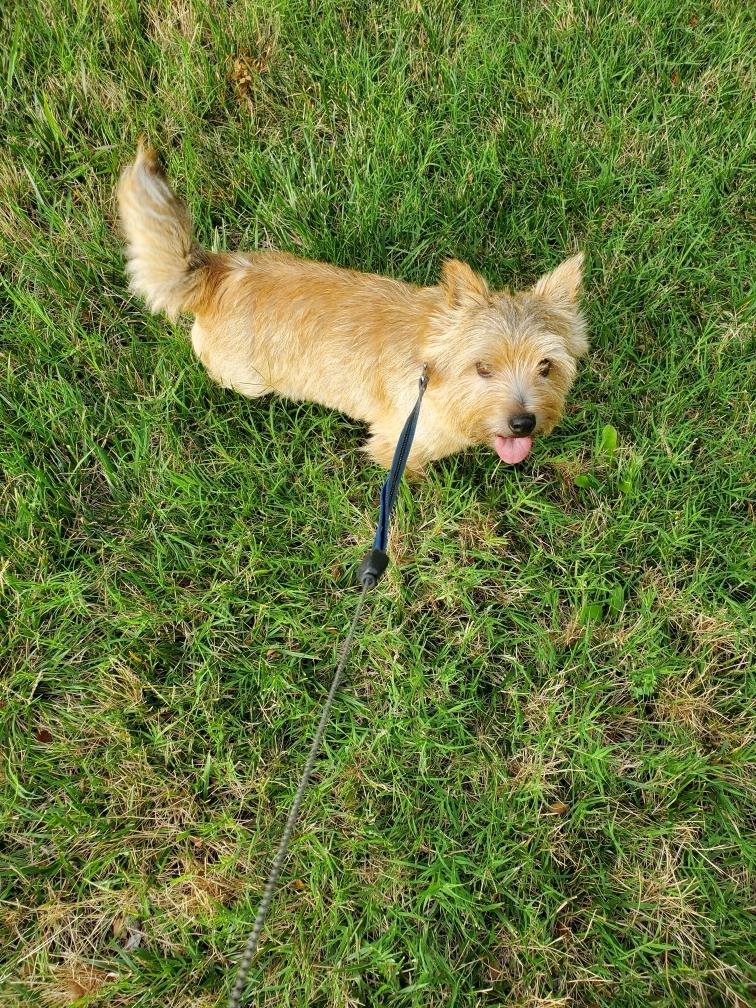 Gwynie greeted me when I got home. I needn't have worried, Gwynie had taken good care of her puppies. (Note Blue yawning and stretching.) When I later weighed Gwynie's puppies, everyone - including Pink - had very nice weight gains. Gwynie was more happy to see me than in eating dinner ... which given how much Norwich like food, says a lot!