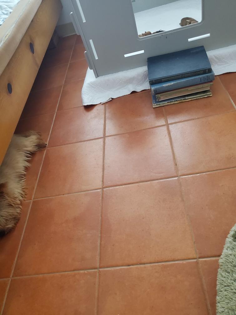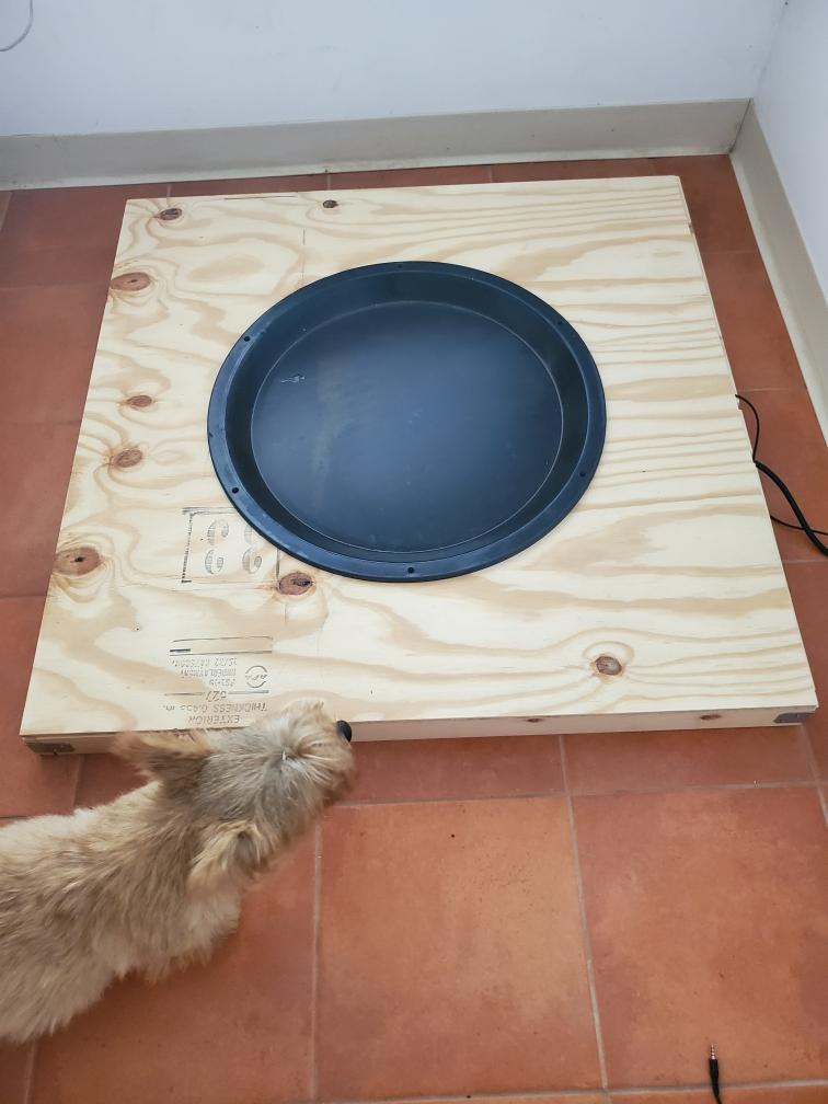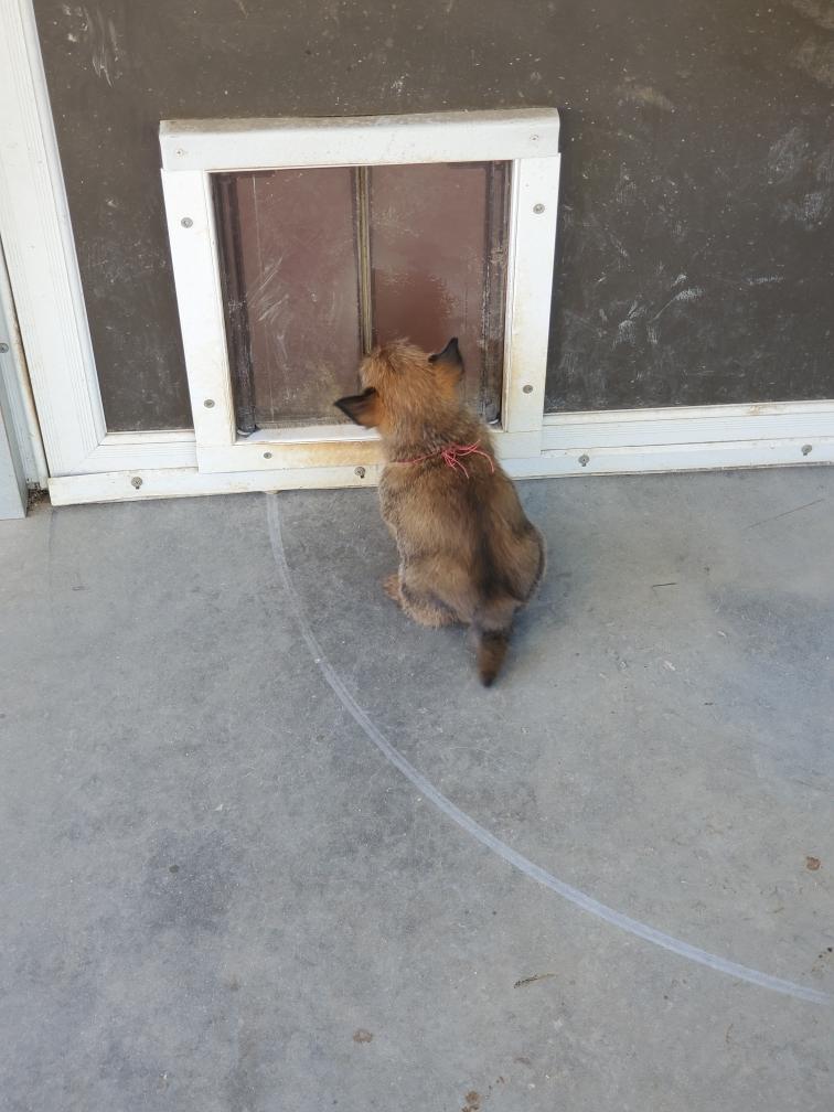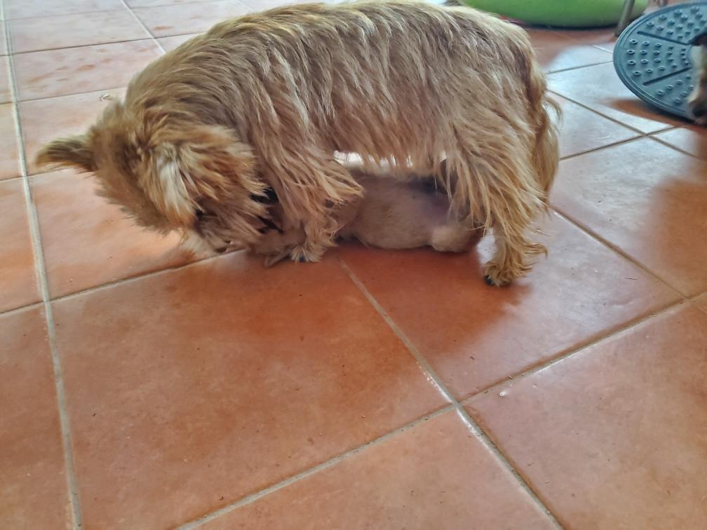 Unfortunately the surgery and anesthesia departments were busy, and we were asked to come back around 12:30 pm. Siri and I spent the rest of the morning visiting with nearby friends. While visiting, I noticed that Siri had gone into stage one labor. Siri was "nesting" - periods of furious "digging" plus trying to wedge herself into the safest places she could find (mostly underneath furniture).